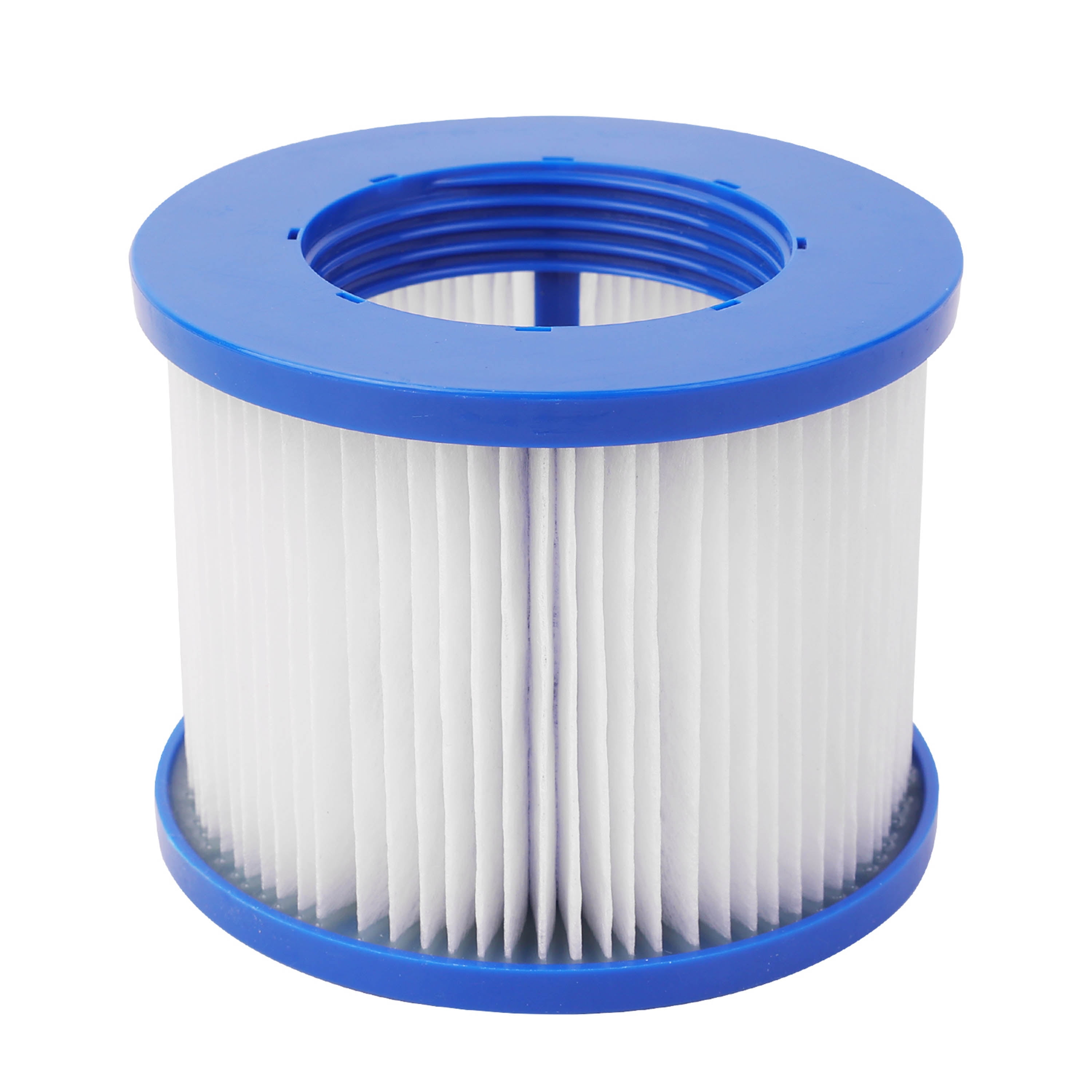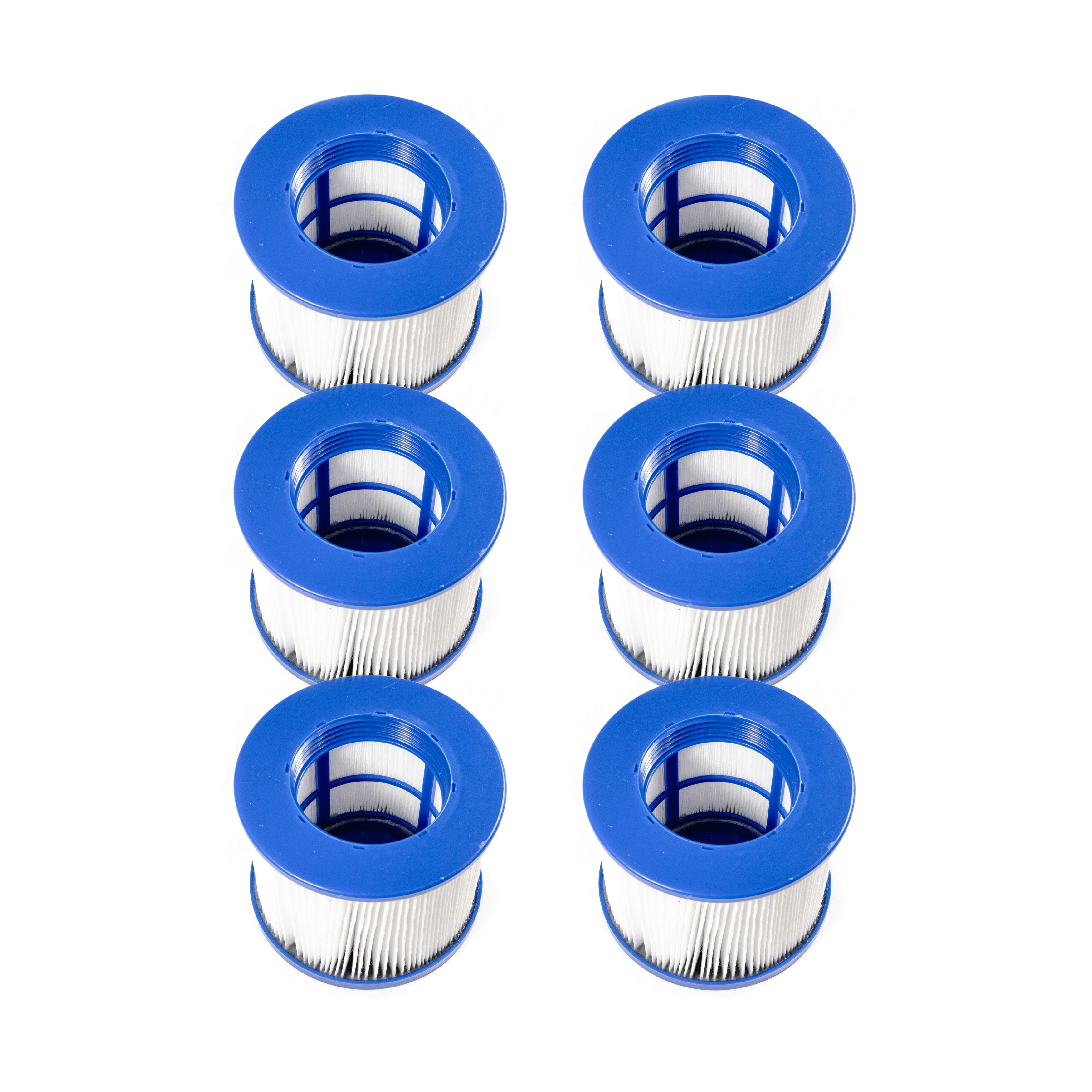 This water filter cartridge keeps spa water clean and heightens your inflatable hot tub performance; hot tub sold separately Traps additional dirt and particles within its filter paper Lot of 6 Hot Tub Filters Easy to replace; changing the filter once per month is recommended Clean the filter every 120 hours with an overnight soak Material: Paper and plastic Dimensions: 4 x 4 x 4 inches Color: Blue