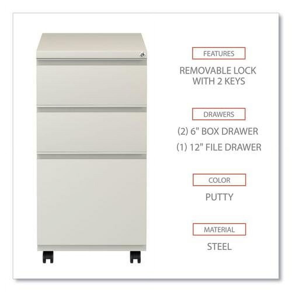 File Pedestal with Full-Length Pull, Left or Right, 3-Drawers: Box/Box/File, Legal/Letter, Putty, 14.96″ x 19.29″ x 27.75″ Get organized with a high-sided file cabinet with drawers that accommodate letter or legal-sized hanging files. Steel ball bearing telescoping slide suspension helps drawers glide smoothly and with ease. The counterweight prevents tipping. Equipped with four casters, two locking, two non-locking. Full-length pull permits easy opening. Single key core removable lock with two keys. Durable powder coated finish helps prevent scratches. Full-length, recessed pull permits easy opening. Four casters (two locking) for mobility or four glides for stationary use. High-sided file drawer accommodates letter/legal filing. Counterweight prevents tipping. – Anti-Tip Mechanism: Counterweight – Base Material: Steel – Color: Putty – Global Product Type: Vertical Desk Pedestals – Number of Drawers: 3 – Overall Depth: 19.29″ – Overall Height: 27.75″ – Overall Width: 14.96″ – Top Material: Steel – Document Size Accommodation: Legal, Letter – Special Features: Box/Box/File Format-Two 6″ high box drawers and one 12″ high file drawer. – Drawer Configuration: Box/Box/File – Drawer Height-File Drawer: 12″ – Pedestal Count: 1 – Pedestal Types: Freestanding: Full-Height – Drawer Height-Box Drawer: 6″ – Compliance Standards: Meets or Exceeds ANSI/BIFMA Standards – Color Family: Beige – Height Without Casters: 26.38″ – Anti-Tip Mechanism Indicator: Yes – Pedestal Sub-Type Indicator: Yes – Caster Indicator: Yes – Glide/Feet Indicator: No – Pedestal Orientation: Left/Right – Caster Details: Two Locking Swivel Casters, Two Non-Locking Swivel Casters – Product Biodegradability in Days: 0