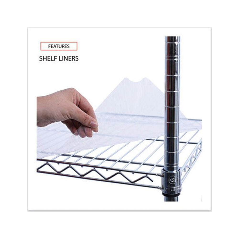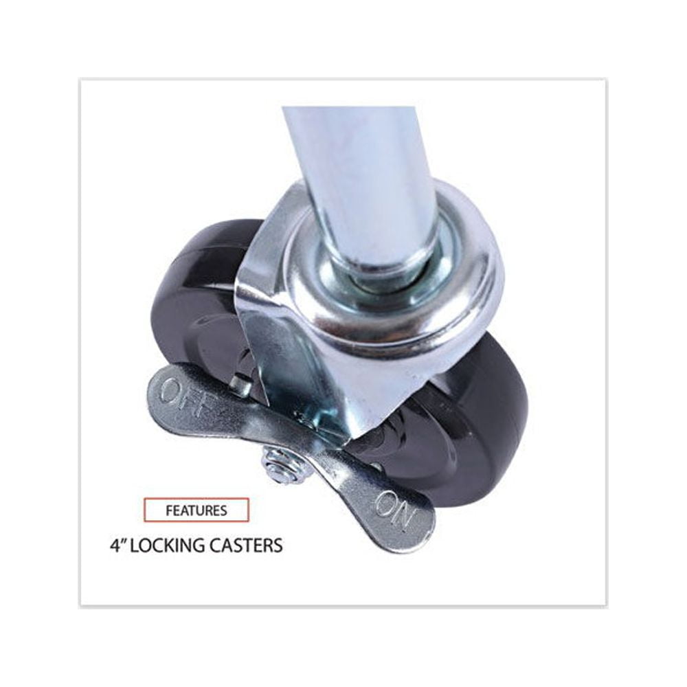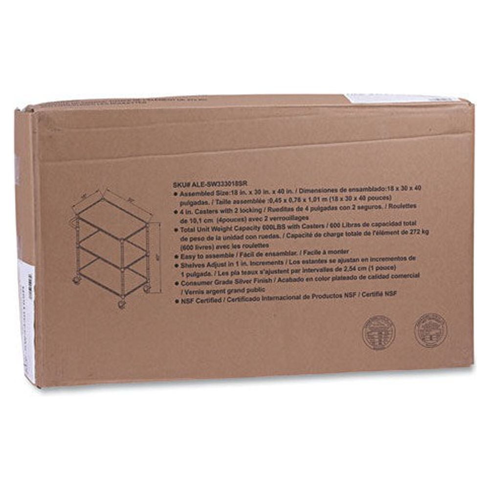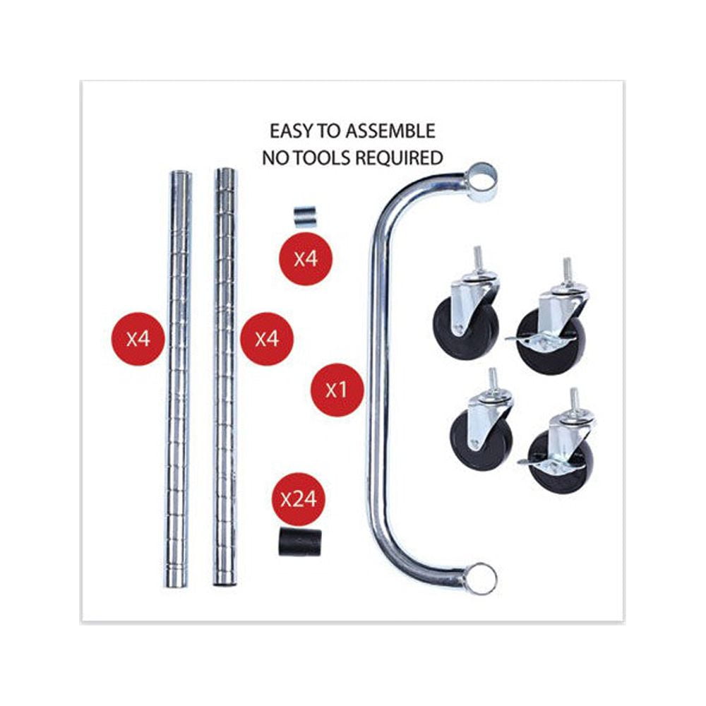 Three adjustable shelves with pull handle. Includes three shelf liners, four 35″ poles and four casters (two locking). Shelves adjust in 1″ increments. Includes three shelf liners and four casters (two locking) for mobility. 500 lbs. total weight capacity on casters. Easy to assemble — no tools required. Color: Silver; Color Family: Silver; Capacity (Weight): 600 lbs; Caster/Glide/Wheel: Four 4″ Locking Casters. Compliance Standards: Meets or Exceeds ANSI/BIFMA Standards. Warranty: Manufacturer’s limited five-year warranty. Post-Consumer Recycled Content Percent: 0%. Pre-Consumer Recycled Content Percent: 0%. Package includes: (4) Posts; (4) 4″ Casters; (3) Polypropylene Liners.