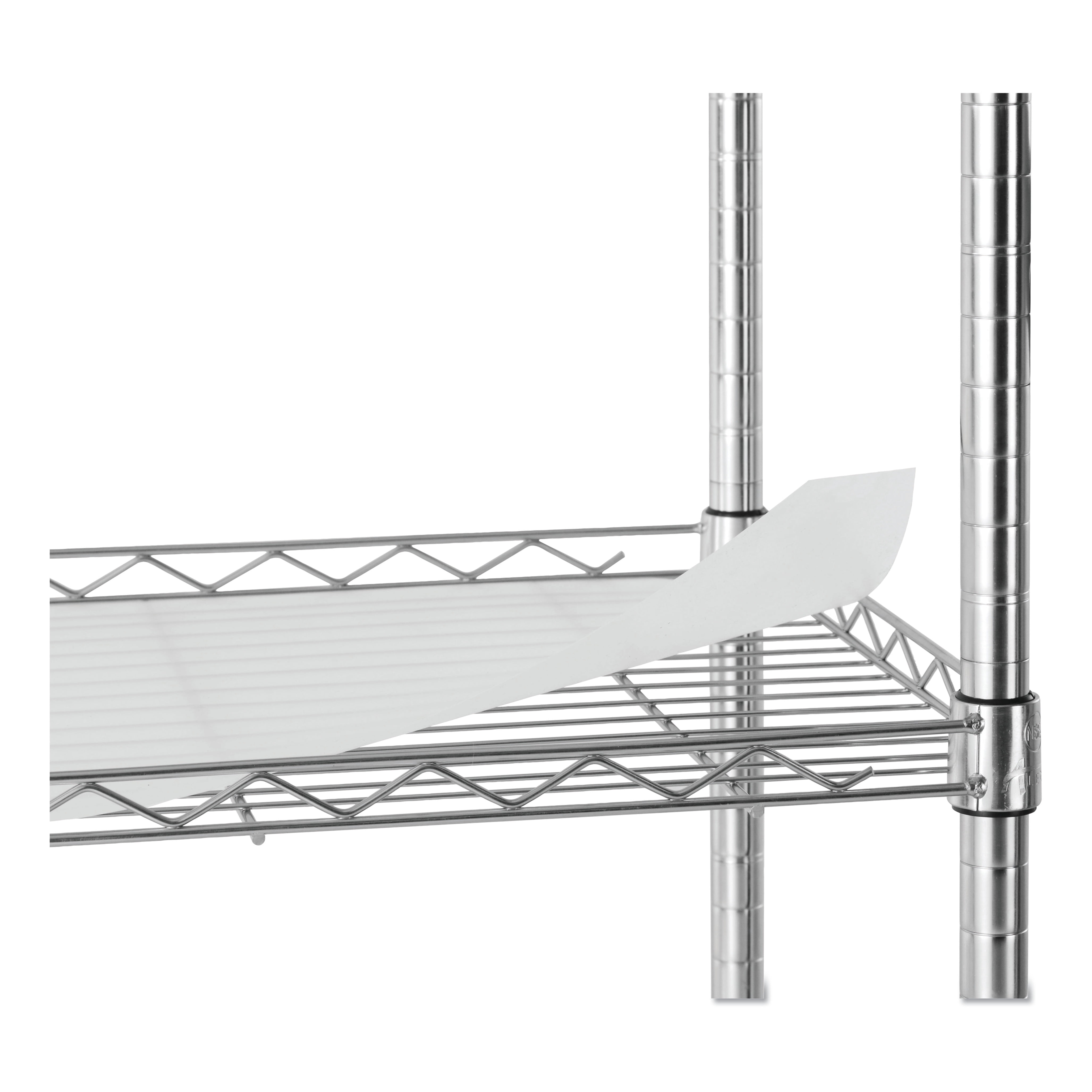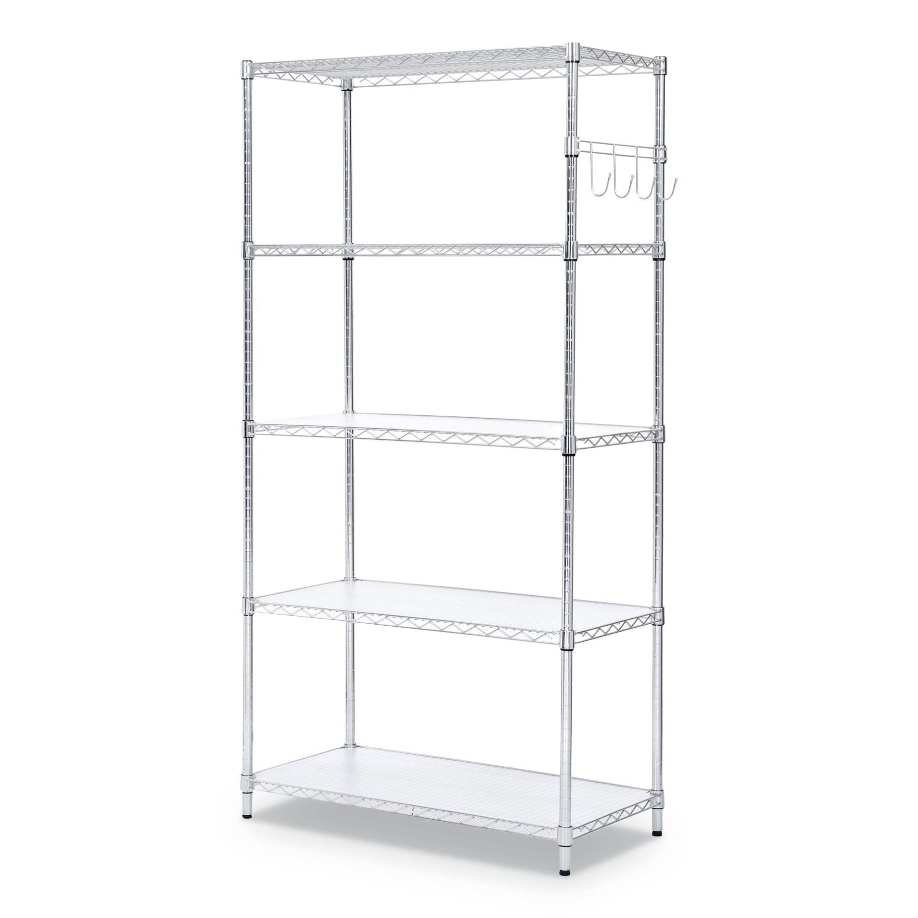 Ideal storage solution for commercial use. Alera’s snap-together design assembles in minutes. Strong welded wire construction provides exceptional strength and stability. Open design allows air circulation and reduces dust build-up. Includes five shelves, posts, shelf clips, shelf liners, casters, hooks and leveling glides (if used without casters). Up to 600 lbs per shelf (evenly distributed) when used without casters. Casters (two locking) provide mobility and can be omitted to increase weight capacity of unit. Capacity (Weight): 3,000 lbs; Color: Silver; Color Family: Silver; Material(s): Steel; Overall Depth: 18″; Overall Height: 72″; Overall Width: 36″; Shelf Capacity (Weight): 600 lbs; Shelf Count: 5; Shelf Depth: 18″; Shelf Thickness: 1″ Compliance Standards: Meets or Exceeds ANSI/BIFMA Standards. Warranty: Manufacturer’s limited five-year warranty. Post-Consumer Recycled Content Percent: 0%. Pre-Consumer Recycled Content Percent: 0%.