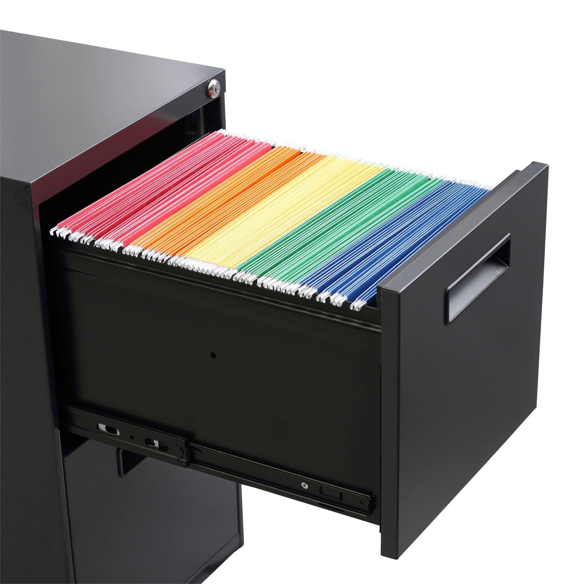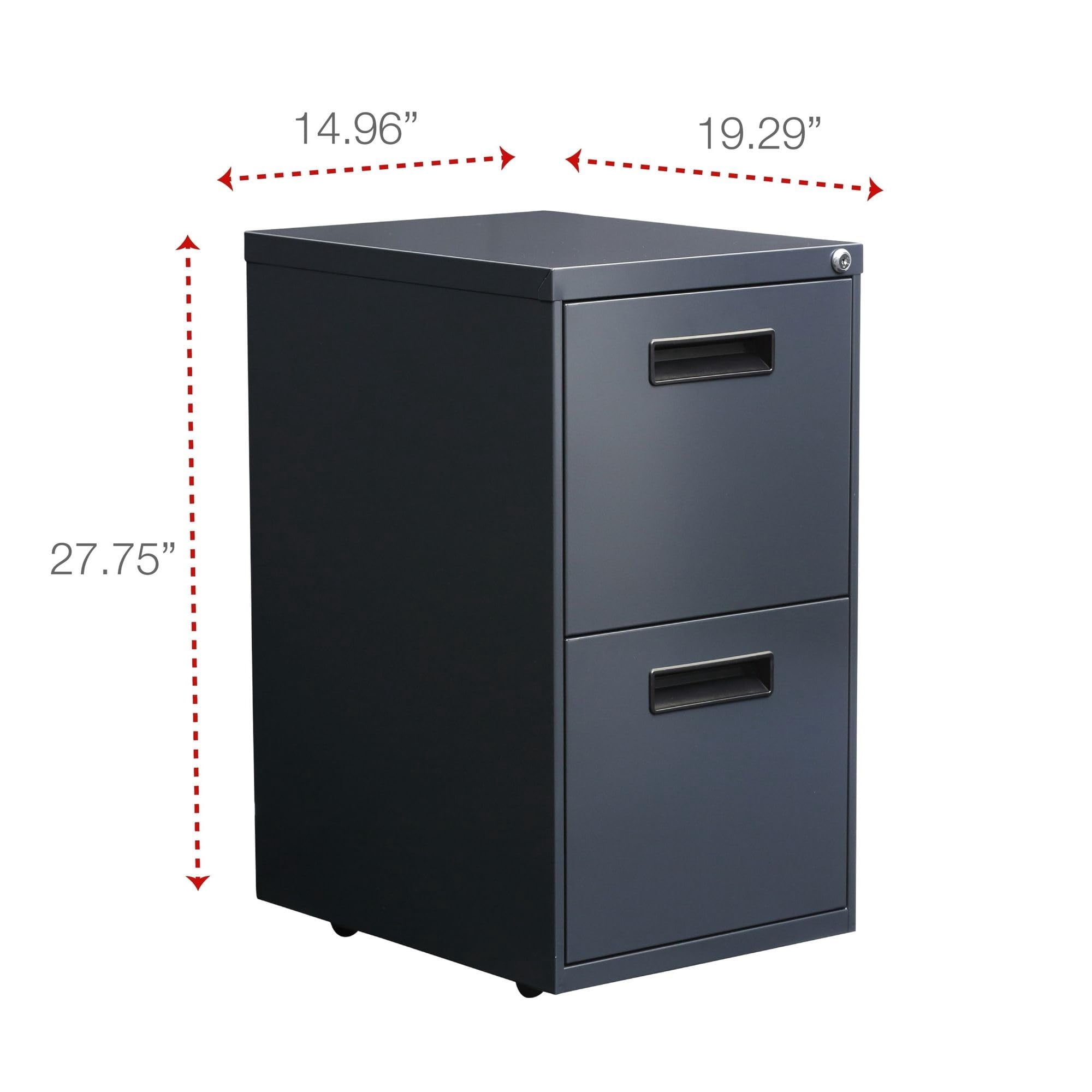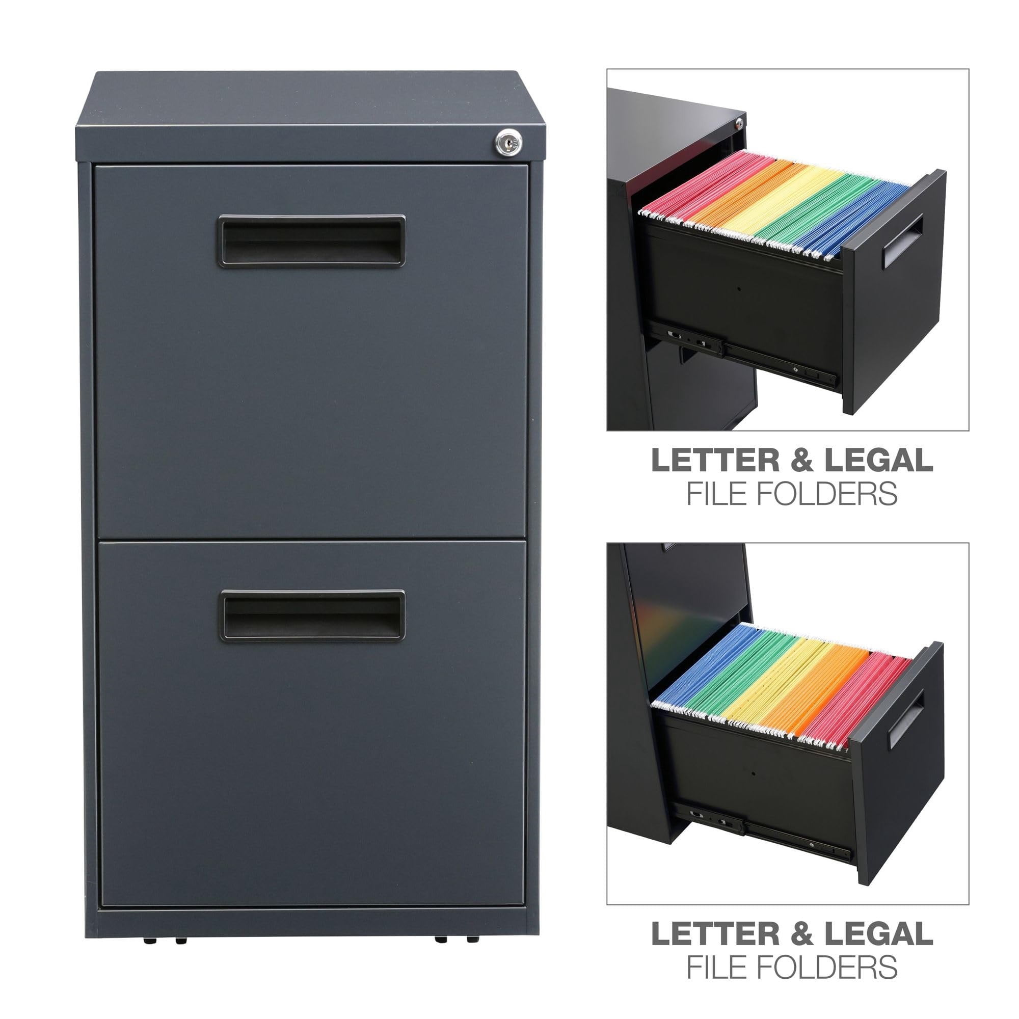 Get organized with a high-sided file cabinet with drawers that accommodate letter or legal-size filing. The counterweight prevents tipping. Visible, easy-access casters, 2 locking, 2 non-locking. Steel ball bearing slide suspension helps drawers glide smoothly and with ease. Built with 3/4 in. Extension on box drawers and full-length extension on file drawers for maximum accessibility. Full-length pull permits easy opening. Box drawers include one divider and pencil tray.
