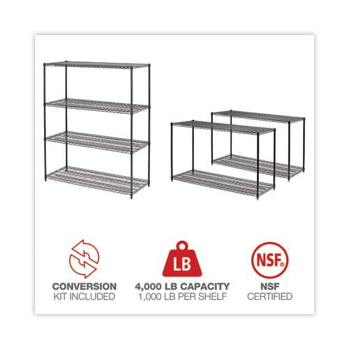 Universal storage solution that’s ideal for industrial, foodservice, medical industry, and all other storage needs Long-lasting, industrial grade finish resists corrosion in even the harshest environment Heavy-duty shelves withstand constant re-stocking Can be used in freezer applications and with an open design that allows for air circulation Snap-together design assembles in minutes without tools Can be set up as a four-tier single rack or as two two-tier racks to meet specific needs Shelves adjust in 1 in. increments NSF certified for wet and dry usage