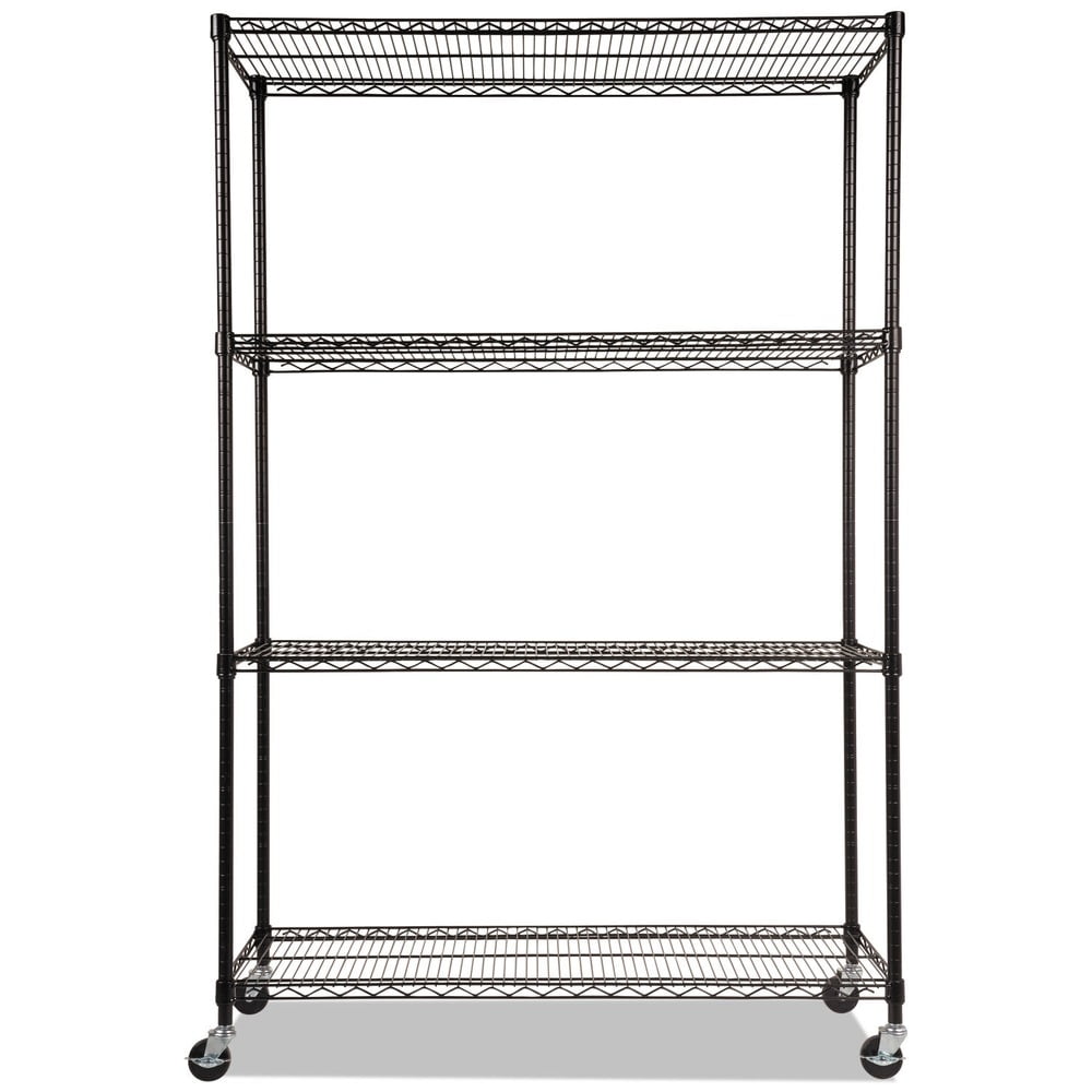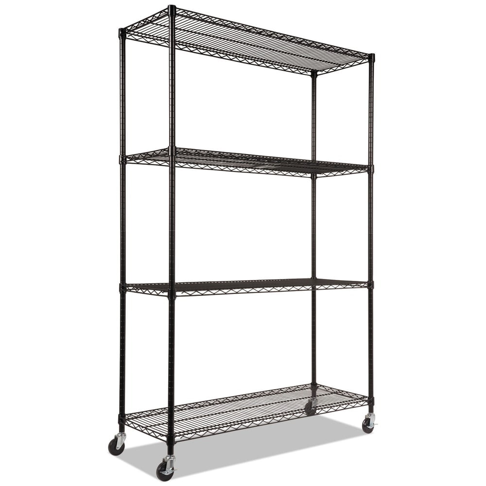 Alera Complete Wire Shelving Unit w/Caster, Four-Shelf, Black.• Ideal storage solution for commercial use.• Snap-together design assembles in minutes.• Strong welded wire construction provides exceptional strength and stability.• Open design allows air circulation and reduces dust build-up.• Finish on surface prevents corrosion in wet, humid environments.• Safeguards for freezer, restaurant, food service, indoor/outdoor, or other wet/dry storage requirements.• Rolls with ease on four casters (two locking).• 48 x 18 x 72.• Black.• Sold as 1 Each.
