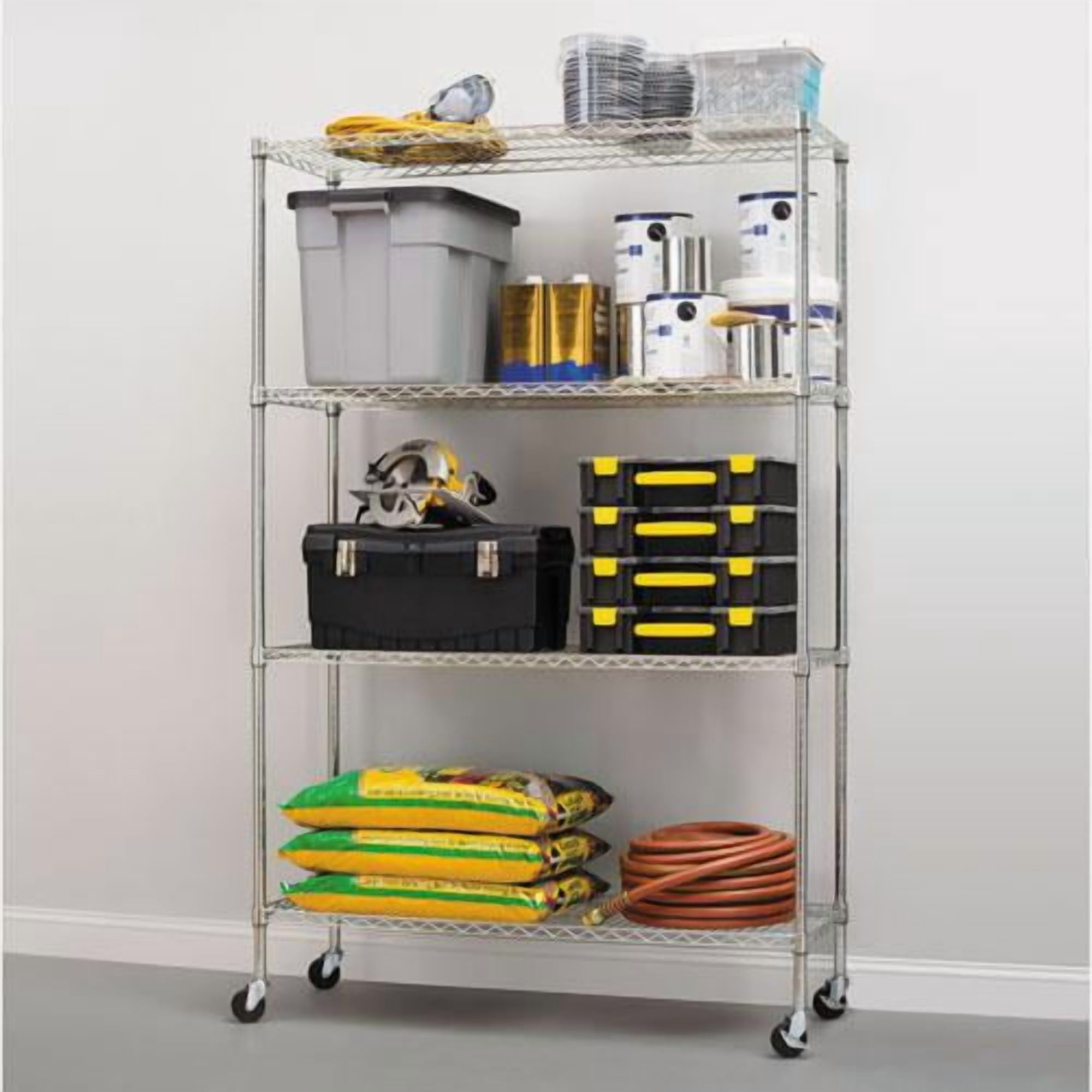 Expand supply room or work area storage capacity with this Alera silver wire shelving unit.Rely on this sturdy silver welded wire shelving unit for dependable support and storage. The 600-pound weight capacity can be evenly distributed across each of the four shelves when used without casters, and the casters attach in moments for handy mobile storage. This Alera shelving unit is suitable for use indoors and out thanks to the corrosion-resistant finish and an open design that prevents moisture buildup.• Shelf rack offers plenty of storage space for any office, garage, or utility room.• Made of durable silver metal.• Four non-adjustable shelves.• Holds up to 600 lbs. per shelf.• Dimensions: 60″H x 48″W x 18″D.• Easy to assemble.• Casters allow for easy transportation of heavy loads.• Meets or exceeds NSF standard.• Sold as 1 Each.