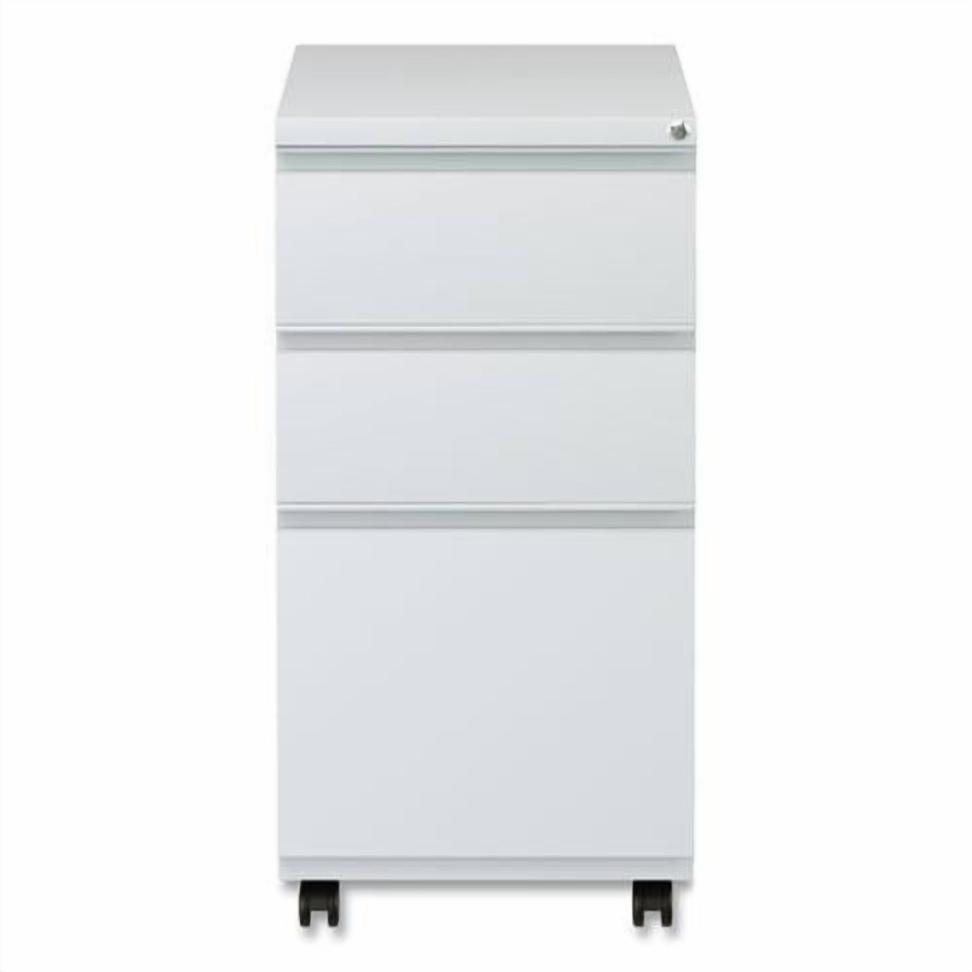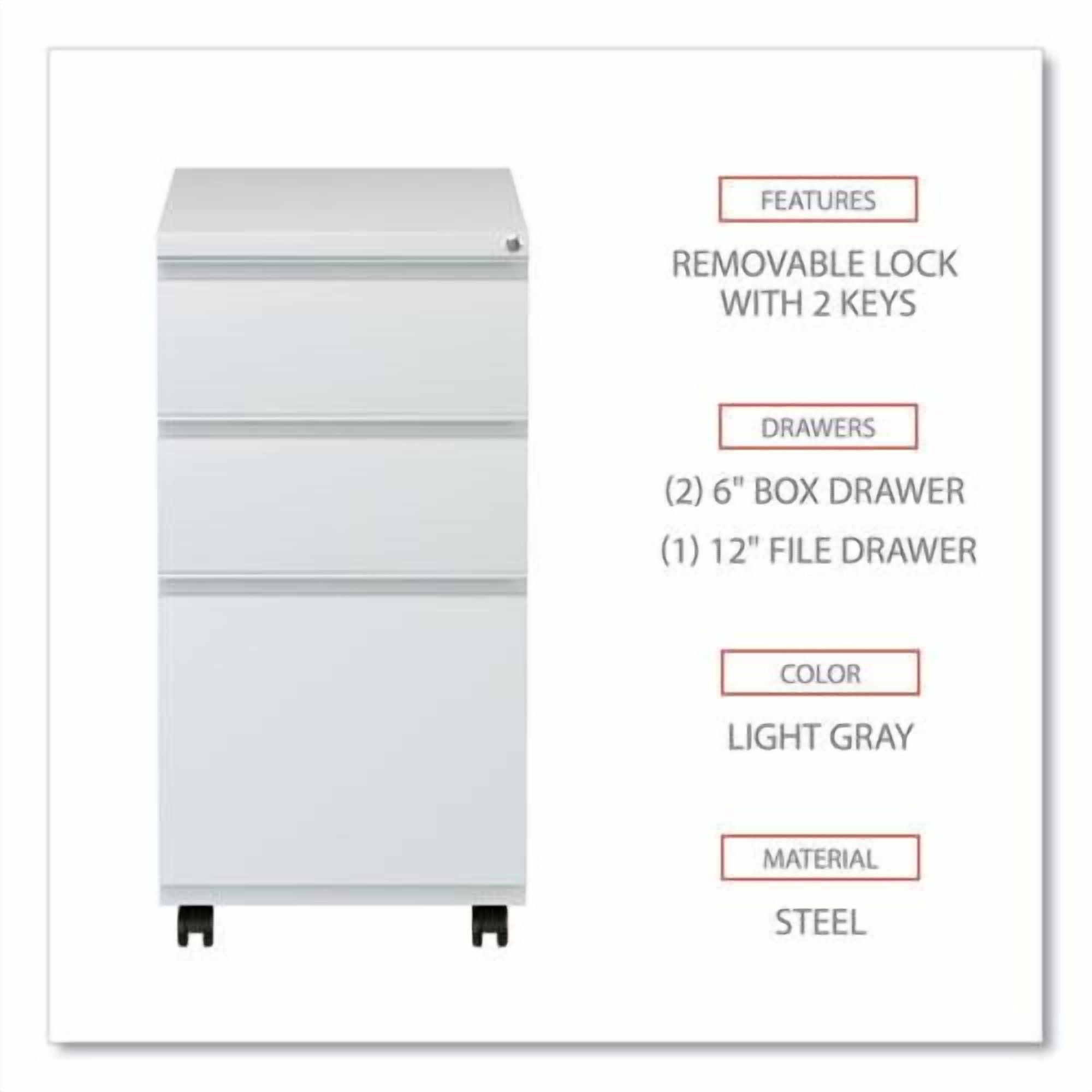 File Pedestal with Full-Length Pull, Left/Right, 3-Drawers: Box/Box/File, Legal/Letter, Light Gray, 14.96″ x 19.29″ x 27.75″ Get organized with a high-sided file cabinet with drawers that accommodate letter or legal-sized hanging files. Steel ball bearing telescoping slide suspension helps drawers glide smoothly and with ease. The counterweight prevents tipping. Equipped with four casters, two locking, two non-locking. Full-length pull permits easy opening. Single key core removable lock with two keys. Durable powder coated finish helps prevent scratches. Full-length, recessed pull permits easy opening. Four casters (two locking) for mobility or four glides for stationary use. High-sided file drawer accommodates letter/legal filing. Counterweight prevents tipping. – Anti-Tip Mechanism: Counterweight – Base Material: Steel – Color: Light Gray – Global Product Type: Vertical Desk Pedestals – Number of Drawers: 3 – Overall Depth: 19.29″ – Overall Height: 27.75″ – Overall Width: 14.96″ – Top Material: Steel – Document Size Accommodation: Legal, Letter – Special Features: Box/Box/File Format-Two 6″ high box drawers and one 12″ high file drawer. – Drawer Configuration: Box/Box/File – Drawer Height-File Drawer: 12″ – Pedestal Count: 1 – Pedestal Types: Freestanding: Full-Height – Drawer Height-Box Drawer: 6″ – Compliance Standards: Meets or Exceeds ANSI/BIFMA Standards – Color Family: Gray – Height Without Casters: 26.38″ – Anti-Tip Mechanism Indicator: Yes – Pedestal Sub-Type Indicator: Yes – Caster Indicator: Yes – Glide/Feet Indicator: No – Pedestal Orientation: Left/Right – Caster Details: Two Locking Swivel Casters, Two Non-Locking Swivel Casters – Product Biodegradability in Days: 0