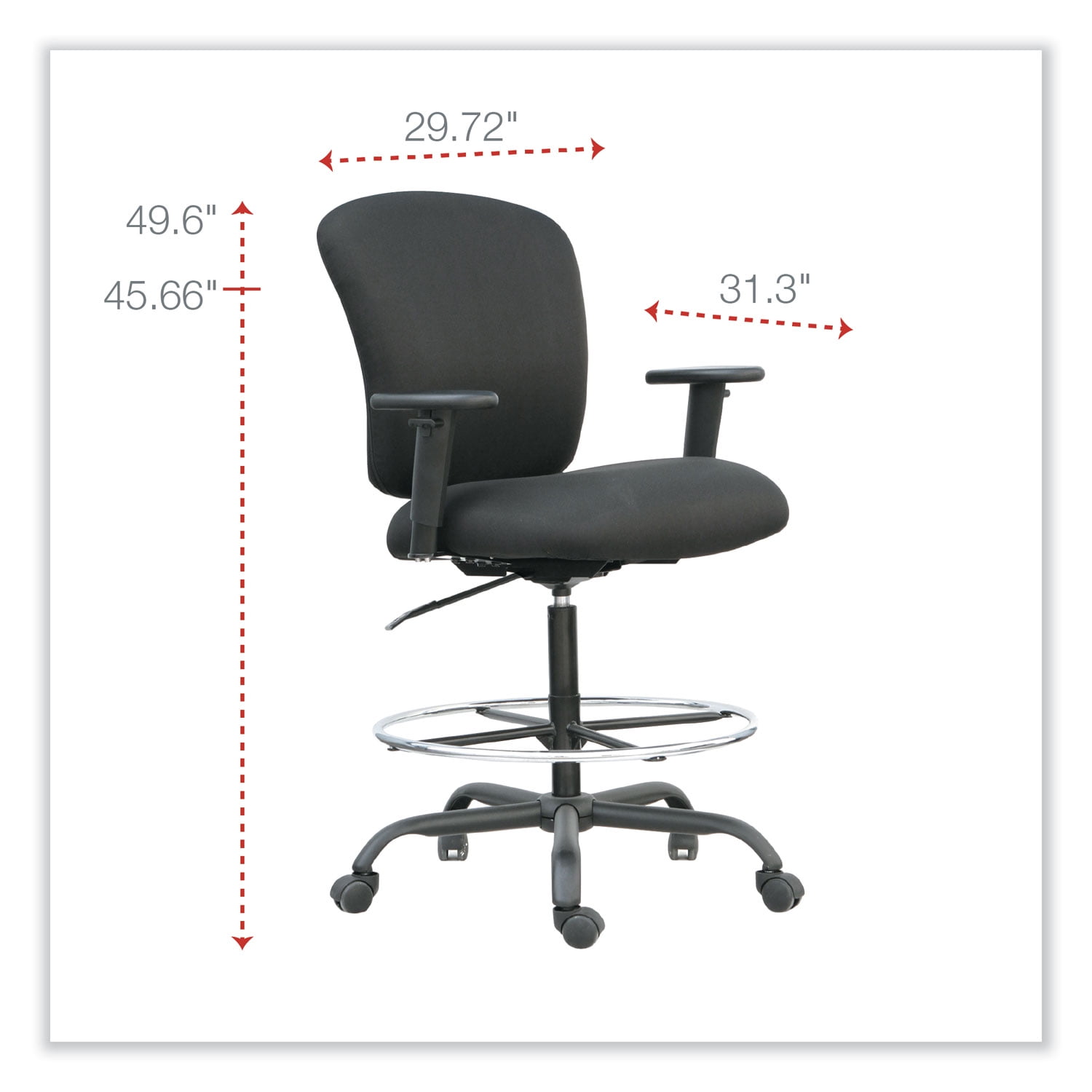 Alera’s Mota Series stool is generously padded, contoured seating that’s specifically designed and ideal for the big and tall user. Durable, reinforced seating structure and steel base for maximum, reliable support. Enhanced padding and fabrics for extra support throughout the workday. Welded, integrated foot ring for leg support. Height adjustable soft-padded T-arms for optimal arm positioning. Waterfall seat edge reduces pressure points at the back of the knees. Arm Adjustability: Height; Arm Height From Seat: 5.5″; Arm Type: T-Bar; Armrest Color: Black; Armrest Material: Polyurethane; Arms Included: Yes; Asynchronous Control: No; Back Color: Black; Back Height Adjustment: No; Back Height Maximum: 21.65”; Back Surface Material: Fabric; Back Surface Material Family: Fabric; Back Width Maximum: 18.5″; Base/Frame Color: Black; Base/Frame Material: Steel; Caster/Glide Details: Five 2″ Hooded Casters; Caster/Glide Surface Texture: Hard; Color Family: Black; Distance Between Arms: 20.07″; Dual-Action Tilt: No; Dual-Clutch Posture Control: No; Integral Lumbar Support: No; Knee Tilt: No; Multi-Task Control: No; Overall Depth Maximum: 31.3″; Overall Height Maximum: 49.6″; Overall Height Minimum: 45.66″; Overall Width Maximum: 29.72”; Pneumatic Seat Height Adjustment: Yes; Posture Lock: No; Recommended Application Area(s): Assembly/Repair & Technical Task; General Office & Task; Specialty; Seat Color: Black; Seat Depth Maximum: 19.29″; Seat Glide Mechanism: No; Seat Height Maximum: 32.67″; Seat Height Minimum: 28.74″; Seat Surface Material: Fabric; Seat Surface Material Family: Fabric; Seat Width Maximum: 21.65″; Synchronized Knee Tilt: No; Tilt Tension/Tilt Lock: No; Variable Synchro-Tilt: No; Weight Capacity (text): Supports Up to 450 lb Compliance Standards: CAL TB117-2013 Compliant; Meets or Exceeds ANSI/BIFMA Standards. Warranty: Manufacturer’s limited five-year warranty. Post-Consumer Recycled Content Percent: 5%. Pre-Consumer Recycled Content Percent: 25%. Recycled Comments: Contains 5% post-consumer recycled content, 30% total recycled content.