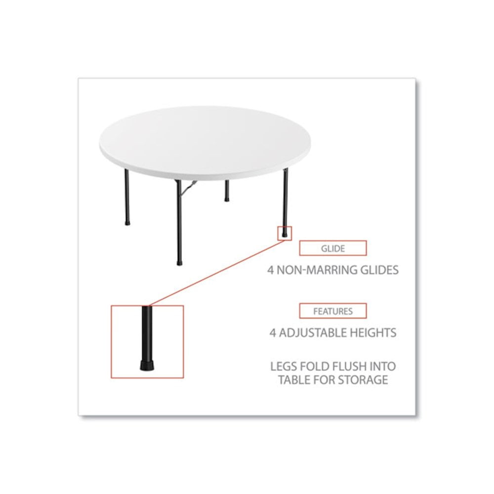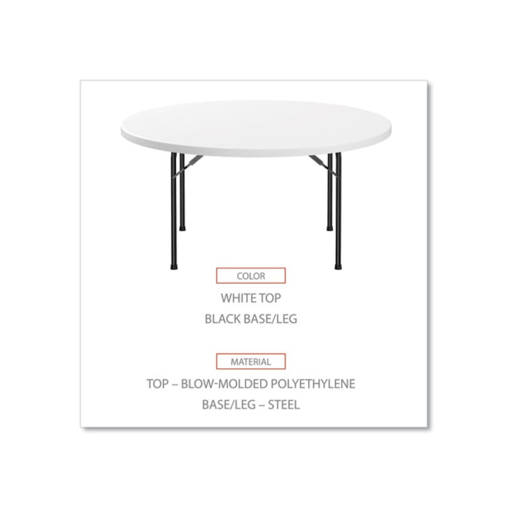 Alera’s convenient round folding tables setup quick for banquets, dinner or when just extra space is needed. Tables are perfect for both indoors or outdoors. Blow-molded polyethylene top is water and stain resistant; won’t crack or stain. Strong durable powder-coated metal construction withstands dents and scratches. Slide lock feature to ensure table stability once opened. Legs fold flush into table creating a flat surface for storage and stacking. Non-marring foot caps. Supports up to 1200 lbs (evenly distributed). Supports up to 900 lbs evenly distributed. Top Color: White; Color Family: White; Base Color: Black; Top Shape: Round.