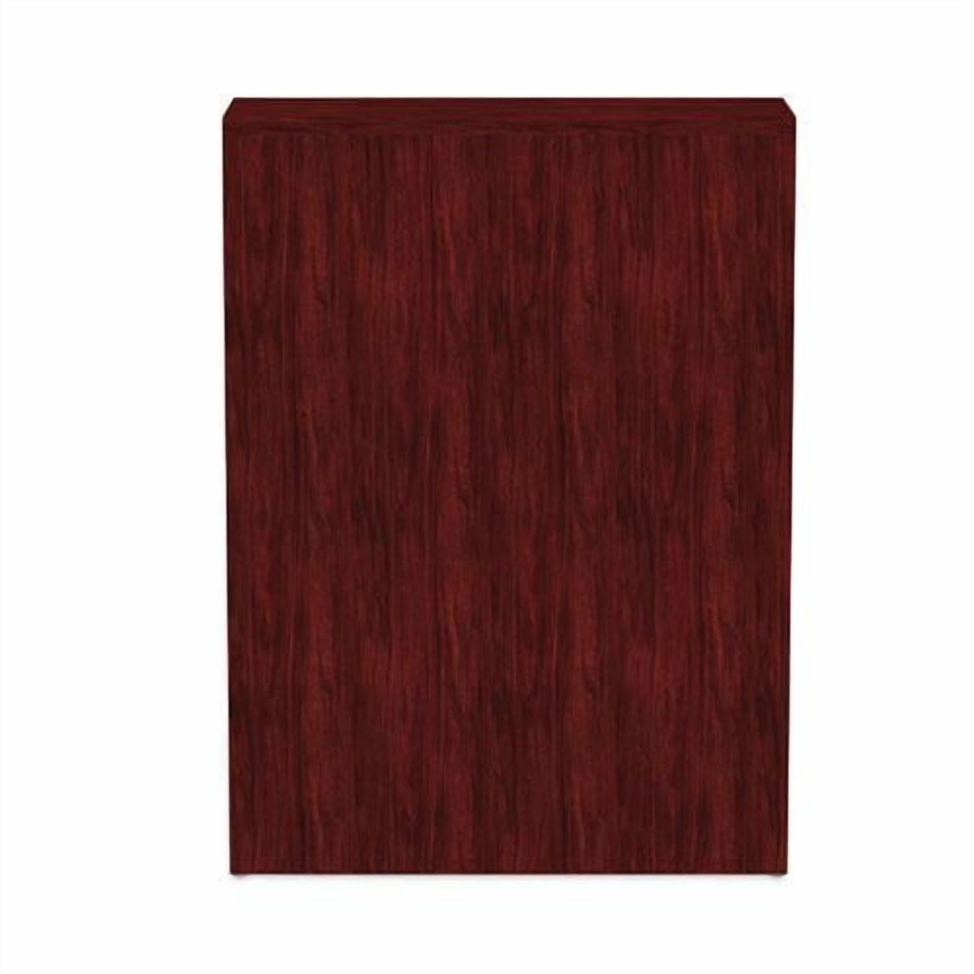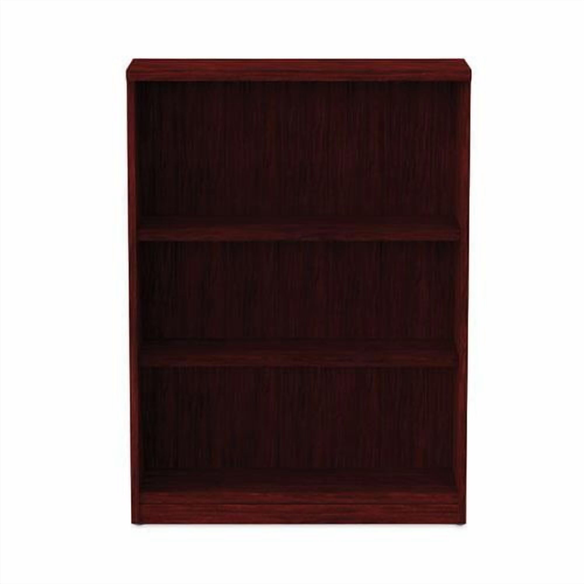 Alera Valencia Series Bookcase, Three-Shelf, 31.75w x 14d x 39.38h, Mahogany Woodgrain laminate bookcase features a contemporary design that fits perfectly in professional environments. Commercial-grade side panels with protective 3 mm edge banding provide excellent dent and scratch resistance. 11.75″ deep shelves accommodate a wide range of materials. Top and bottom shelf are fixed, middle shelf is adjustable. Top panel is 14″ deep for door installation. Tight, dowel, and cam-lock assembly provides a clean look while ensuring overall stability. Contemporary design; woodgrain laminate construction. Commercial-grade side panels with protective edges. 11.75″ deep shelves. Top and bottom shelf are fixed, middle shelf is adjustable. Matches all Valencia Series products, heights align with desks and hutches. Top panel is 14″ deep for door installation. Tight, dowel, and cam-lock assembly. Shelves hold up to 150 lbs per shelf.