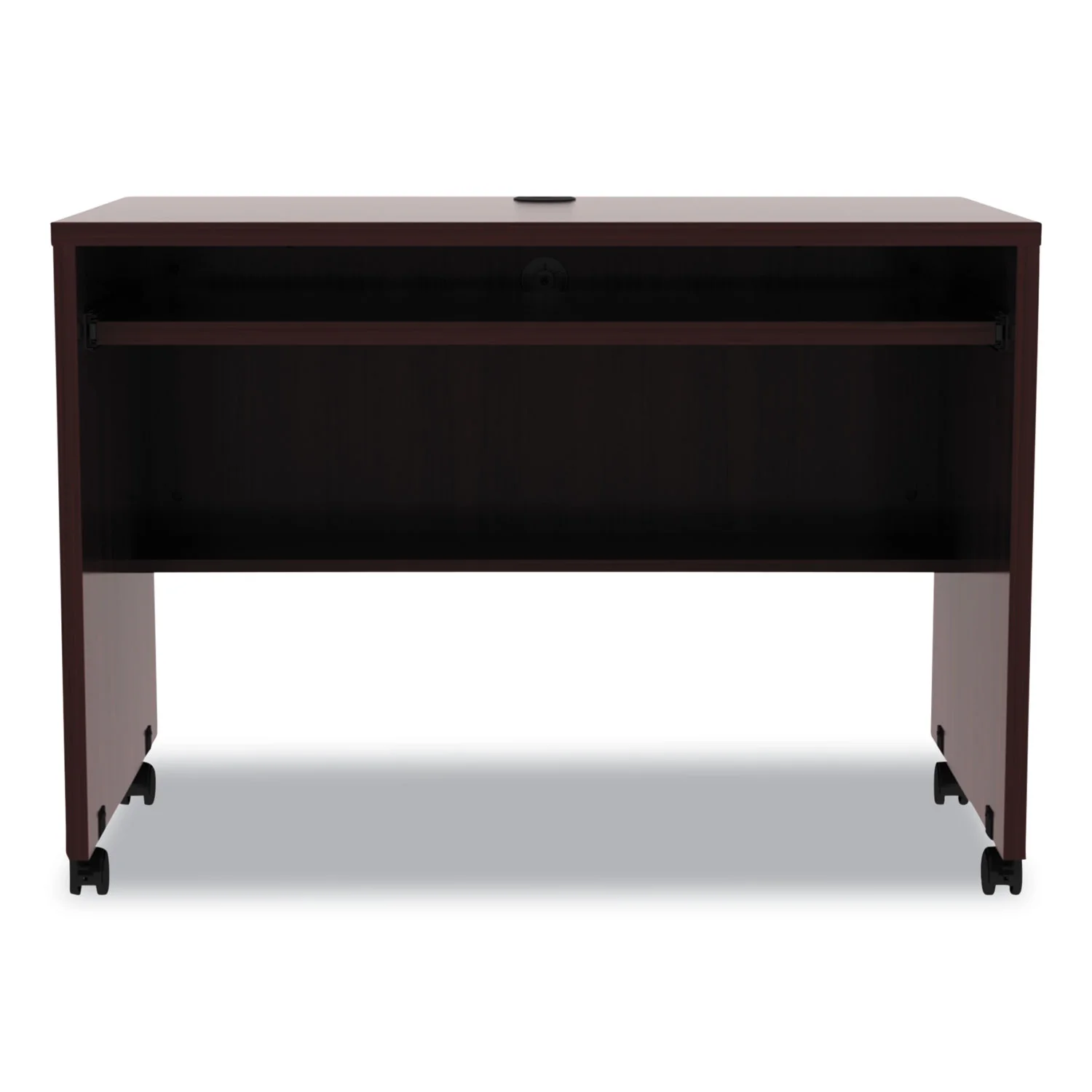 Portable mobile workstation desk goes anywhere you need it. Scaled to fit in tight spaces and designed to pass through standard doorways to go from room to room. Full width, full-extension, slide-out keyboard tray. Commercial-grade laminate worksurface and side panels are water, scratch, and dent-resistant. Charcoal accent line under worksurface adds a distinctive touch. Protective edge banding helps prevent damage from bumps. Two grommets for cable and wire management. Undermount interior shelf for quick storage and to hold wires when moving. Three-fourths height back modesty panel for privacy. Four casters (two locking) for mobility. Base Material: Laminate; CPU Holder/Platform Indicator: No; Caster/Glide/Wheel: Four Hooded Casters (Two Locking); Color Family: Mahogany; Edge Detail Profile: 3 mm Protective Edge Band; For Use With: Alera® Sedina Series and Valencia™ Series Components.