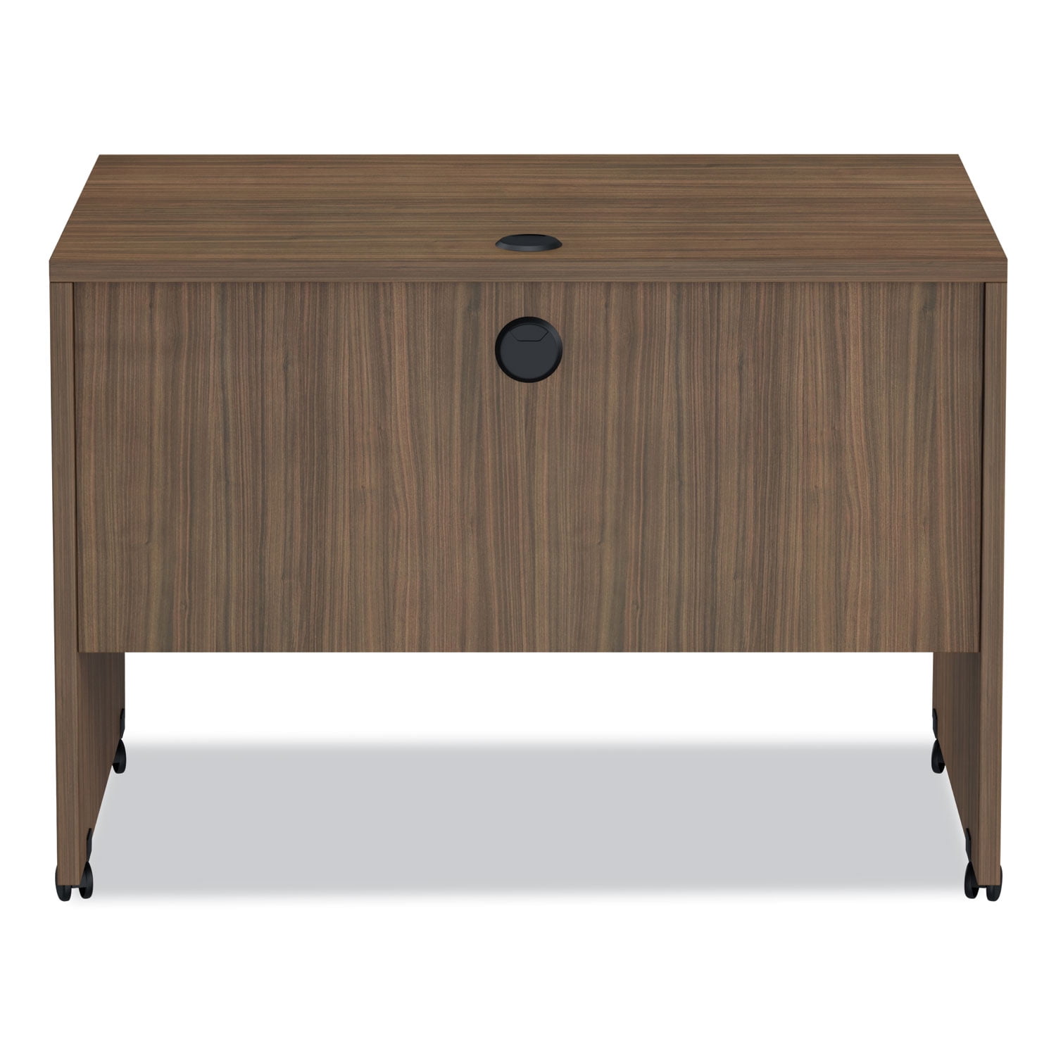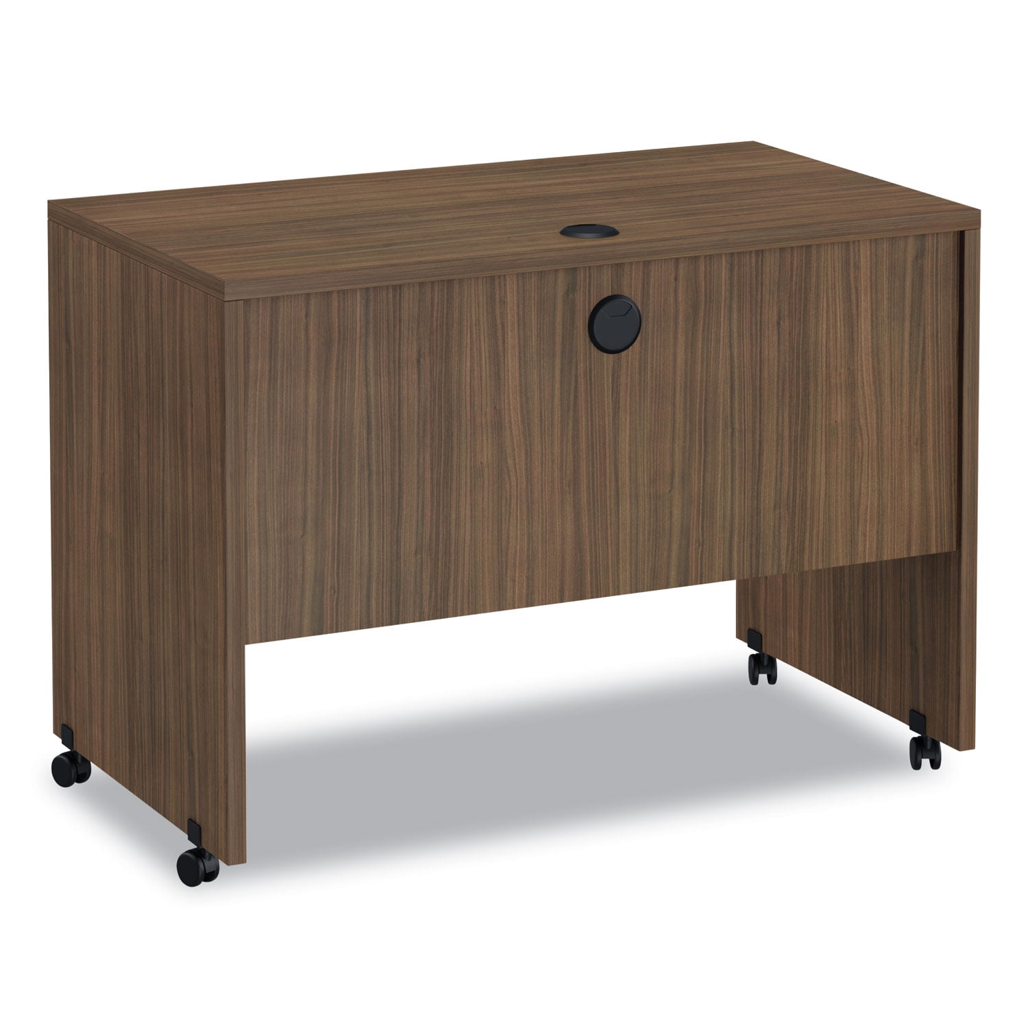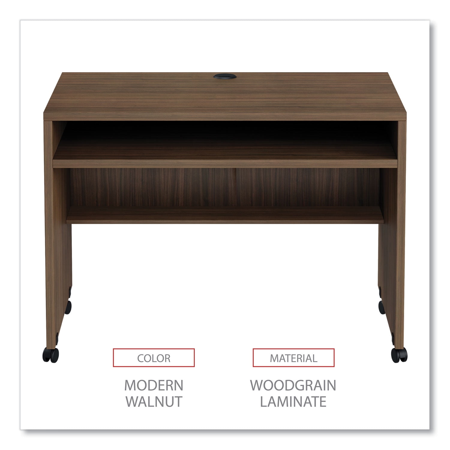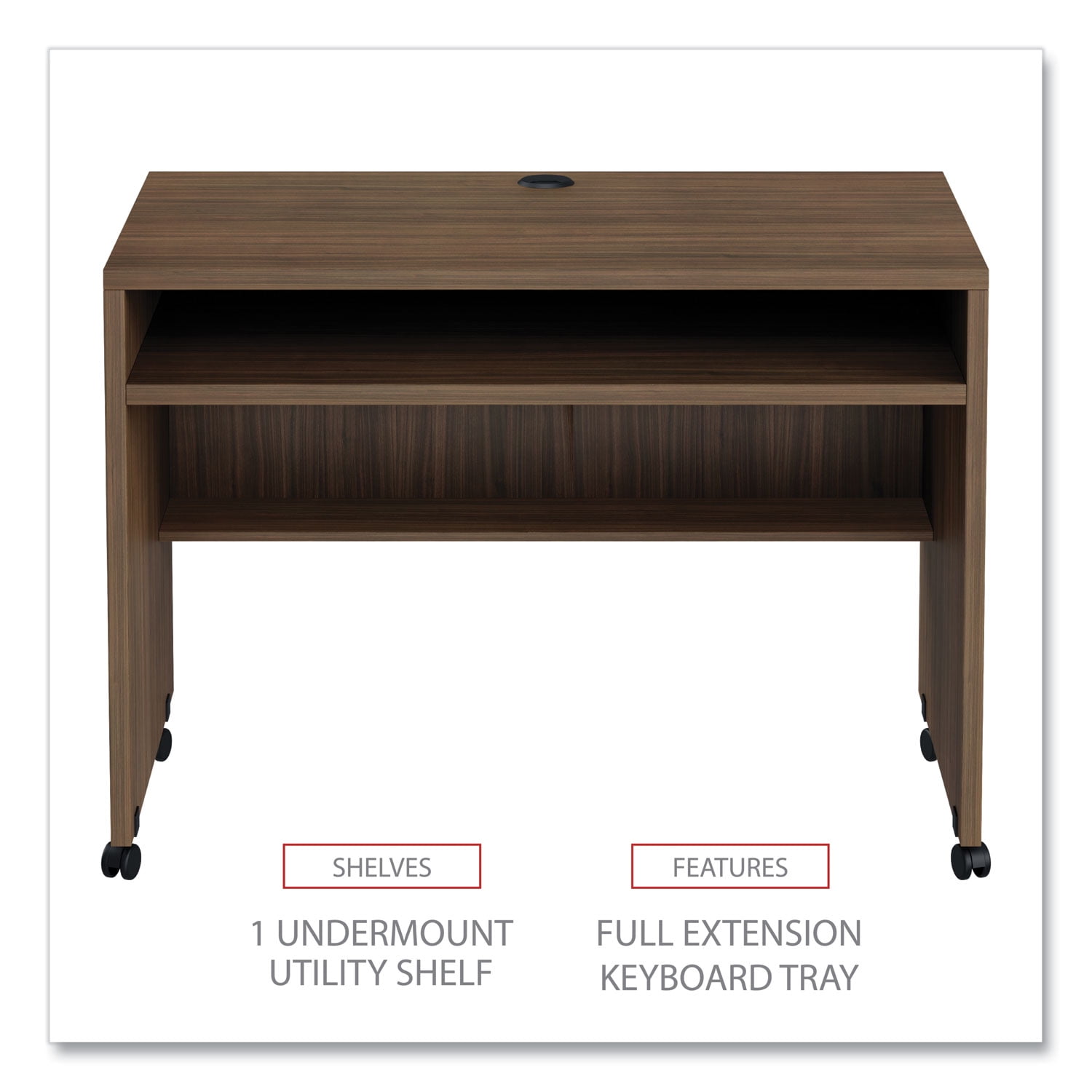 Portable mobile workstation desk goes anywhere you need it. Scaled to fit in tight spaces and designed to pass through standard doorways to go from room to room. Full width, full-extension, slide-out keyboard tray. Commercial-grade laminate worksurface and side panels are water, scratch, and dent-resistant. Charcoal accent line under worksurface adds a distinctive touch. Protective edge banding helps prevent damage from bumps. Two grommets for cable and wire management. Undermount interior shelf for quick storage and to hold wires when moving. Three-fourths height back modesty panel for privacy. Four casters (two locking) for mobility. Base Material: Laminate; CPU Holder/Platform Indicator: No; Caster/Glide/Wheel: Four Hooded Casters (Two Locking); Color Family: Walnut; Edge Detail Profile: 3 mm Protective Edge Band; For Use With: Alera® Sedina Series and Valencia™ Series Components.