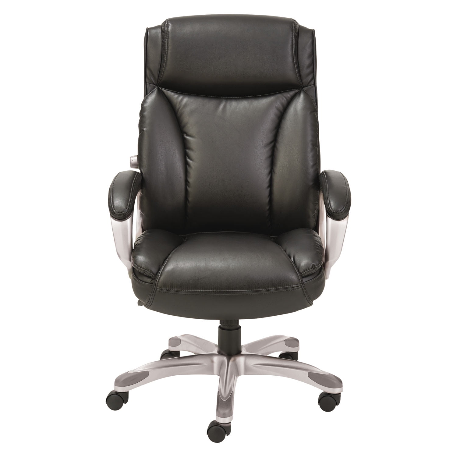 Alera’s coil spring cushioned seat provides long-lasting, mattress-like comfort. Ergonomic side bolsters for added support. Adjustable lumbar support for optimal back positioning. Integrated cushioned leather headrest and padded bonded leather armrests. Five-star base with protective foot zones. Generously cushioned waterfall seat reduces pressure points at the back of the knee. Arm Height From Seat: 6.63″; Arm Type: Padded Loop; Armrest Color: Black; Armrest Material: Bonded Leather; Arms Included: Yes; Asynchronous Control: No; Back Color: Black; Back Height Adjustment: No; Back Height Maximum: 28.94″; Back Surface Material: Bonded Leather; Back Surface Material Family: Bonded Leather; Back Width Maximum: 21.46″; Base/Frame Color: Graphite; Base/Frame Material(s): Nylon; Caster/Glide Details: Five Nylon Casters; Caster/Glide Surface Texture: Hard; Color Family: Black; Distance Between Arms: 21.25″; Dual-Action Tilt: No; Dual-Clutch Posture Control: No; Integral Lumbar Support: Yes; Knee Tilt: No; Multi-Task Control: No; Overall Depth Maximum: 30.51″; Overall Depth Minimum: 30.38″; Overall Height Maximum: 46.46″; Overall Height Minimum: 43.70″; Overall Width Maximum: 28.15″; Pneumatic Seat Height Adjustment: Yes; Posture Lock: No; Recommended Application Area(s): Executive & Management; General Office & Task; Seat Color: Black; Seat Depth Maximum: 17.01″; Seat Glide Mechanism: No; Seat Height Maximum: 22.44″; Seat Height Minimum: 19.69″; Seat Surface Material: Bonded Leather; Seat Surface Material Family: Bonded Leather; Seat Width Maximum: 21.65″; Synchronized Knee Tilt: No; Tilt Tension/Tilt Lock: Yes; Variable Synchro-Tilt: No; Weight Capacity: Supports Up to 275 lb Compliance Standards: CAL TB117-2013 Compliant; Meets or Exceeds ANSI/BIFMA Standards. Warranty: Manufacturer’s limited five-year warranty. Post-Consumer Recycled Content Percent: 0%. Pre-Consumer Recycled Content Percent: 15%. Recycled Comments: Contains 15% total recycled content.