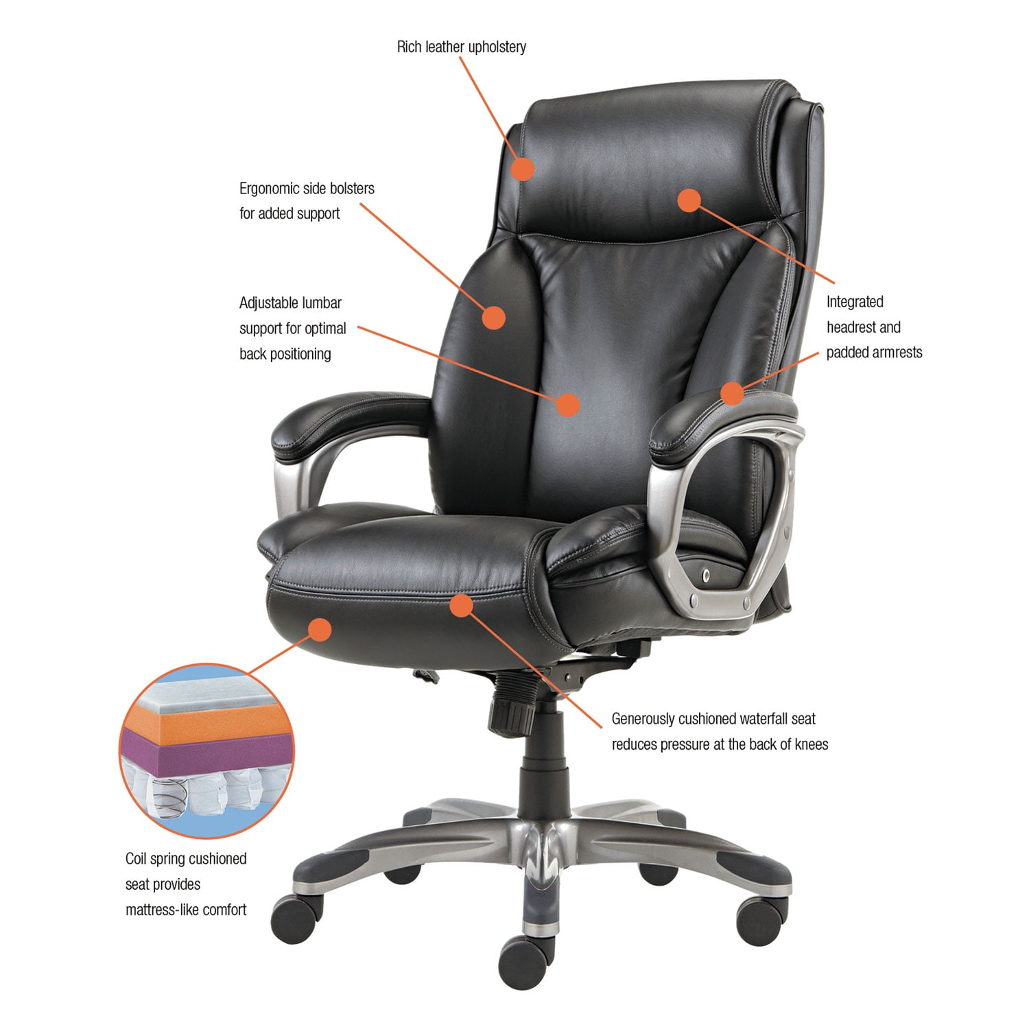 All day mattress-like comfort. Coil spring cushioned seat provides long-lasting, mattress-like comfort. Ergonomic side bolsters for added support. Adjustable lumbar support for optimal back positioning. Integrated cushioned leather headrest and padded leather armrests. Five-star base with protective foot zones. Generously cushioned waterfall seat reduces pressure points at the back of the knee.