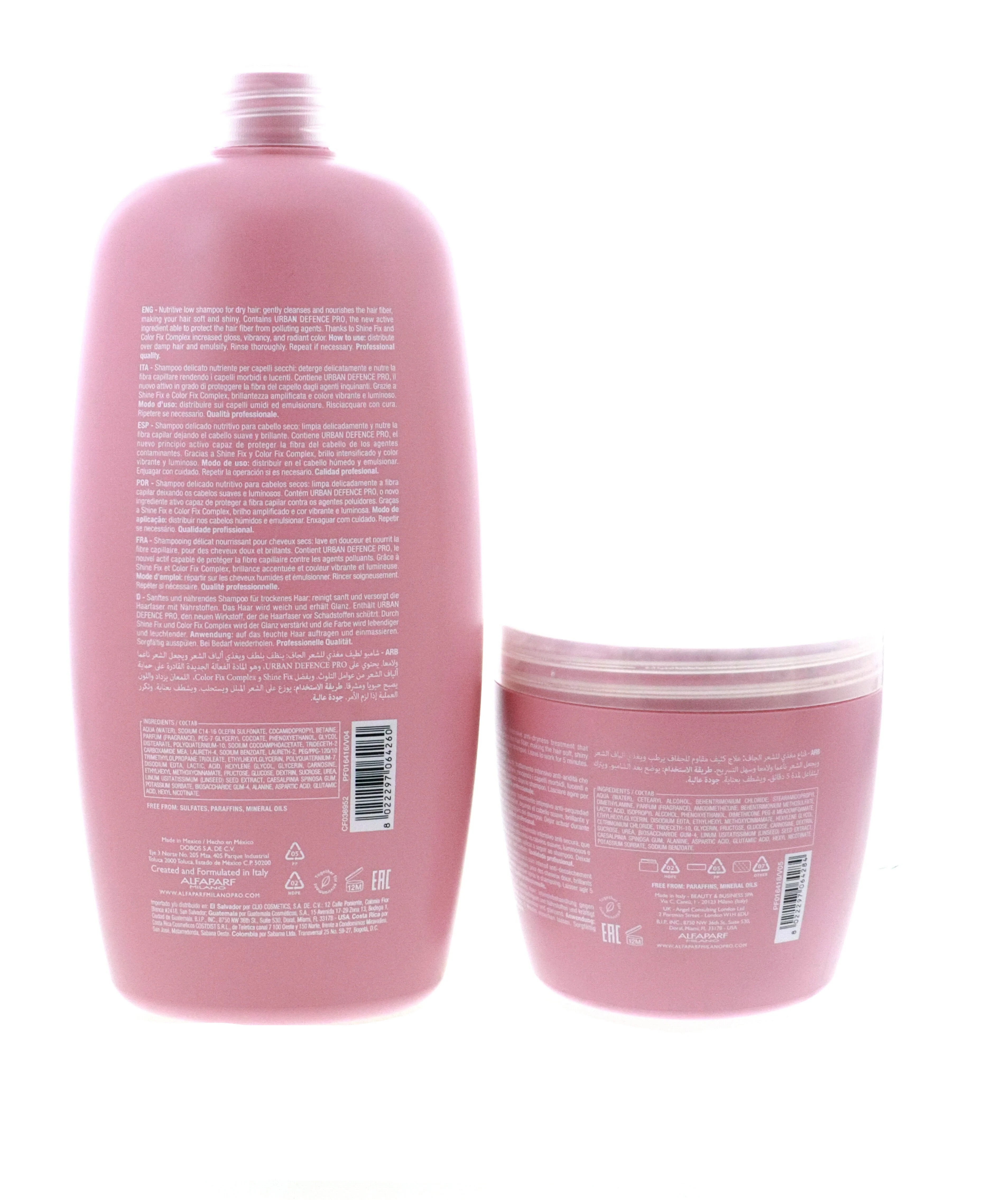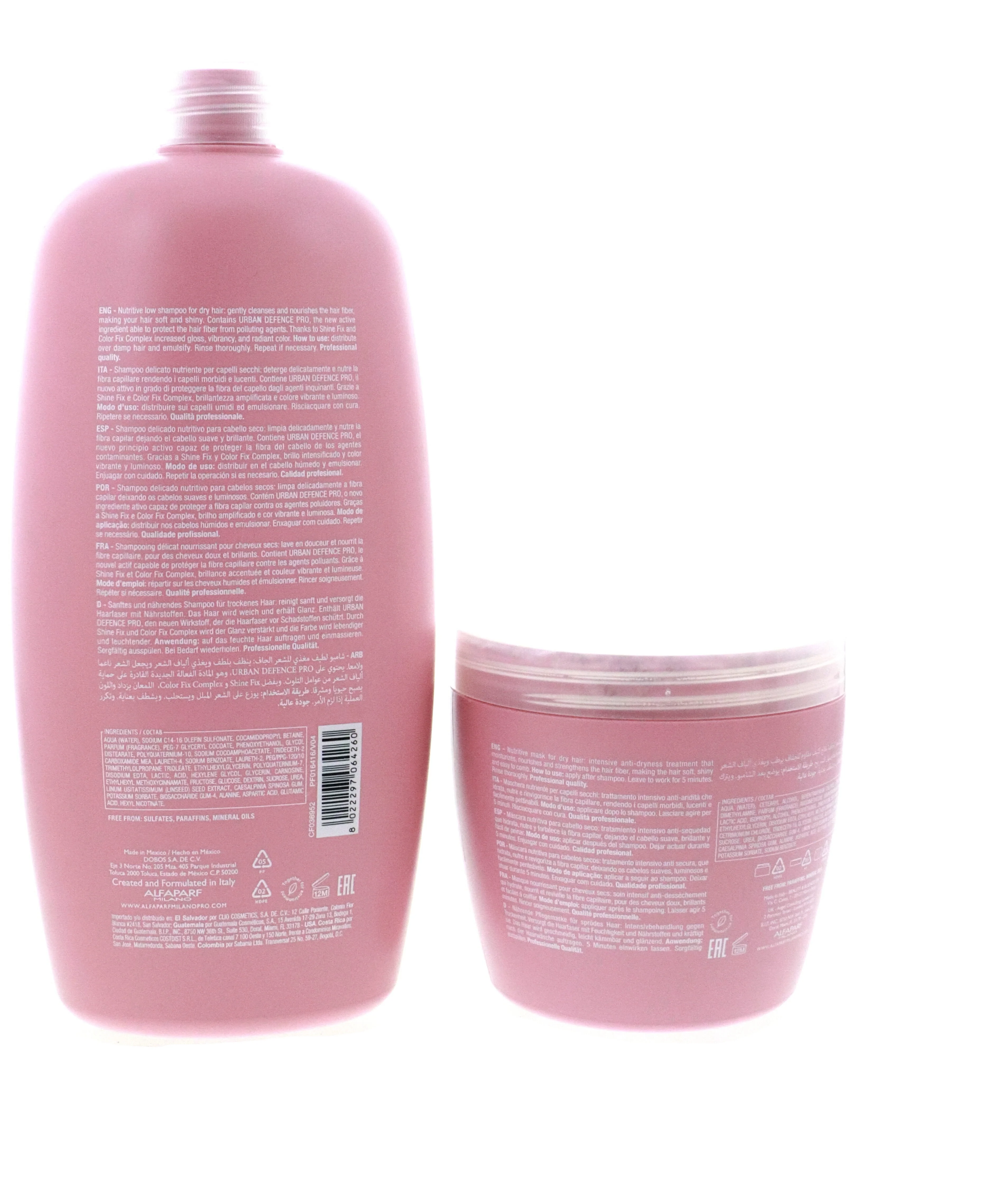 Alfaparf Milano Semi Di Lino Moisture Nutritive Low Shampoo 33.8oz- A professional salon quality nutritive moisture low shampoo for dry hair that gently cleanses and nourishes the hair fiber. The moisturizing shampoo makes your hair healthy, soft, shiny and glossy without weighing it down.Alfaparf Milano Semi Di Lino Moisture Nutritive Mask 16.9oz- Professional salon quality nutritive moisturizing mask recommended for dry hair. An intensive anti-dryness deep conditioning moisture treatment that is safe on color treated hair and sulfate, SLS, paraben and paraffin free.