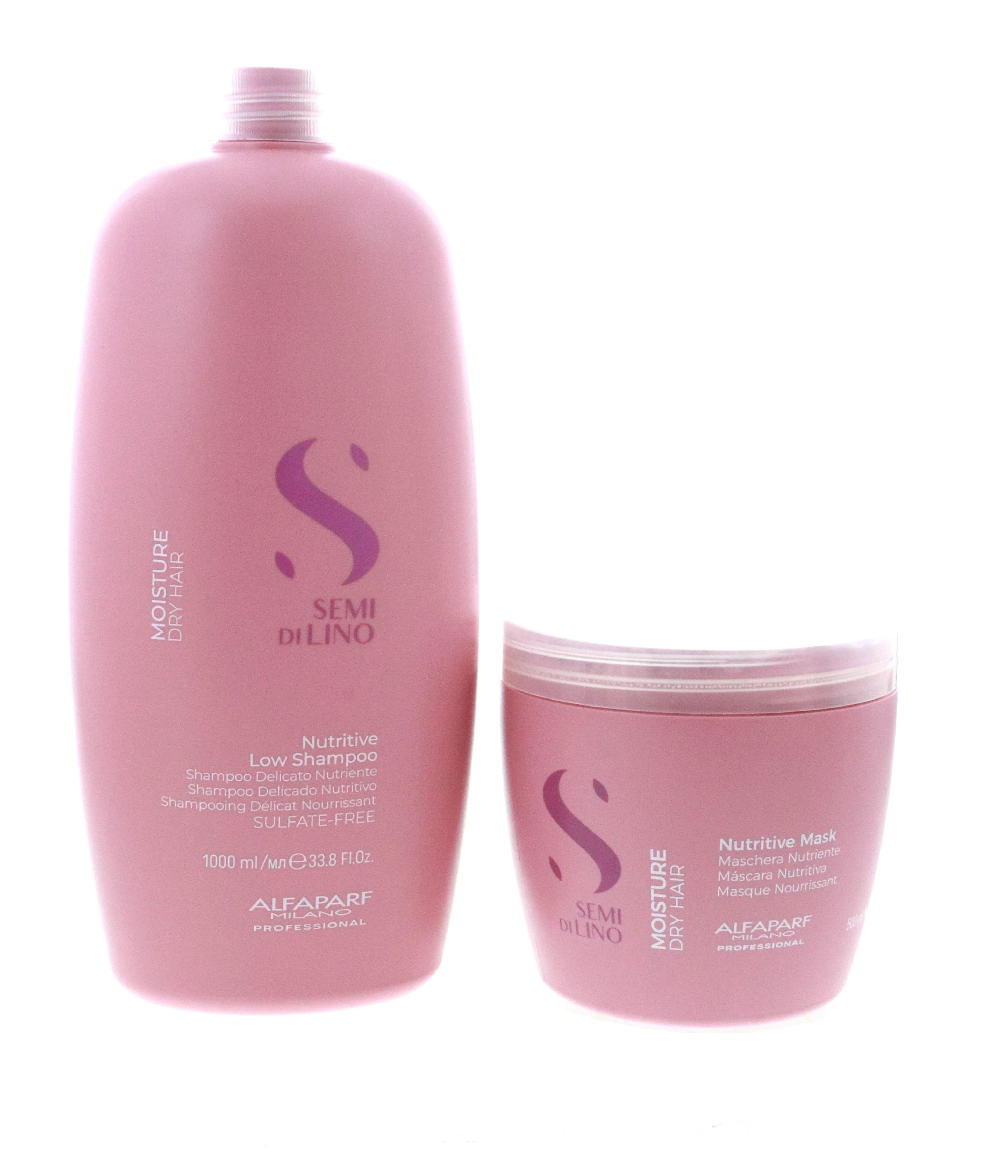 Alfaparf Semi Di Lino Moisture Nutritive Shampoo 33.8oz & Mask 16.9oz Alfaparf Milano Semi Di Lino Moisture Nutritive Low Shampoo 33.8oz- A professional salon quality nutritive moisture low shampoo for dry hair that gently cleanses and nourishes the hair fiber. The moisturizing shampoo makes your hair healthy, soft, shiny and glossy without weighing it down.|Alfaparf Milano Semi Di Lino Moisture Nutritive Mask 16.9oz- Professional salon quality nutritive moisturizing mask recommended for dry hair. An intensive anti-dryness deep conditioning moisture treatment that is safe on color treated hair and sulfate, SLS, paraben and paraffin free.