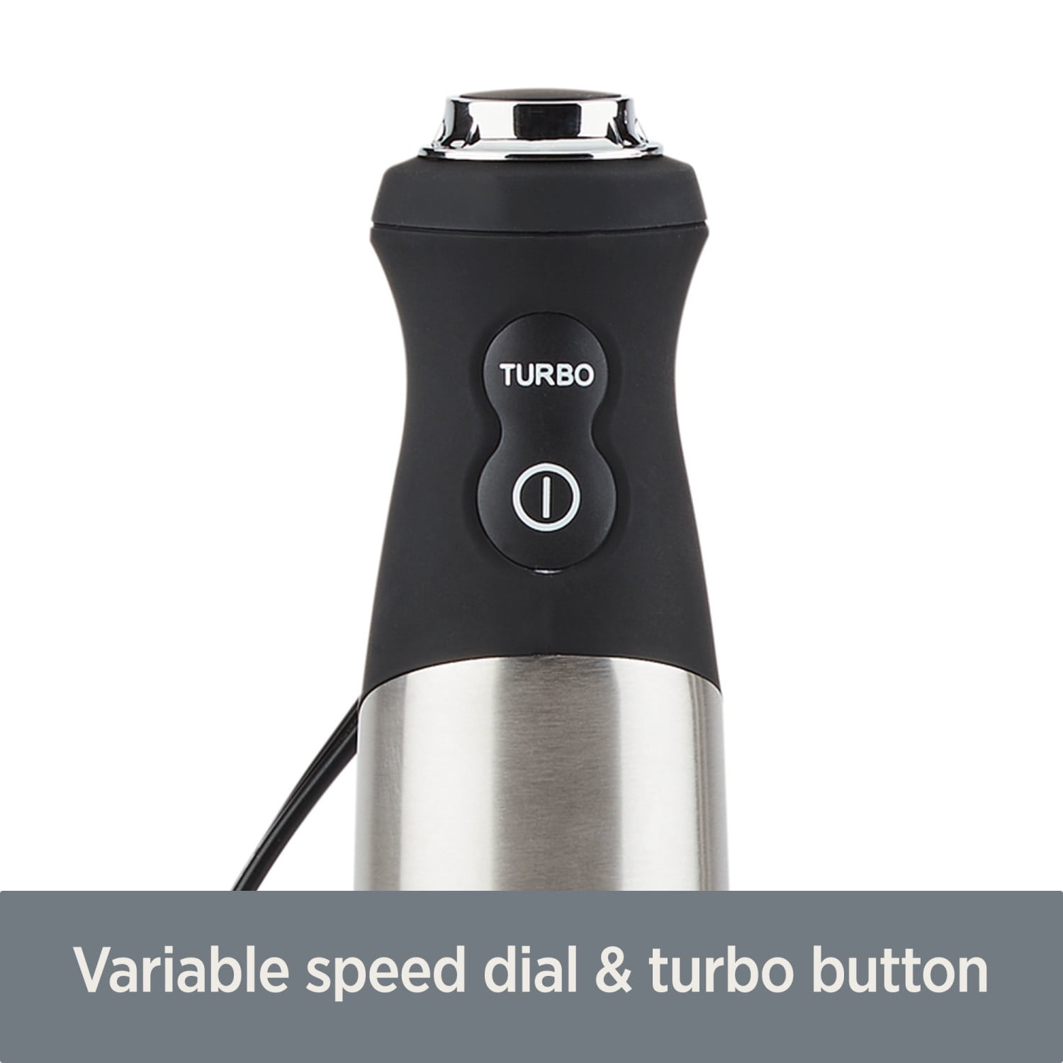 High-performance hand blender: A 600W motor and variable-speed dial with turbo function, plus an ergonomic grip handle to make quick work of any food-prep tasks. Precise speed control: This hand blender features a variable-speed dial and turbo button to adjust the speed according to your needs. Extra-long driveshaft: The hand blender adapts to various containers with its extra-long 9 1/4″ driveshaft that reaches into deep bowls and pots. Easy cleaning: The hand blender’s stainless steel shaft detaches for easy cleaning and storage. Large blending head: The hand blender features a large blending head that effectively reduces splatter during use, ensuring a cleaner and more enjoyable blending experience
