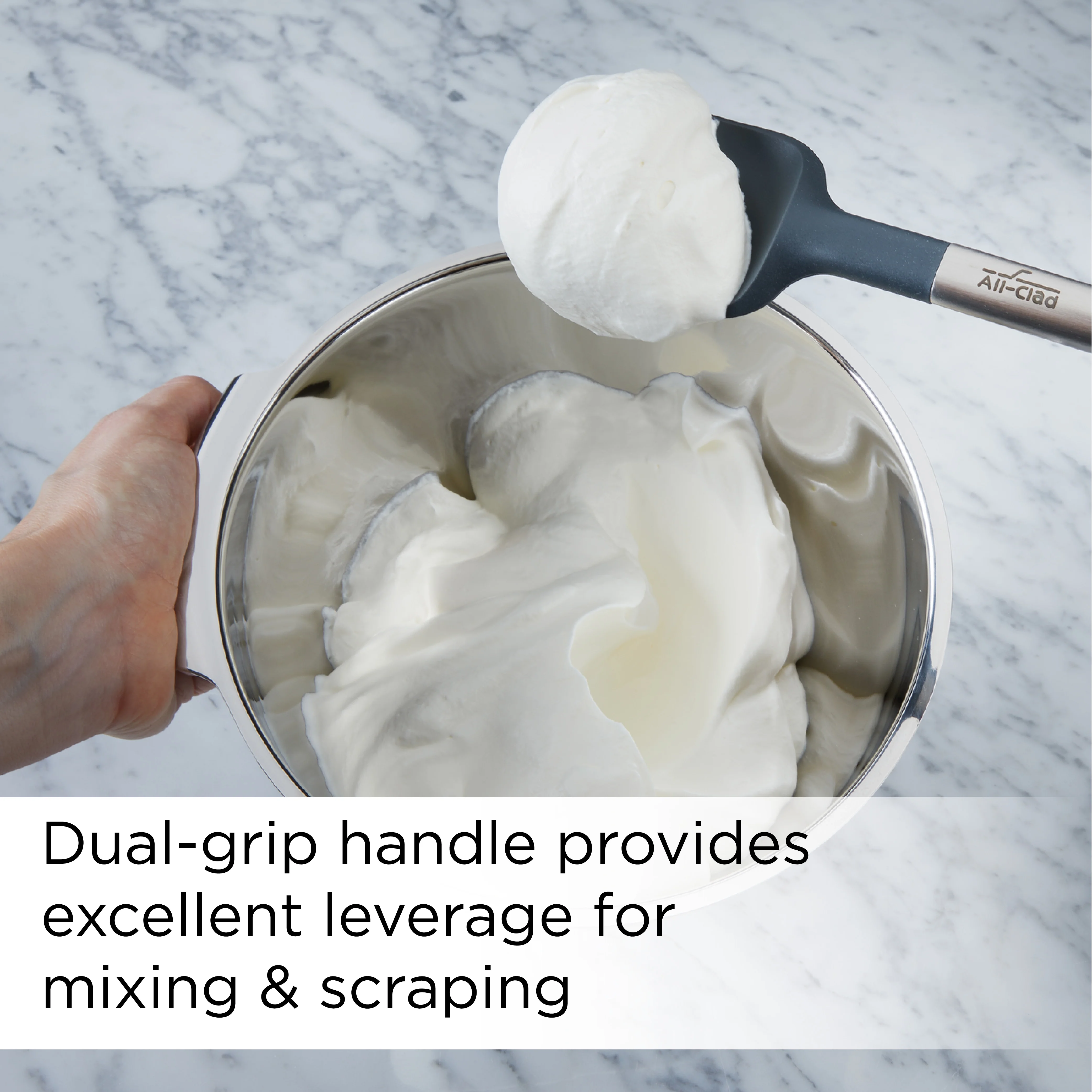 Platinum Silicone Heads: Silicone head is firm enough to scrape but can easily flex to reach into corners Durable, Heat Safe Silicone: Heat safe up to 450 degrees F and safe for use with nonstick cookware and bakeware Easy to Clean: Dishwasher safe and designed to prevent buildup in crevices Brushed stainless steel dual grip handle provides excellent leverage for mixing and scraping Dual Grip Handles