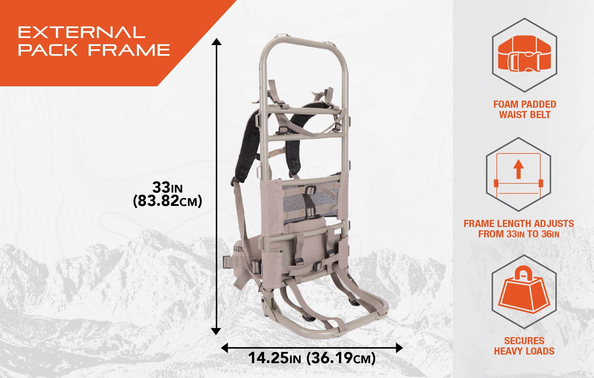 Allen Company Rock Canyon Lightweight External Backpack Frame, Tan Lightweight, Yet Heavy-Duty, Sturdy Aluminum Frame Frame Is Adjustable From 33-Inches To 36-Inches Bottom Folding Shelf Gives You Extra Support Dense Foam Padded Waist Belt and Shoulder Straps Allen Company Rock Canyon Lightweight External Backpack Frame, Tan, Sport All-Weather, Hunting, Aluminum Adult Men Large frame for heavy loads.