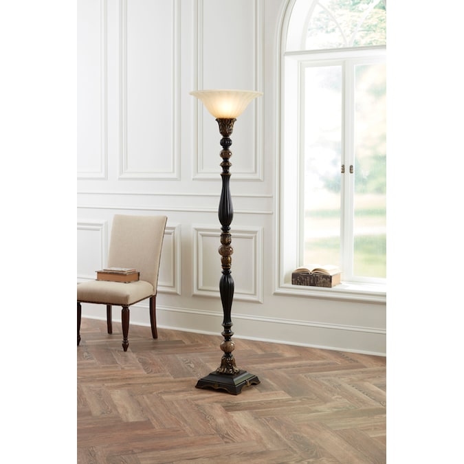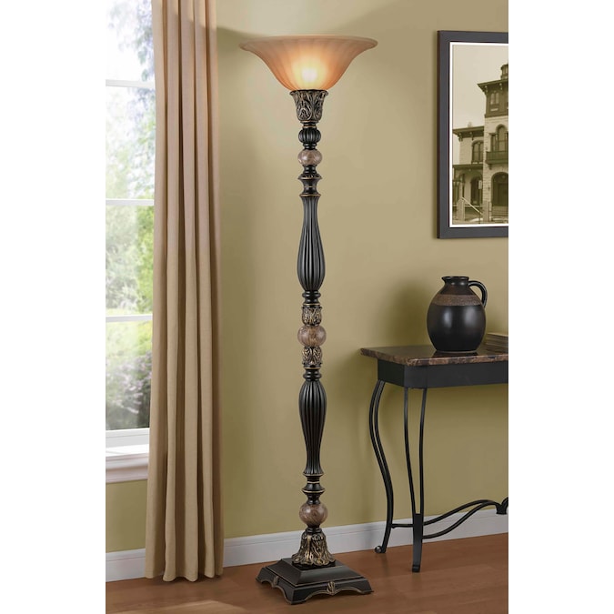 This torchiere floor lamp offers traditional styling for your home or office. Finished in a rich bronze tone with gold and faux marble accents and a fluted champagne glass shade, this lamp is sure to please. Pair this lamp with other items from the Barada collection for a complete and unified look.