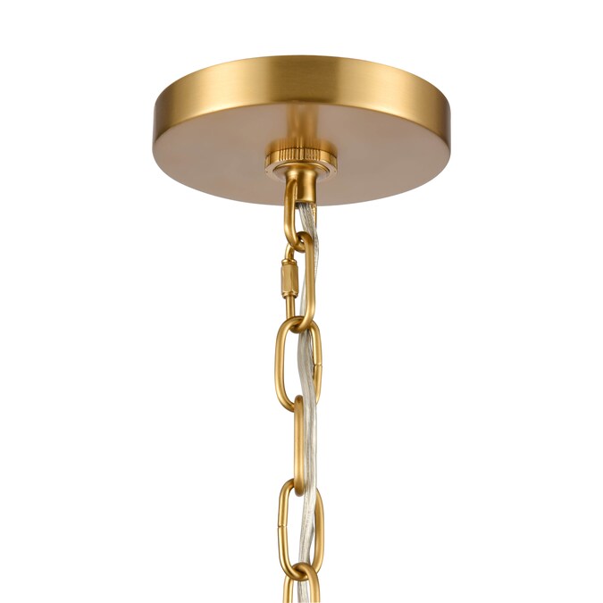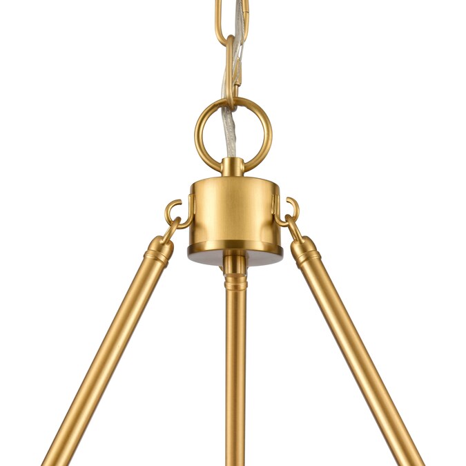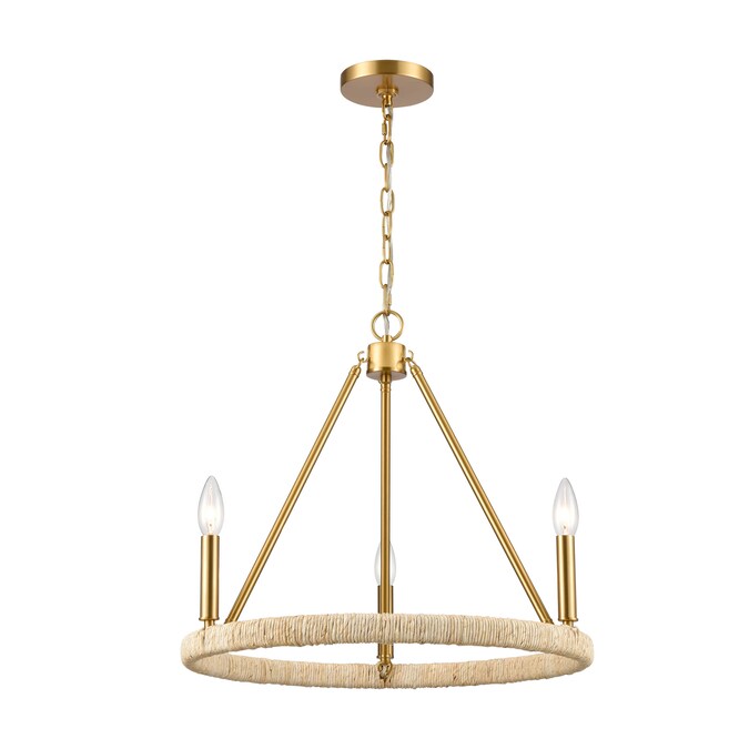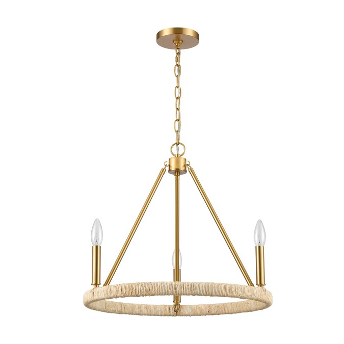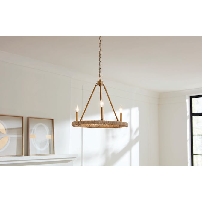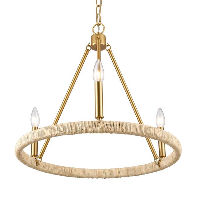 The Carradine 3-Light Chandelier has a simplistic design that allows natural abaca material to be the focus of attention. A circle wrapped in abaca holds three candles, and is suspended by three gold rods from a single round ceiling pan.