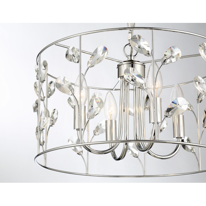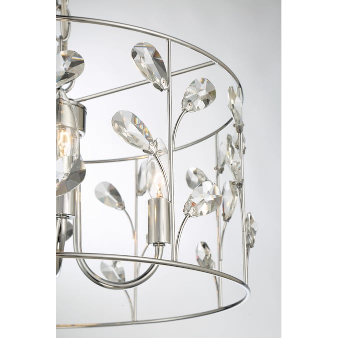 Botanically inspired chandelier features clear crystals accented by chrome. The petals alternate in direction, creating a patterned design that wraps around.