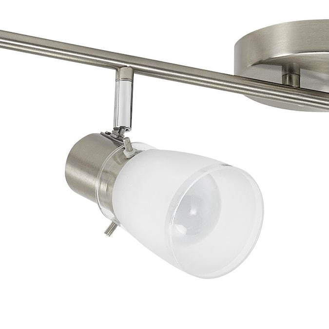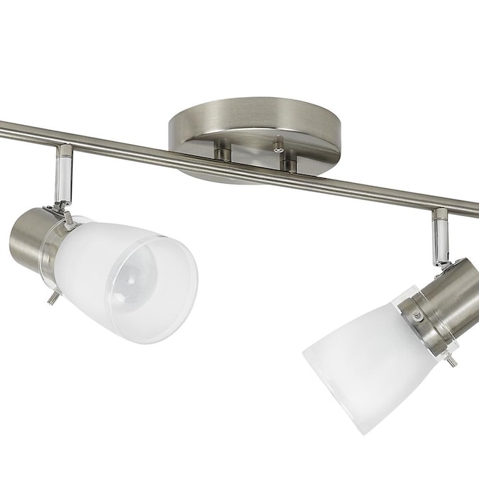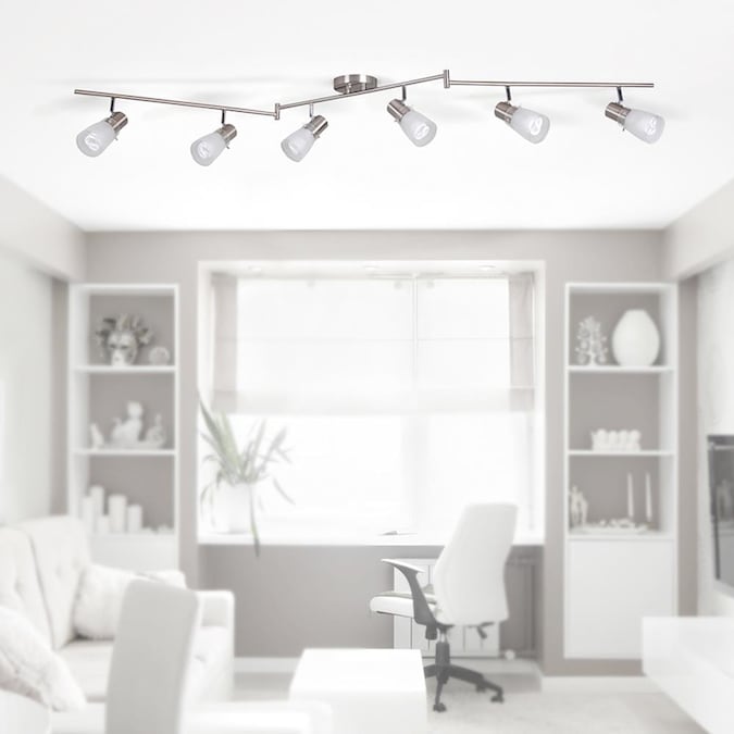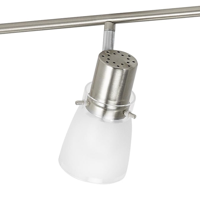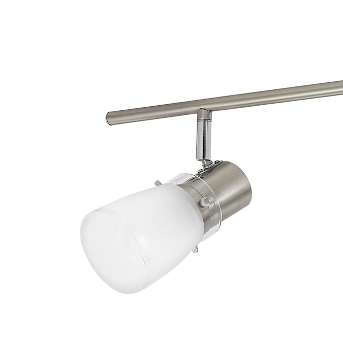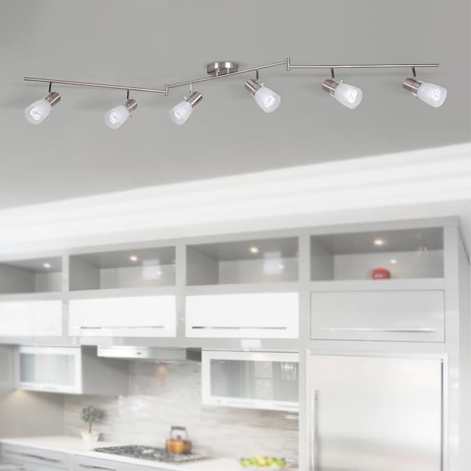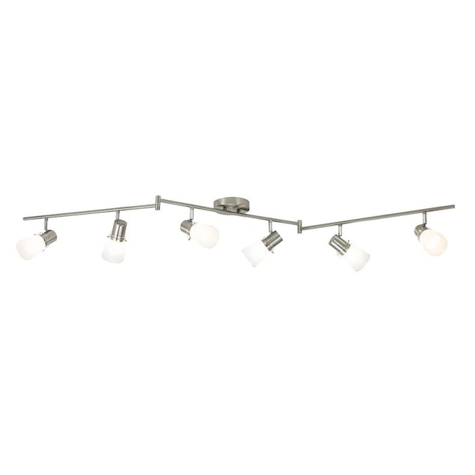 From the Montgomery collection, intriguing 6-light fixed track light kit in brushed steel finish. Contemporary white frosted glass shades. Featuring a versatile Z-bar design, and adjustable light heads to provide optimal lighting and countless configurations. Dimmable with standard household dimmers, so you can choose the exact amount of light you want every time you turn it on. Six 60 watt A19 bulbs required (not included). A simple DIY project that is sure to add warmth and style to any room in your home. Mounting hardware and easy-to-install instructions provided. Look for other Montgomery items to complete the look. Evolution Lighting extends a 1-year limited warranty against defects in materials and workmanship on this fixture.