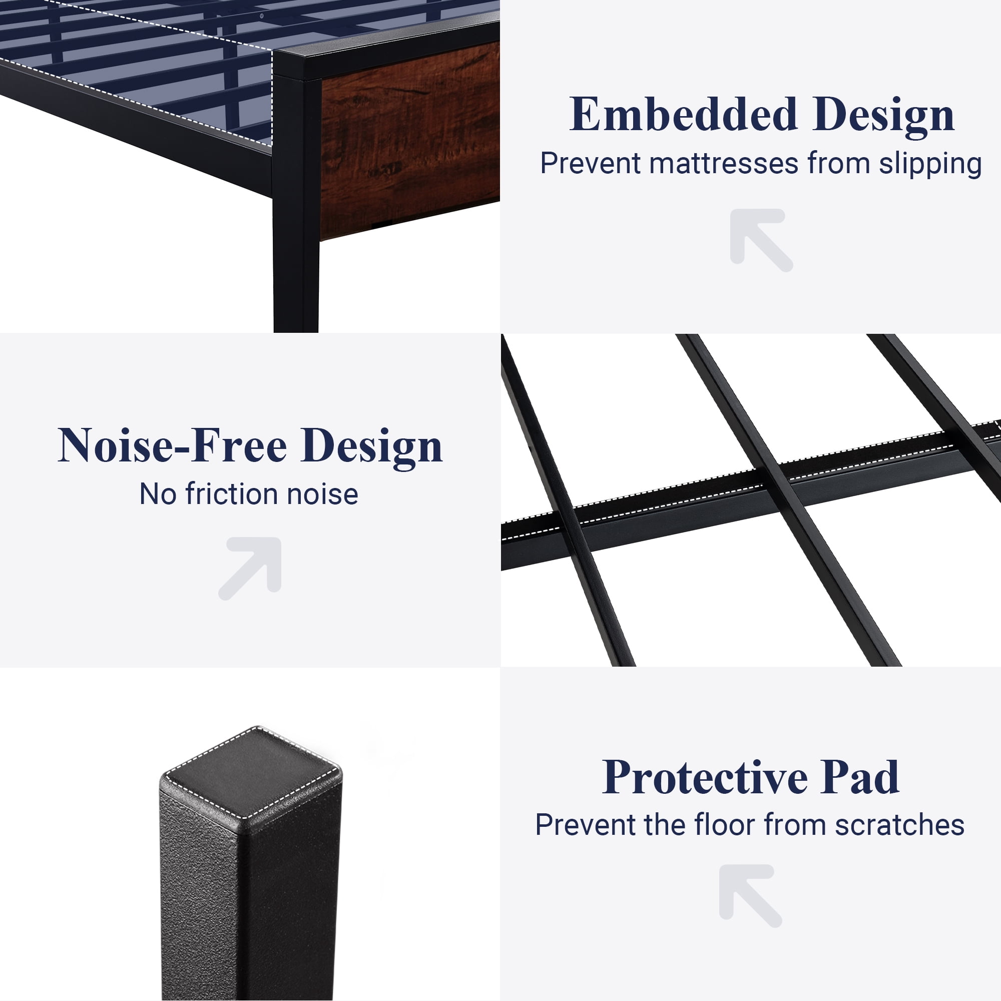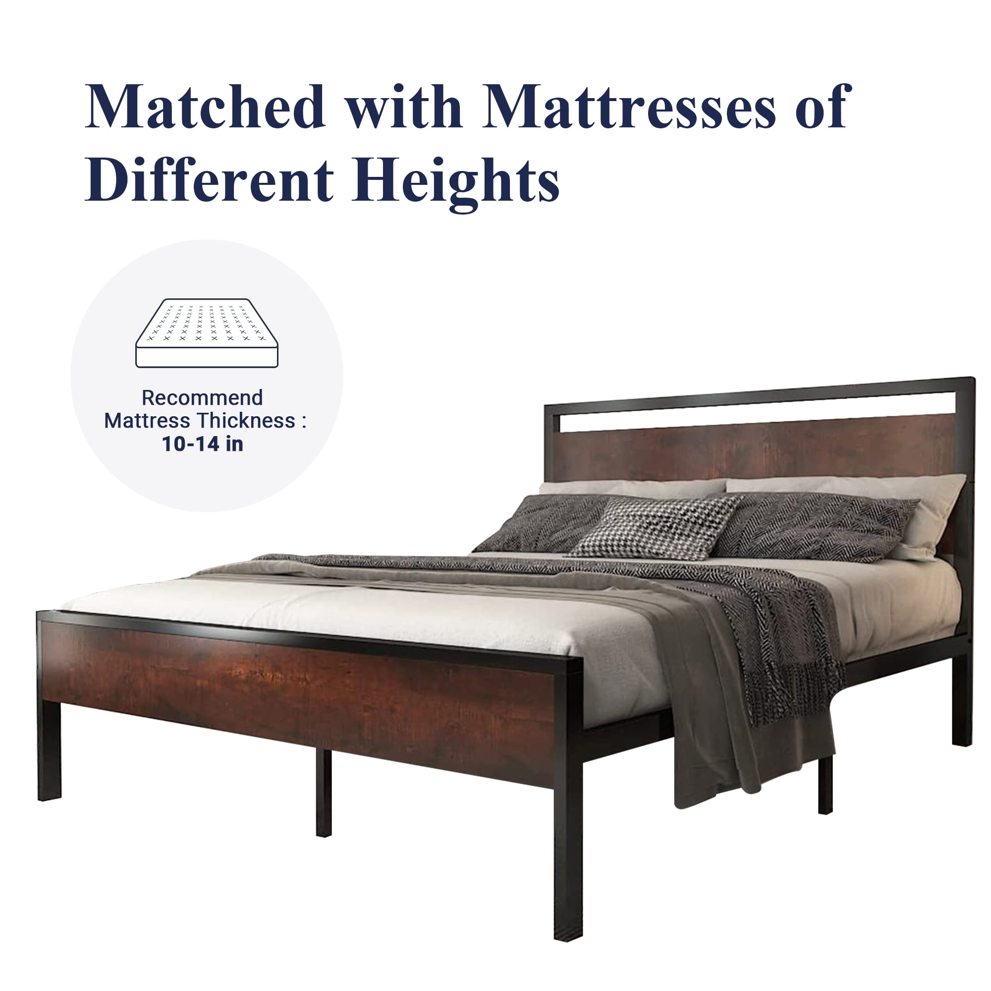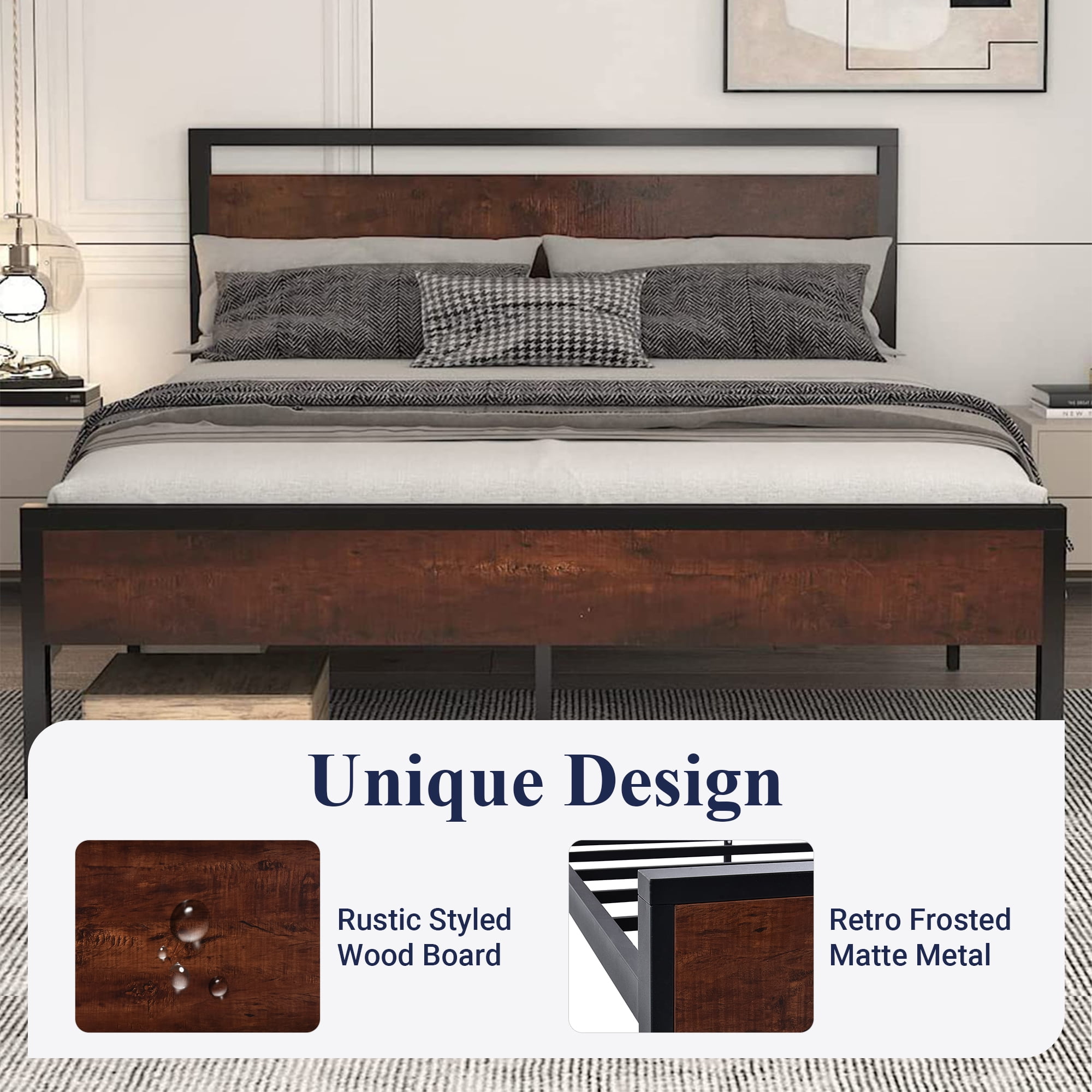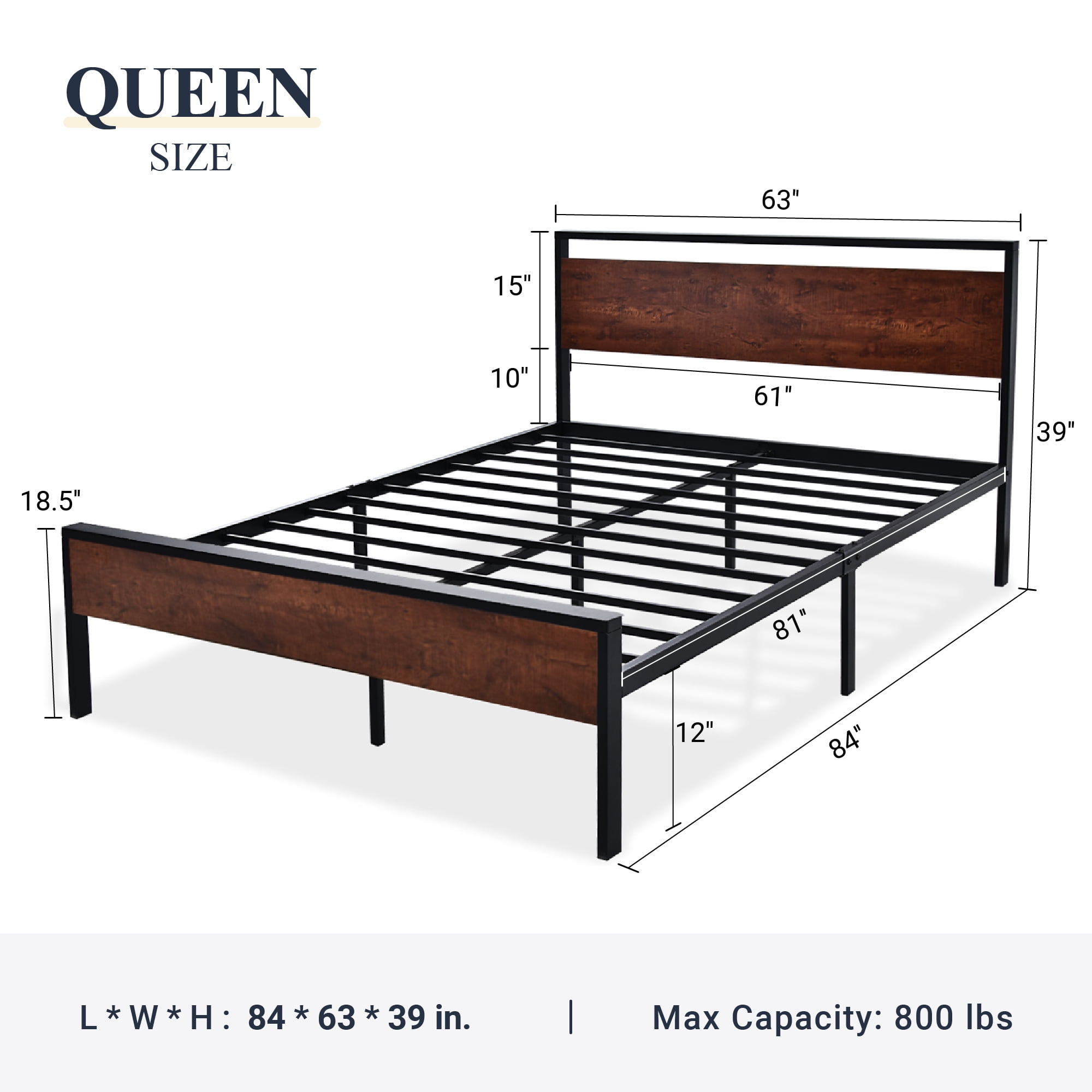 Feature: Sturdy & Durable: The design adopts the method of welding platform structure and using fixed screws. 12 strong steel slats and 9 independent support legs can withstand up to 800 lbs capacity. Unique Design: The combination of rustic style headboard and footboard and durable metal slats gives a strong industrial / rustic flair, enriching your room with industrial and unique individualism. The wooden headboard consists of a waterproof & scratch proof wood board. Extra Storage Space: Our square bed frame is built with 12″ space for storing stuff and easy cleaning. No worries about limited storage space in the bedroom anymore. Noise Free: We provide non-slip strips pressed on the slats and plastic foot plugs to keep your floor away from damage and prevent noise. Easy Assembly: Our bed frames are easy to install and require no special tools. All the things are in one box. You can finish it in about 30 minutes. If you have any problems, please feel free to contact us. Specifications: Brand: Allewie Size: Full / Queen Color: Walnut / Sanders Weight Capacity: 800 lbs Material: Wood Board & Metal Box Spring Required: No Assembly Required: Yes Package Included: Bed frame, Slats, Headboard, Footboard, Instruction, Hardware (Mattress not included) Additional Features: No Box Spring Needed, Fade Resistant, Heavy Duty Metal Slat Support, Spacious Under bed Storage, Squeak Resistant Dimensions: Full: 80″L x 56″W x 39″H Queen: 84″L x 63″W x 39″H King: 84.4″L x 78.2″W x 39″H
