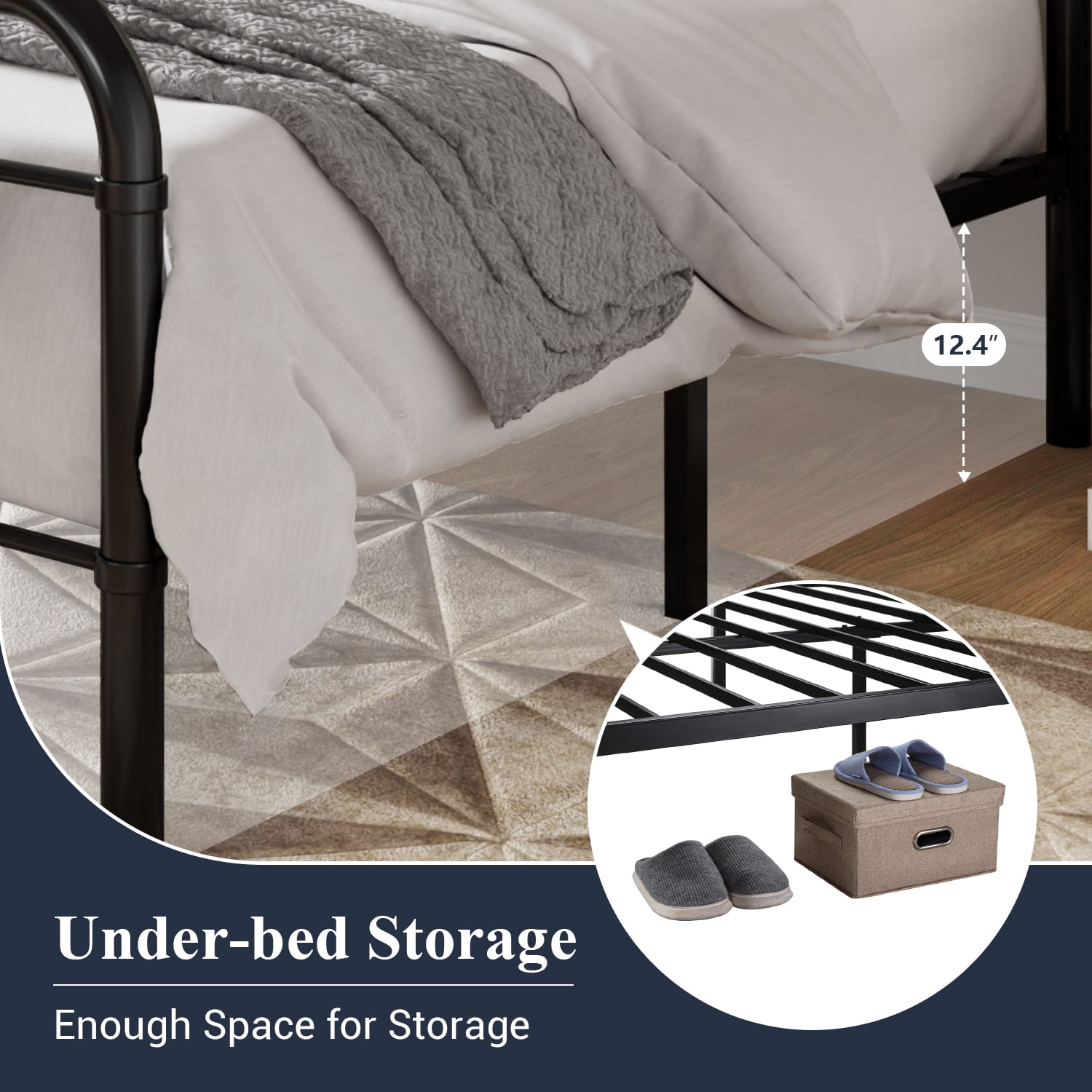 Features: Vintage and Classic Platform Bed: The bed frame is visually rustic but can be matched with different styles of home decoration to create a diverse bedroom. Slatted Support and Under-bed Storage: Metal slats extend the life of the mattress, and don’t need to buy box springs. The high bed foot(12.4 inches) design frees up more space under the bed, which is good for us to store other items. High Headboard and Safety Design: The moderate height of the headboard allows you to lean against the head of the bed and the curved bed corners ensure the safety of your head. Sturdy and Durable: The sturdy metal structure has a load-bearing capacity of up to 800 pounds, and the thickened bed foot makes the bed not shake. The powder coating on the surface makes the product have a certain degree of rust resistance and wear resistance. Easy to Assemble: We have the necessary assembly tools, and the installation process only takes 30 minutes and saves a lot of time. Specifications: Available Size: Full / Queen / King Available Color: Black / White Material: Metal Style: Victorian Maximum Weight Recommendation: 800 Pounds Included Components: Headboard, Assembled Tool, Slat, Instruction, Footboard (Mattress not included) Dimensions: Full Size Dimensions: 77.9″L x 54.3″W x 47.6″H Queen Size Dimensions: 82.9″L x 60.6″W x 47.6″H King Size Dimensions: 82.9″L x 76.4″W x 47.6″H Unlock More for Allewie products