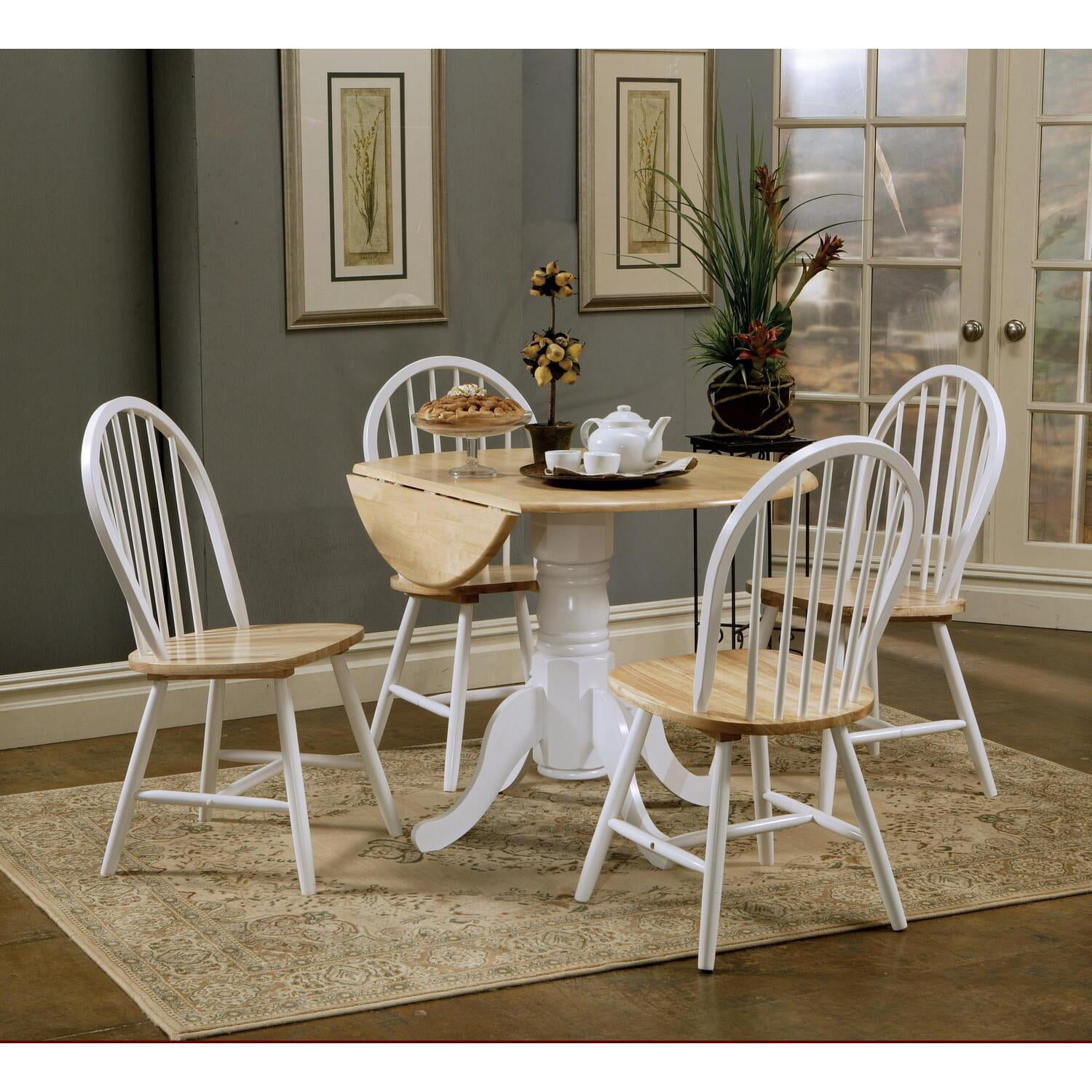 Table has a smooth round top atop a thick white pedestal base with four gracefully curved feet Two-tone white with natural wood tone for your country decor Drop down leaves save space when not in use Seats two to four