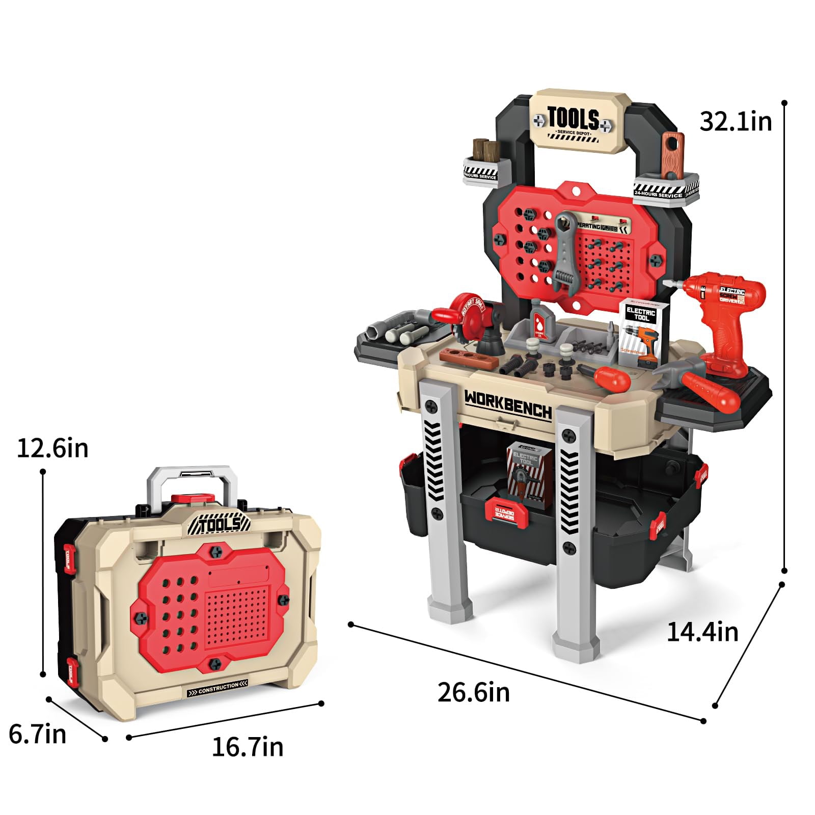 【Safe Materials】 Toy tool bench is made of high-quality ABS plastic, more durable and more environmental. Easy to assemble and disassemble, no odor, smooth surface, no sharp edges and children can play safely. 【Kids workbench with clothes】 This toddler work bench comes with a power drill and different heads to practice, a mechanical miter saw, a screwdriver with screws, nuts, and bolts, a claw hammer, and different wrenches, a plier, a hand saw, and other play tools. Which helps your kid enhance his creativity and build new skills at a young age. 【Tool Box & Workbench in One Design】 You can turn a toolbox into a tool bench by assembling, and when you’re done playing, you can take it apart and turn it back into a toolbox. Designed to be compact and convenient, your child can easily carry it around whether travelling, partying or in the backyard. 【Develop your child’s skills】 Well-built kids tool set features high-quality materials and a steady structure, making it safe for kids to entertain for a long time. The tray underneath the kids workbench is large and deep enough to hold all pieces. The table top of the toy workbench is great for pretending to cut or drill, giving kids’ imagination a boost. 【Perfect gift for kids ages 3-5】 The perfect gift for birthday parties, awards, prizes, Christmas, New Year and other occasions for children aged 3-5 years. If you are not satisfied with the tool toy for any reason, please contact us immediately.