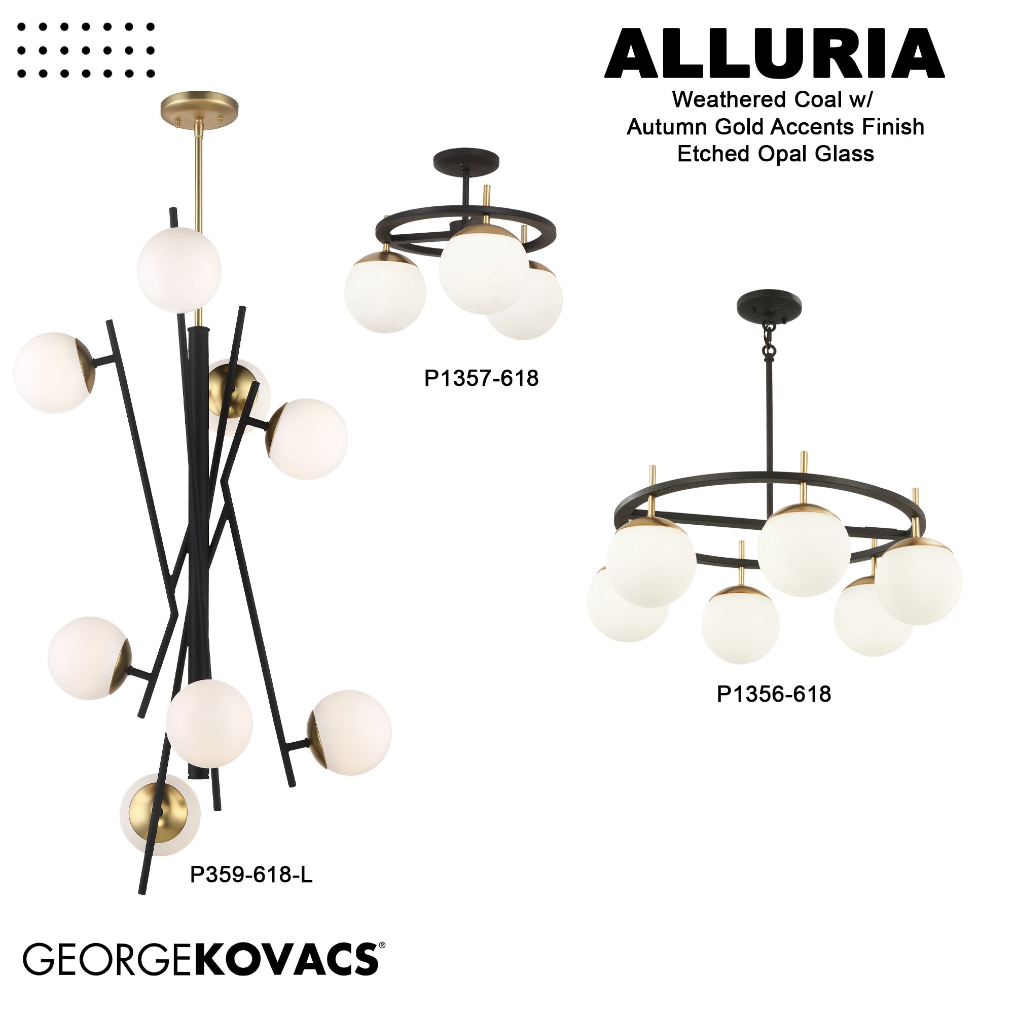 A unique Weathered Black finish with Autumn Gold highlights an exceptional contrast with perched. Etched White glass shades. A variety of designs offers a complete collection with a nod to Mid-Century Modern styling. The tri-color palette is fashionable yet extremely versatile and the minimalist design makes this fixture an ideal complement for modern décor.