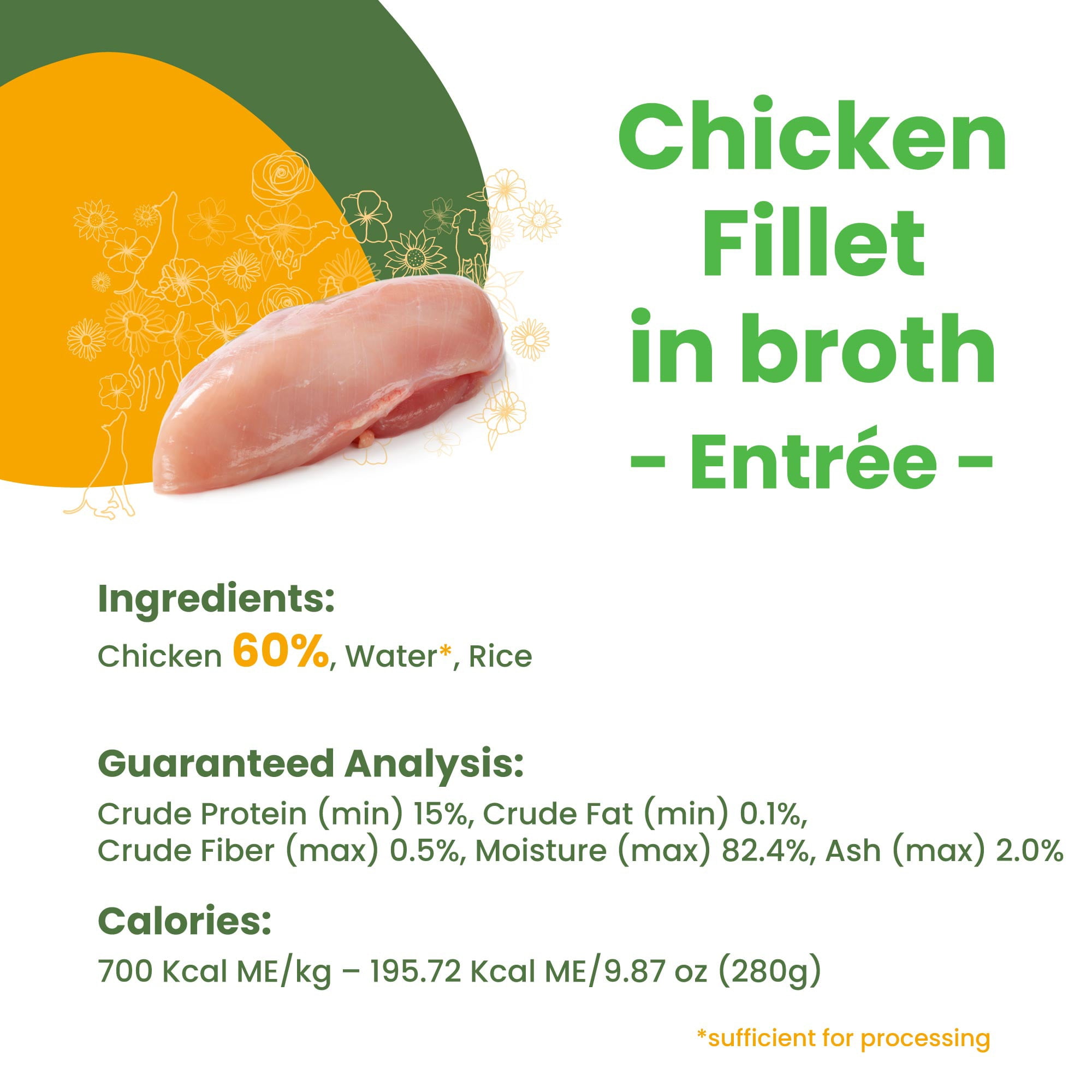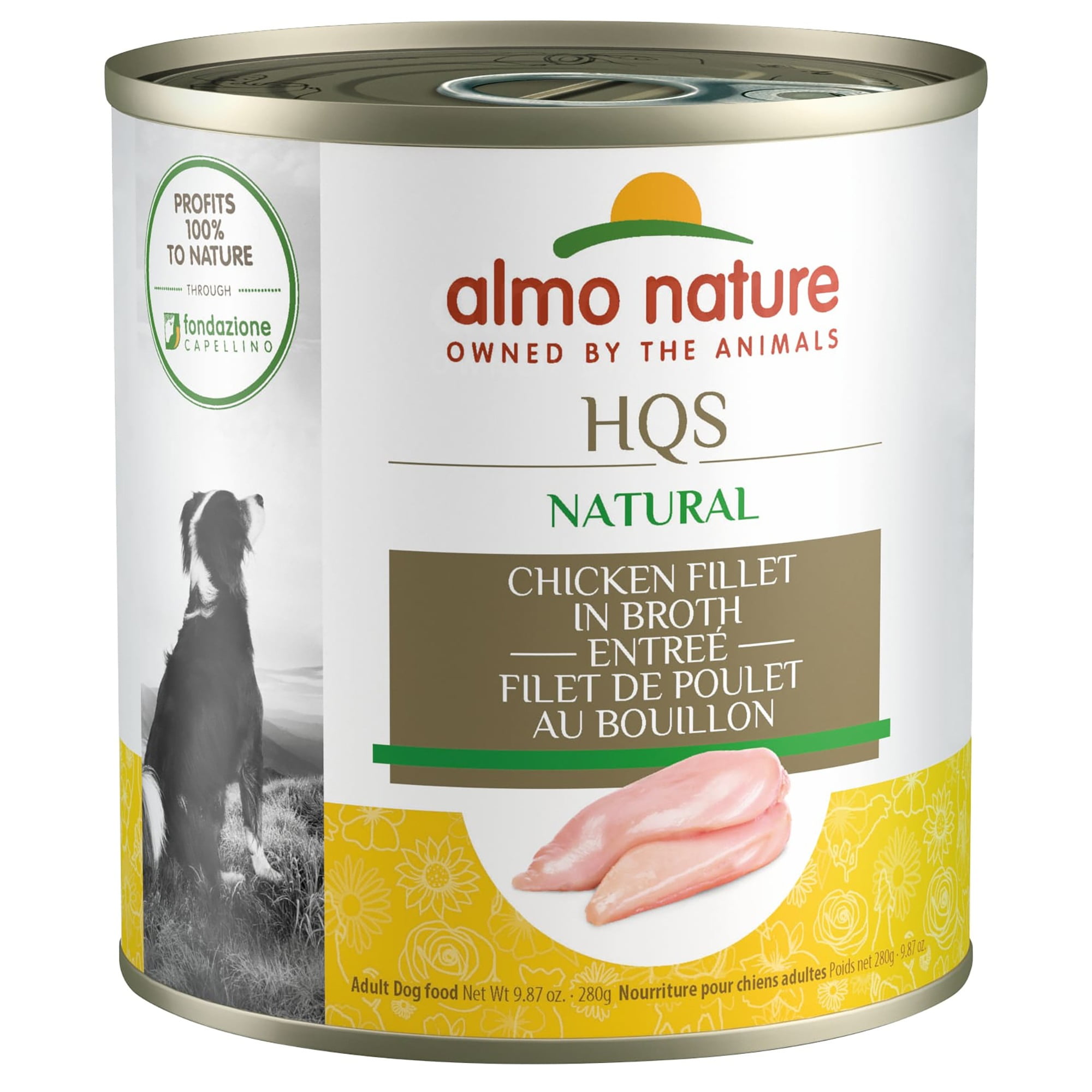 ALMO NATURE HQS NATURAL CHICKEN FILLET ENTREE IN BROTH: ADULT CANNED DOG FOOD delivers healthy simplicity: real, all-natural shredded chicken breast as the first ingredient, cooked in minimal water to create a moist, tasty broth. LIMITED INGREDIENTS: Chicken Drumstick 60%, Water Sufficient For Processing, Rice.You’ll be happy to know that the chicken is HQS (High Quality Sourced)—a term used to describe meat and fish that was originally fit for human consumption and is now solely used for pet food to help nourish your furry friend. This tasty recipe also contains a small percentage of fiber-rich rice to help maintain intestinal flora, lysine and magnesium levels. Free of preservatives and additives, and a naturally rich source of highly digestible proteins (min. 15%), essential amino acids and micronutrients, it’s a nourishing and delicious meal that’s sure to appeal to your companion’s inner wild canine. An excellent complement to a dog’s daily diet and helpful in case of exclusion diets, obesity (low fats, high proteins) and an excellent source of hydration during the summer season. Our products come with a 100% satisfaction guarantee.Almo Nature is a pet food brand owned entirely by Fondazione Capellino, a non-profit commercial body with a mission to protect biodiversity and combat climate change. 100% of Almo Nature’s revenues are allocated to activities benefiting all living species and our shared home, Planet Earth, rather than only to a few. Choose the best for your pet and our planet.