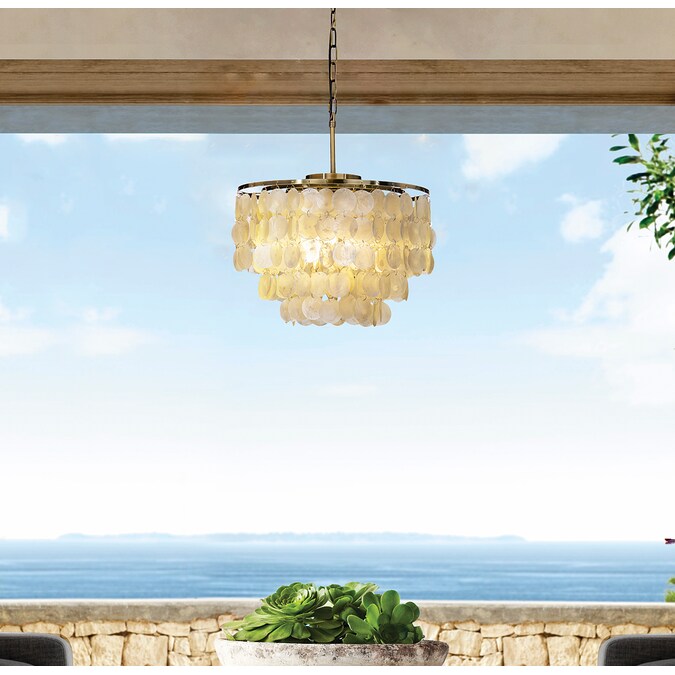 A grand unique piece that adds lustrous natural beauty to any room. Our exclusive waterfall capiz chandelier lighting is composed with over 300 white capiz disc by hand, arranging the shells in flowing tiers over a antique bronze frame in a gorgeous cascade. This timeless chandelier is the perfect lighting piece for over your dining table or kitchen island. Three 40 Watt bulbs provide ample light for your space while making the shells glow at the same time.