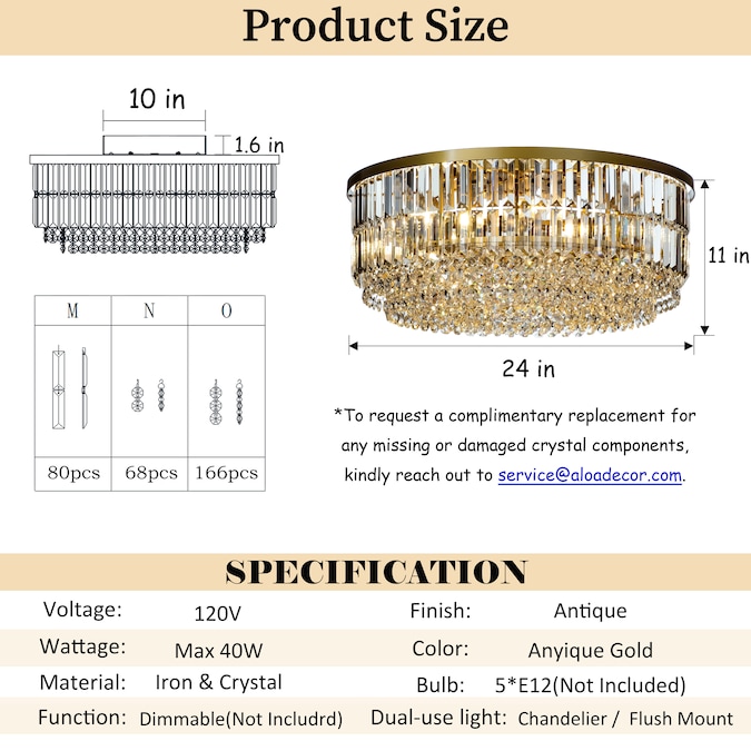 - Dual-use light : chandelier or flush mount ceiling lighting