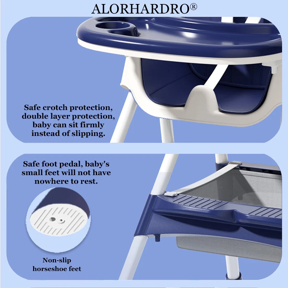 4 IN 1 HIGHCHAIR – The high chair with adjustable height can be matched with tables with different heights. It can be assembled into a high chair, which enables children from 6 months to 5 years old to eat at the table. It can also be assembled into a small stool to accompany unisex children’s growth. In addition, it can also be folded and placed in a very narrow space. At the same time, the classic and exquisite appearance will add luster to your house. Simple and modern style is suitable for any decoration of your living room, dining room or bedroom. REMOVABLE PU CUSHION – The soft and thickened seat cushion is made of skin-friendly PU material. Hygienic and safe materials can be suitable for children ages 6 months to 5 years. The waterproof surface is easy to wipe. Simple stains can be cleaned directly with paper towels. This is a parent-friendly product. However, it is not recommended to wash the seat cushion with a washing machine, which will easily deform the seat and shorten the service life of the seat. The seat adopts a non-displacement design and ergonomic design, and the seat cushion will not slide or shift, so children can change their posture at will and sit more comfortable. At the same time, it also reduces a lot of trouble for parents to feed children. STABLE STRUCTURE – It is designed as an A-shaped structure. The special horseshoe foot of the chair provides four angles of support. The feet are made of rubber, which can not only protect the floor of the home, but also increase the friction with the ground and play a greater non-slip role. The support of the chair is adjustable in height. The seat also adds a strap, which is a five-point safety belt to regulate your baby’s sitting posture. This reflects our protection awareness and safety consideration for children. In addition, 4 pulleys were also given as gifts. The pulley can be locked to stay still. If you want the high chair to be more stable and safe, parents are advised not to use pulleys. Installing the pulley is just more convenient for it to change its position. VARIOUS UPGRADED ACCESSORIES – The high chair comes with detachable tray, detachable toy rack, bowl with suction cup, bib and storage basket. This will bring more convenience to parents. The removable tray can be removed for cleaning at any time.The detachable toy rack can make children eat more happily. Bowls with suction cups can prevent children from playing and spilling food. A bib can solve the problem of food dirtying clothes. The storage basket can store some commonly used things to save space. HIGH QUALITY – Safety is an important consideration as well, we seriously declare that it is BPA free.This material will not affect human health. Your children is ready for the journey from bottle feeding to independent eating. EXCELLENT SERVICE – If you encounter difficulties during installation, please contact customer service in time. We will provide you with video or picture installation instructions within 12 hours. Please pay attention to the size of the product and clarify your requirements before purchasing. Due to the large volume and weight of the product, we hope to avoid causing unnecessary after-sales trouble to the buyer and carrier. Thank you for your understanding! All images and videos were designed and filmed by ALORHARDRO. Unauthorized use is not allowed. If any discovery is made, it will be held accountable.
