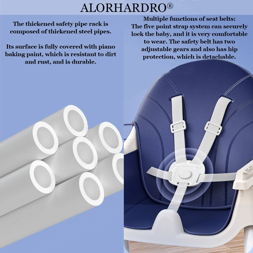 ALORHARDRO high chair on the table is essential for your family during the meal time. It has three seat height settings. The seat has been equipped with a five-point seat belt and tray. This makes it possible for your children to talk at the table. The adjustable design allows your baby to grow with you and make it continuously available. The high chair includes the transition function, so that your growing child can enjoy every meal. As the unisex baby grows up, the footstool will be adjusted according to the baby’s height in the high chair and baby chair mode. In addition, the baby chair mode allows your child to enjoy playing and various activities. The high chair comes with toys, bowls, spoons and other accessories. The fun of eating now begins. The seat cushion and chair can be wiped, which keeps the equipment clean and sanitary at all times.