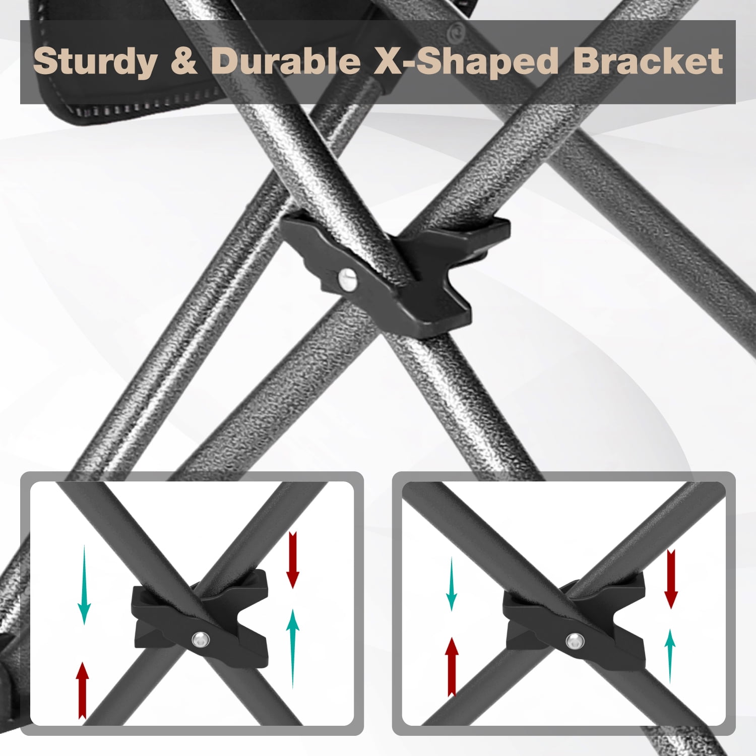 Sturdy Construction: Crafted with a powder-coated steel tube frame, this rocking chair effortlessly supports up to 300lbs, ensuring unwavering stability and comfort. Ground Versatility: Unlike traditional options, our chair can be effortlessly set up on rocky, sandy, or uneven terrain, providing a seamless seating solution in seconds. Sturdy and Reliable: The dependable steel frame guarantees a great seat that will last through numerous relaxing seasons, ensuring enduring comfort. Convenient Cup Holder: The side cup holder adds convenience, providing a secure spot for drinks, coffee, or water cups. Tailored Comfort: Engineered with an “I” shape headrest design, the pillow provides a snug and comfortable fit for your head, enhancing relaxation. Breathable Design: The mesh fabric back promotes breathability, ensuring cool comfort even on scorching summer days, allowing you to enjoy a refreshing drink. Versatile Outdoor Companion: Ideal for car travel, picnics, fishing, camping, beach outings, hiking, concerts, and various outdoor activities. Color: Black & Dark Blue Size: 24.80″”D x 38.17″”W x 39.37″”H Folded Size: 9.05″” x 38.58″” Fabric: Durable 600D Oxford Fabric, Steel Structure: Heavy-duty Steel Frame Load Capacity: 450 lbs Product Weight: 13.2