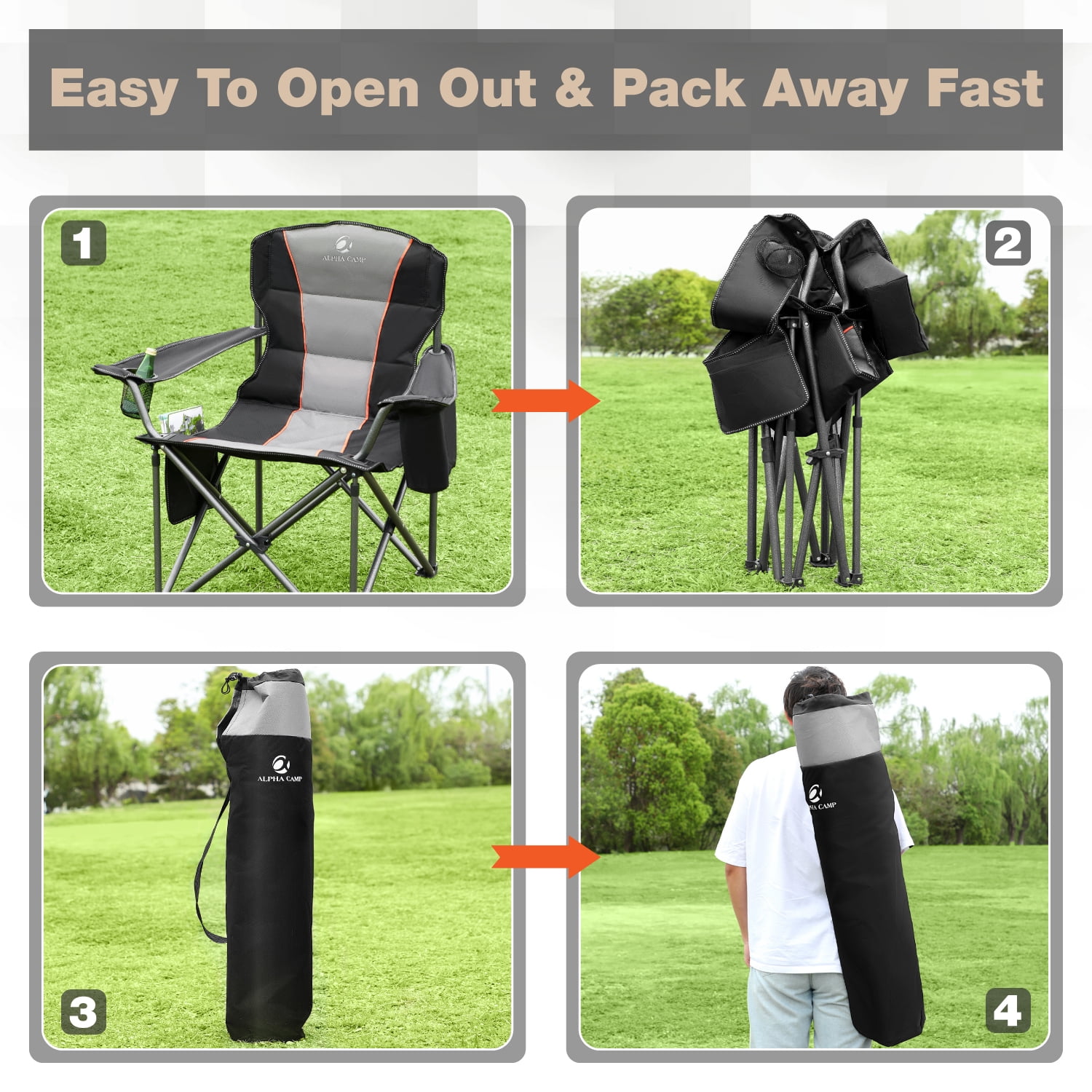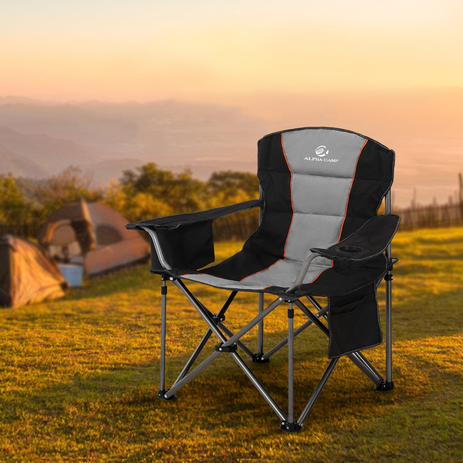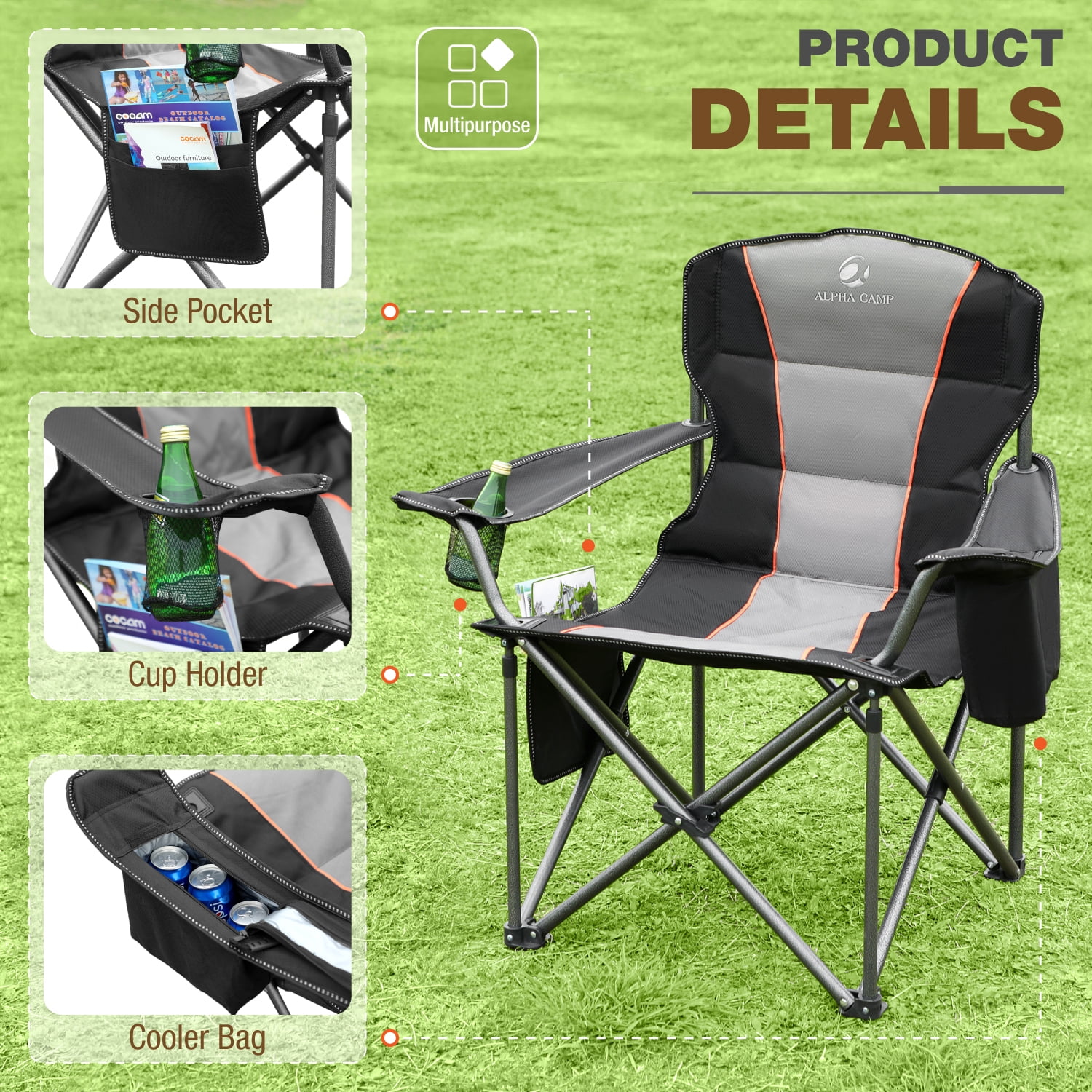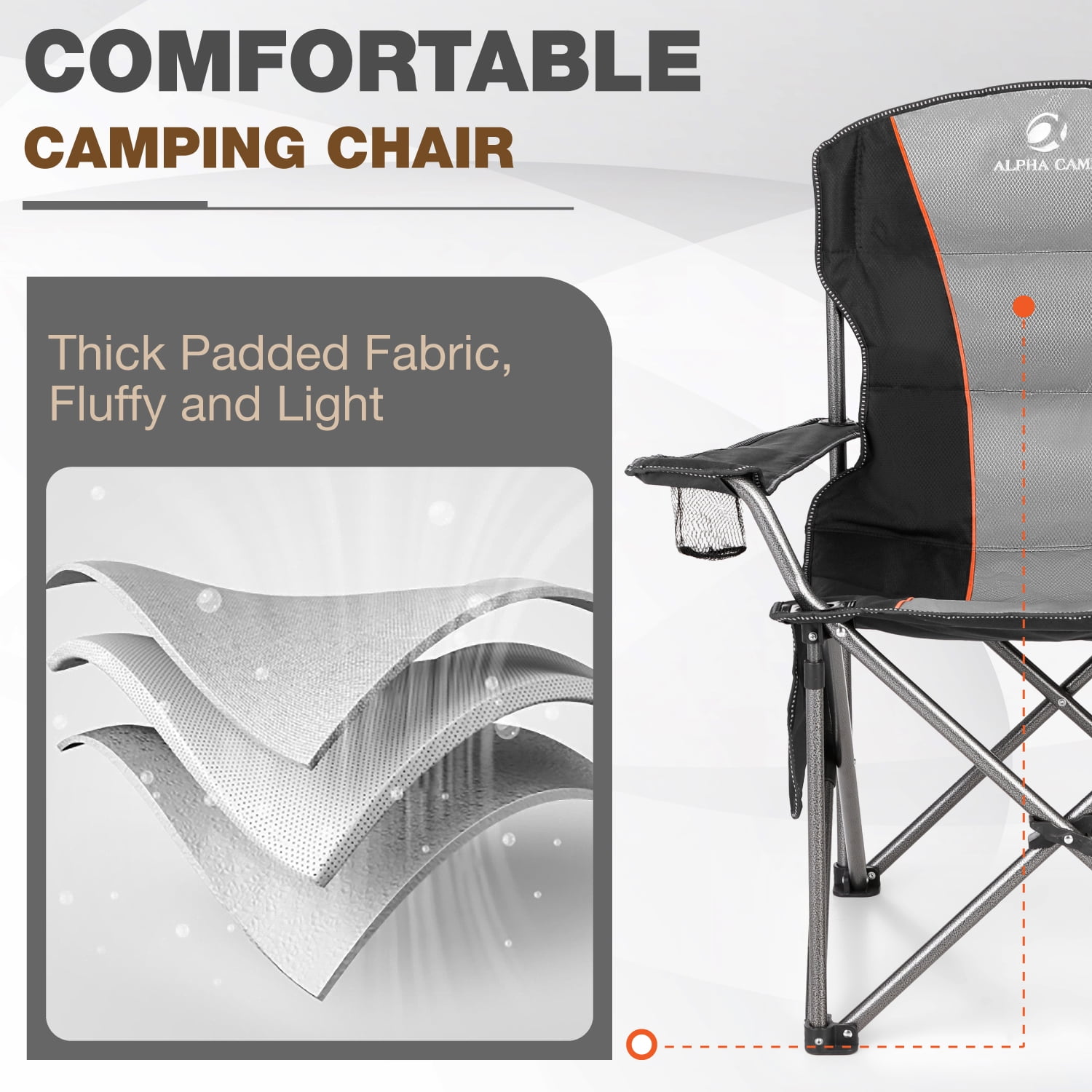Description Alpha Camper Foldable Camping Chair Oversized Padded Heavy Duty Portable Quad Chair. Enjoy a full day of relaxation on the Alpha Camper camping chair. This foldable and portable camping chair provides with oversize seat, padded headrest & armrest, large storage bag for your outdoor life. Our heavy-duty portable camping chair can hold up to 450 pounds, making it an ideal camping gear for camping lovers. The cooler bag design allows you to enjoy a cooler summer. The durable mesh cup holder and side pocket provide you for a large storage space. Whether you are heading for camping, road trip, beach, or fishing, grab your Alpha Camp chair and enjoy a pleasant time with your family and friends.