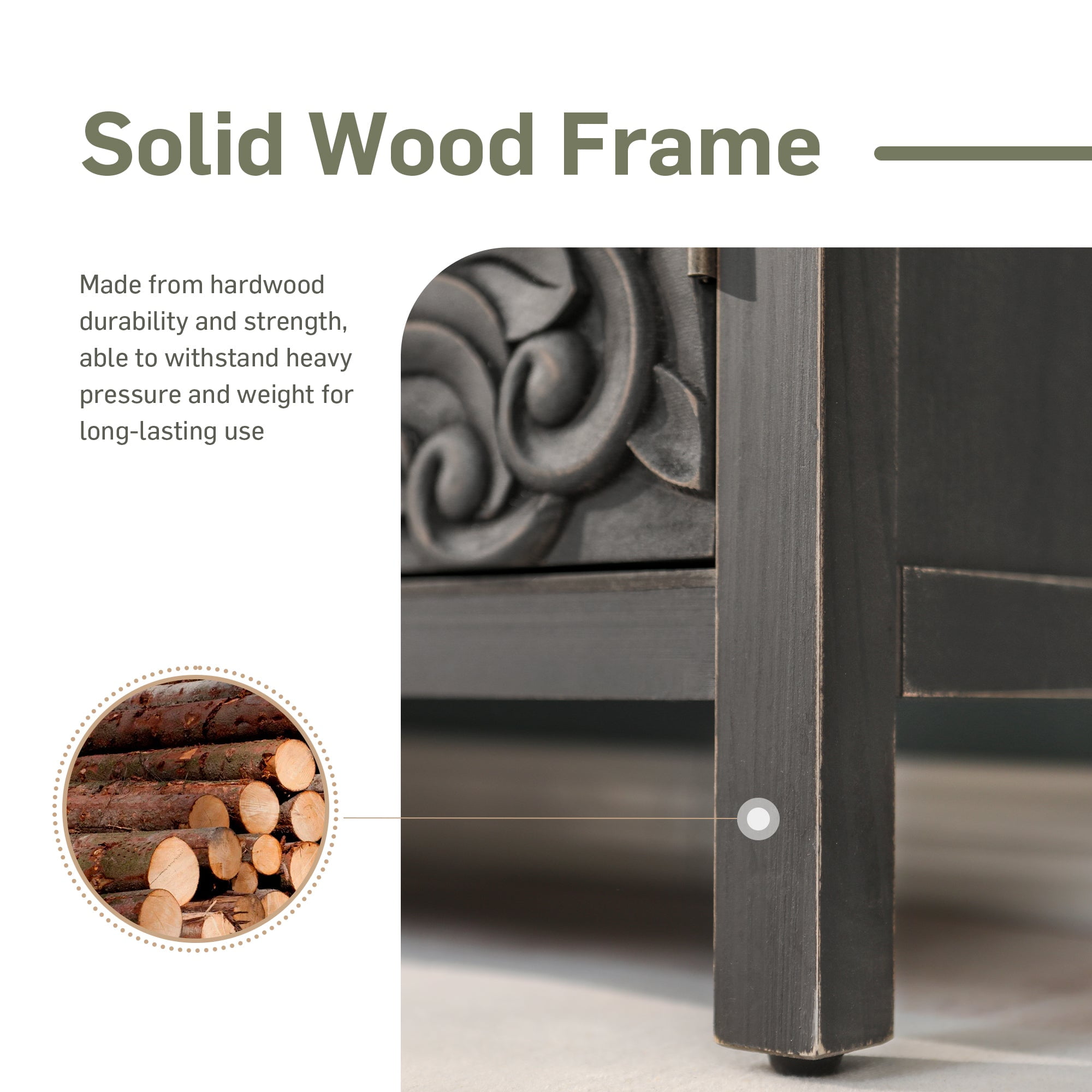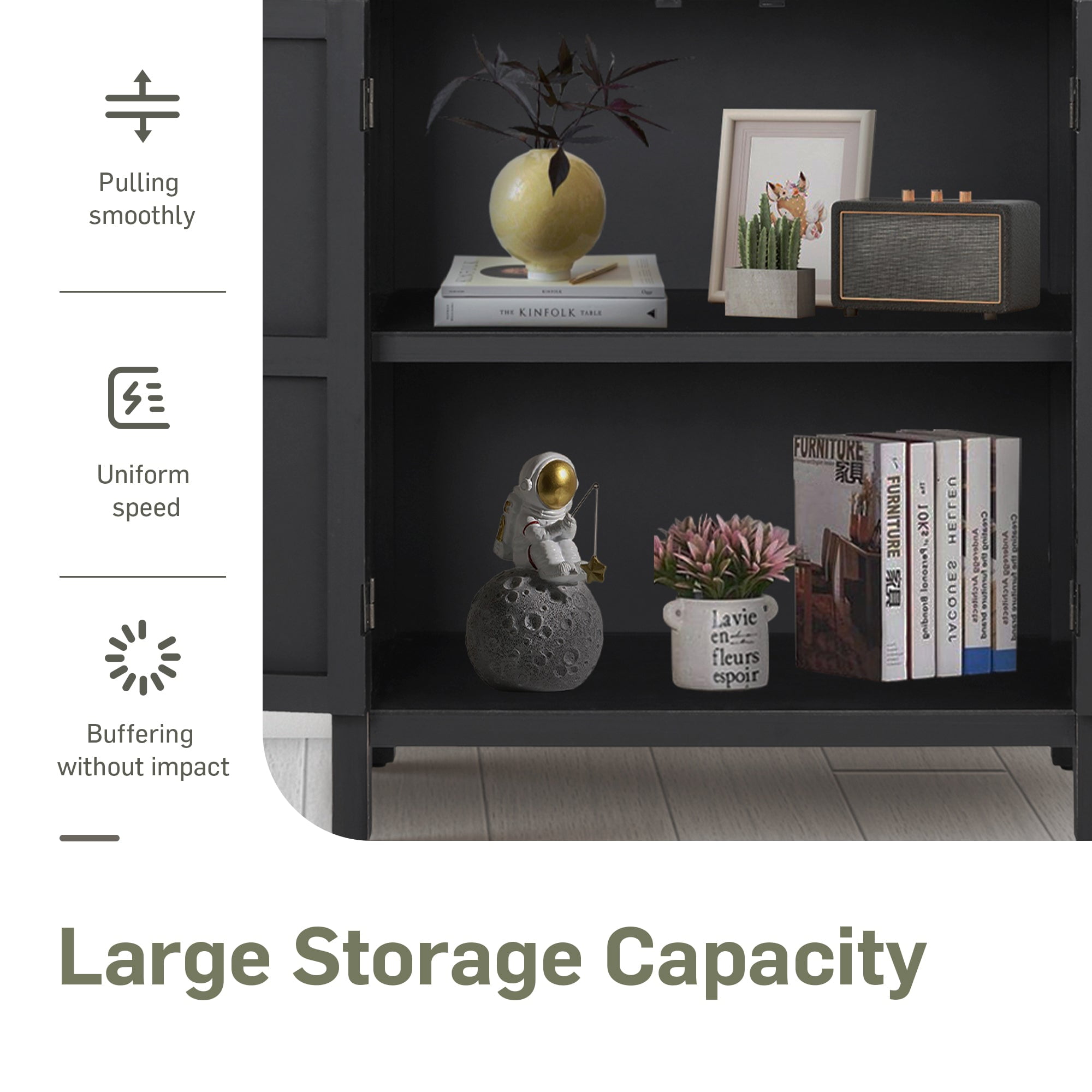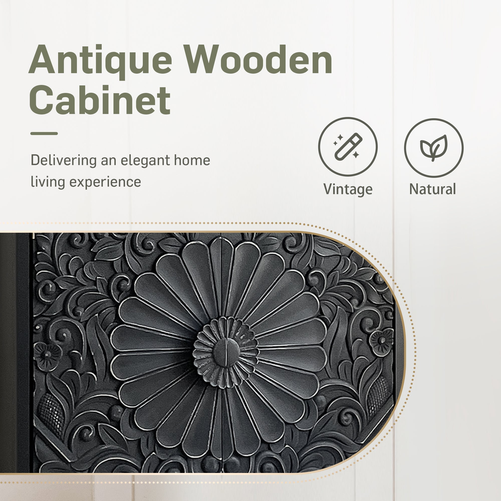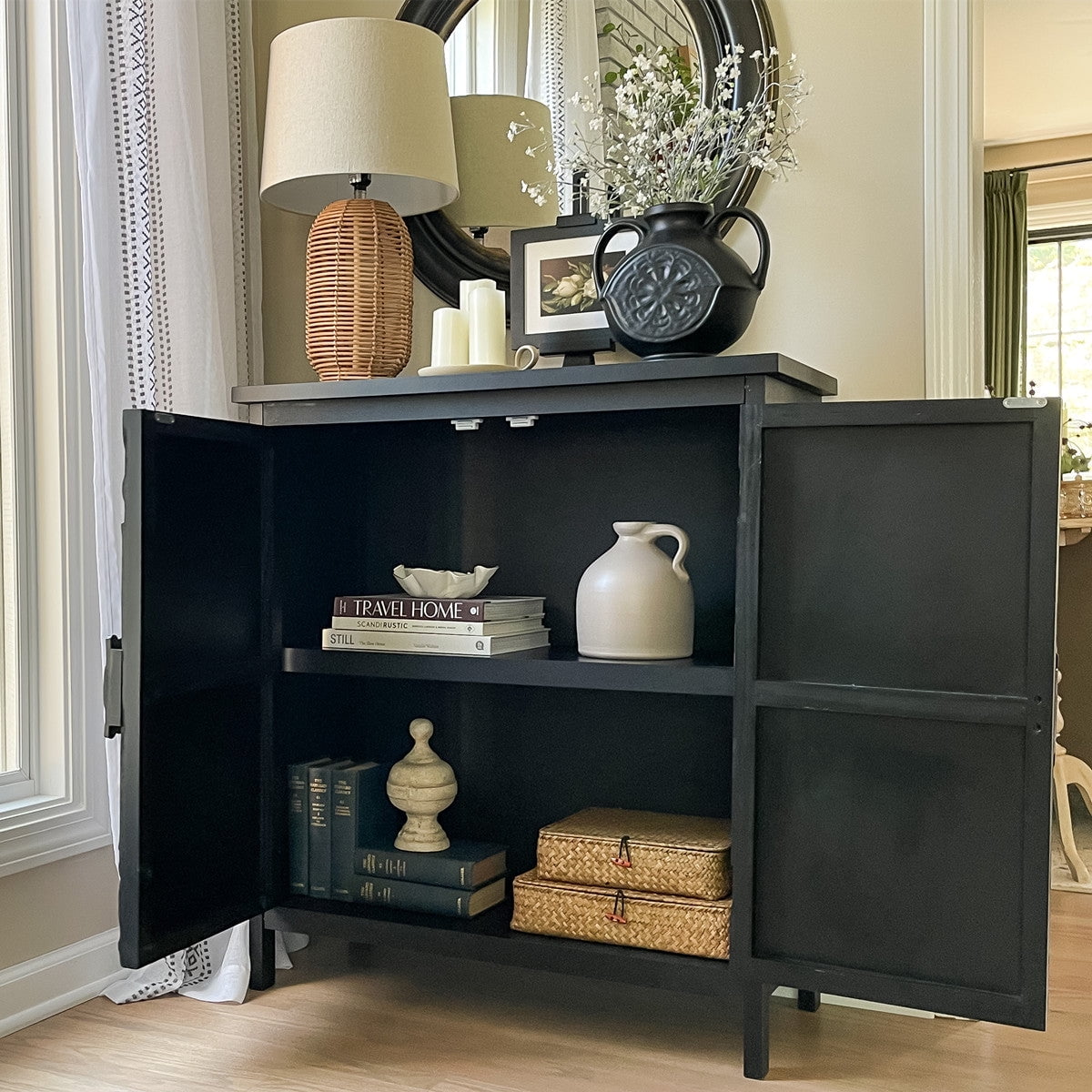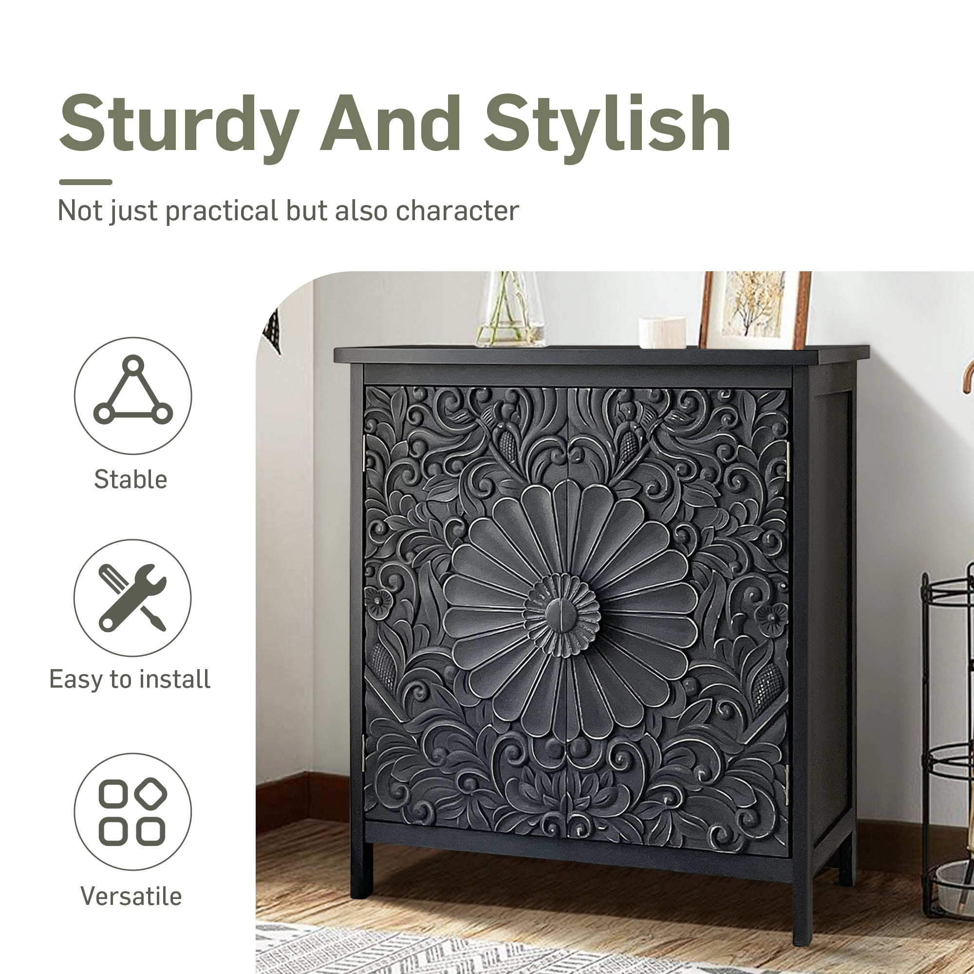 Alpha Joy Storage Cabinet with 2 Doors, Wood Accent Cabinet with Flower Pattern For Living Room, Dining Room, Black