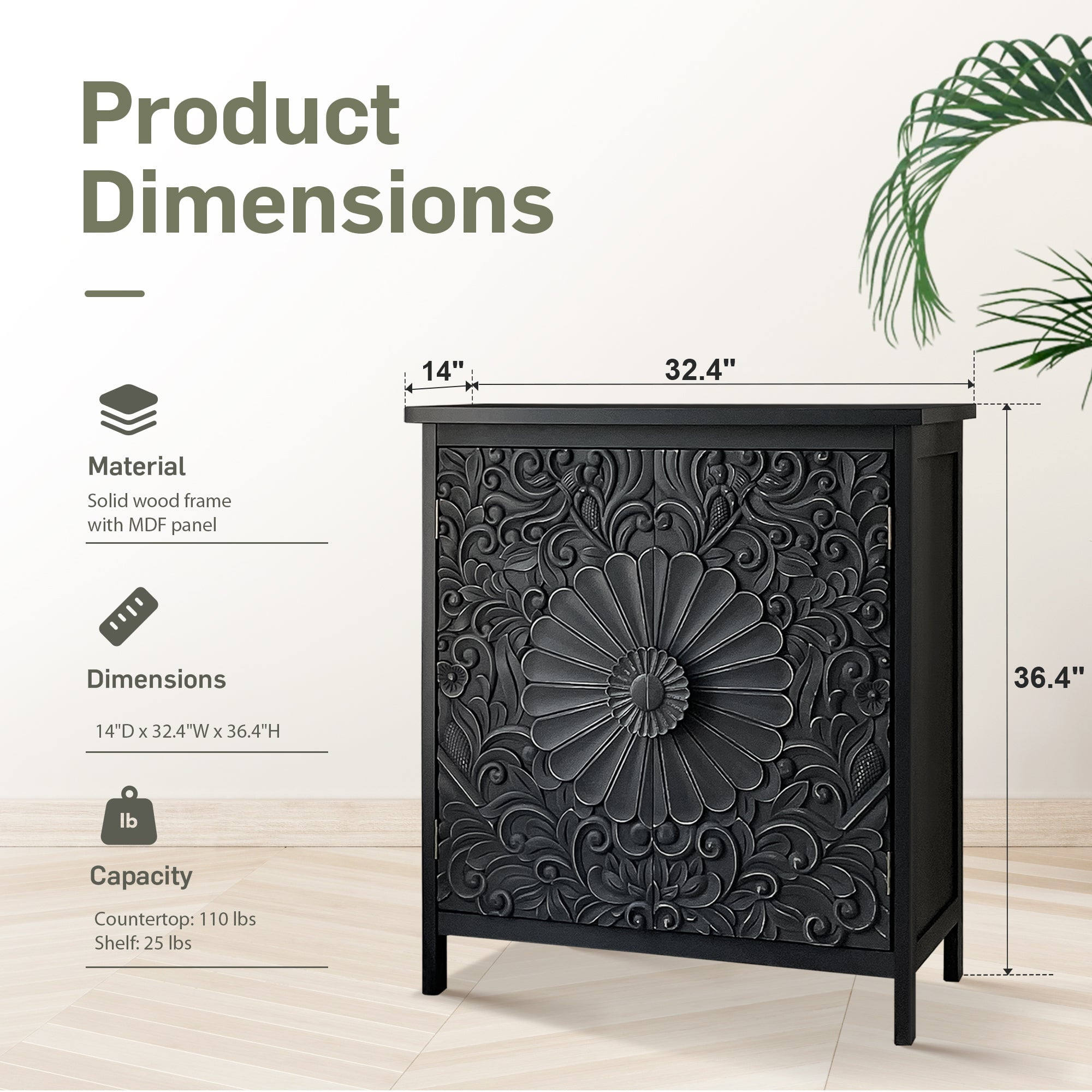 Large Storage Space: The cabinet measures 32 68″L x 14 17″W x 36 61″H featuring two doors and two tier shelves to keep your home organized High Quality Materials: Constructed from high quality medium density MDF board this cabinet is scratch and moisture resistant making it easy to maintain and clean Style and Appearance: The cabinet doors showcase a carved floral pattern adding a unique and elegant touch that complements various home decor styles Delicate Design: The black handle is designed for ease of use providing a delicate and soft feel for effortless opening and closing Multi functional Cabinet: Versatile enough to serve as a coffee/water bar cabinet kitchen storage entryway furniture or credenza making it ideal for kitchens dining rooms living rooms and entries