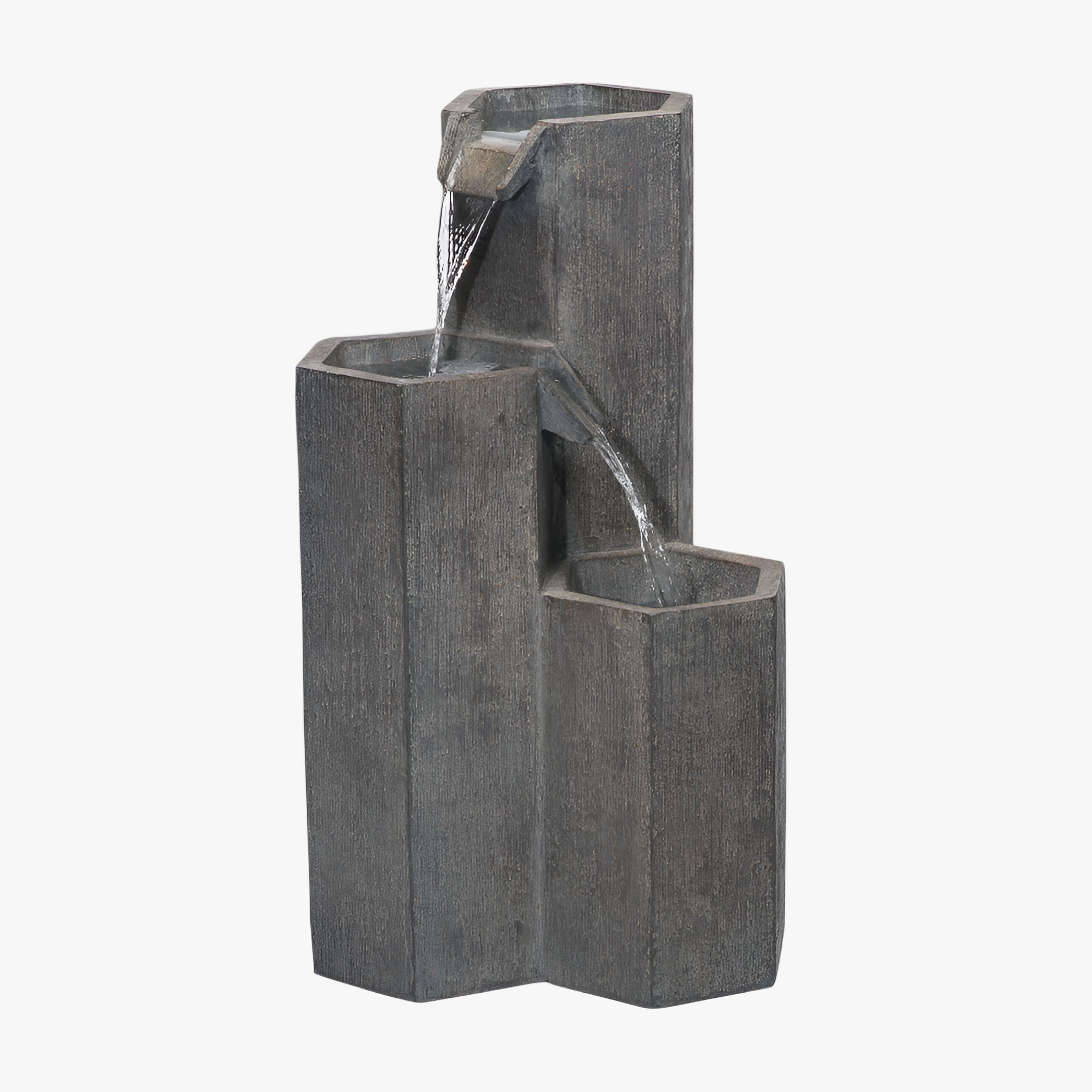 Enhance your indoor or outdoor living space with this 3-Tier Hexagonal Column Fountain with LED Light from Alpine Corporation. This 3-tier modern waterfall fountain floor statue provides a tranquil and soothing addition to your porch, backyard, or lawn. Constructed from durable polystone, this contemporary Zen water fountain is weatherproof, rust-resistant, and resilient. Relax to the sounds of the calming natural water flow as it trickles down from the tallest hexagonal column of the fountain, down to the lowest column. The weathered-looking columns have a rough texture that imitates natural stone. The fountain becomes illuminated with the integrated LED lights, providing you an ambient light source to your home’s interior or exterior decor. Not only will the fountain provide you with serenity, it will also attract birds to your outdoor area, which in turn promotes healthy gardens.. This standing fountain measures 14″L x 14″W x 25″H to fit almost any outdoor or indoor area and includes a one year manufacturer’s warranty from date of purchase.
