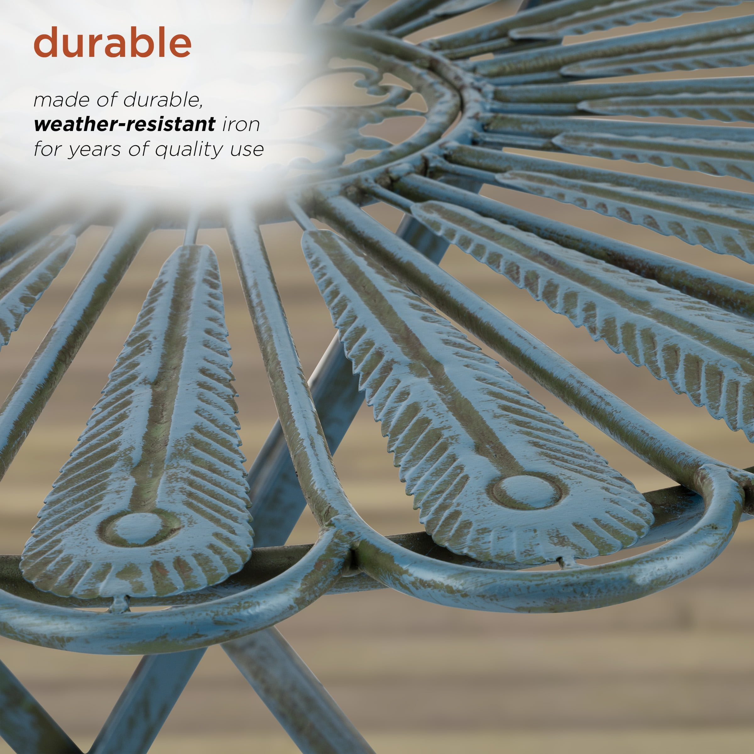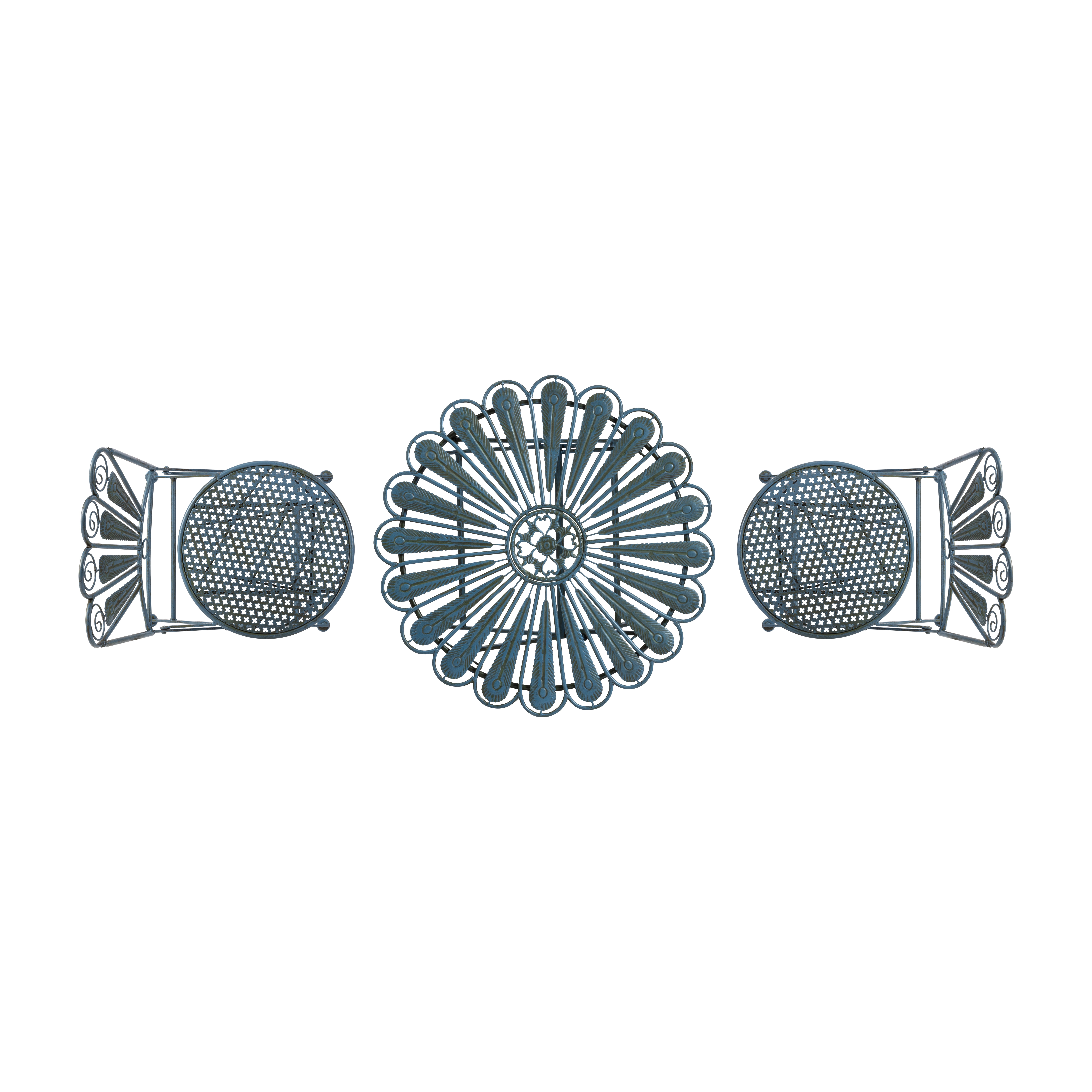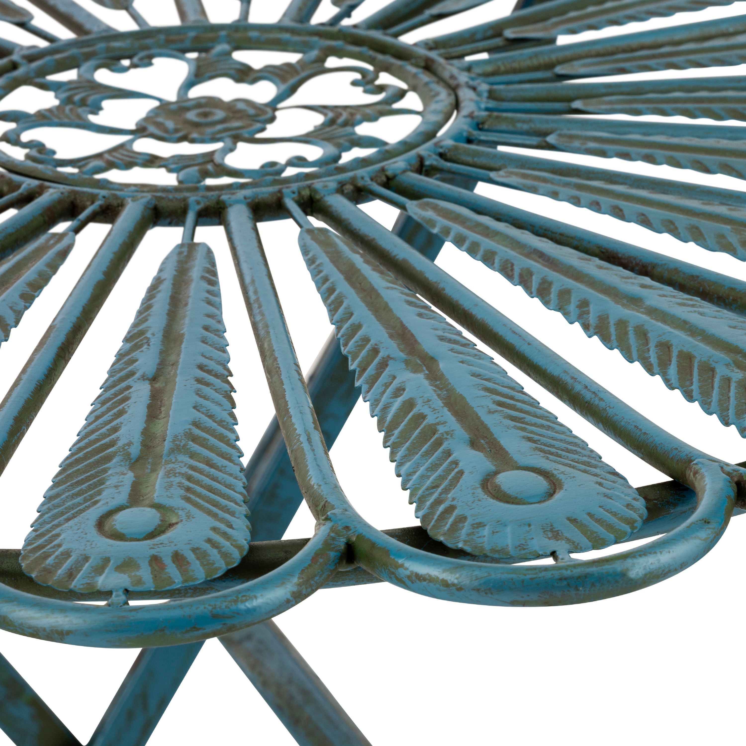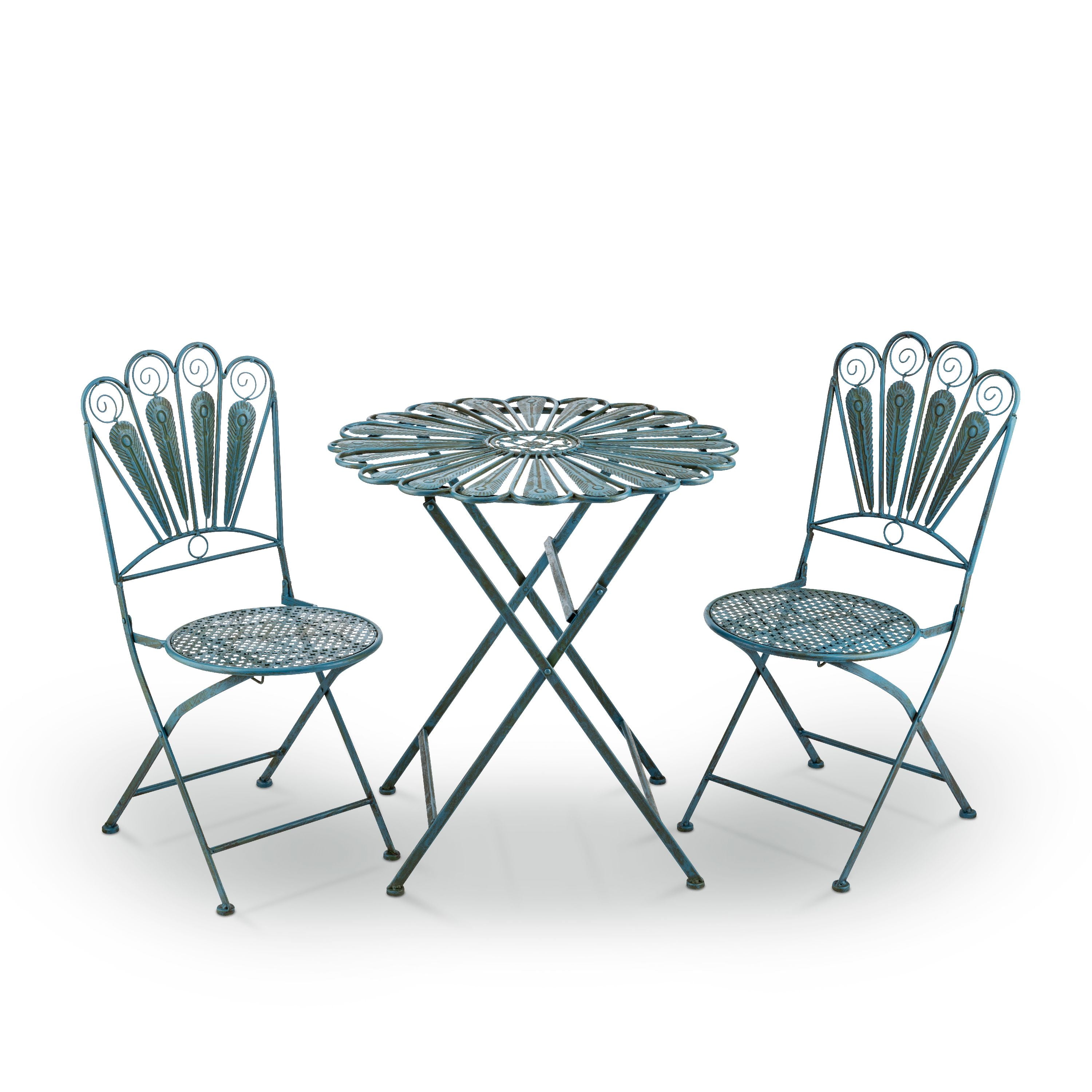 3-PIECE SET: Peacock-inspired bistro set includes round table and 2 matching chairs, perfect for your backyard, patio, deck, or garden EASY STORAGE: Chairs and table fold for easy storage during the off-season BEAUTIFUL DESIGN: Uniquely crafted peacock feather iron seats and tabletop with rustic blue finish add style and class to any outdoor atmosphere DURABLE: Made of durable, weather-resistant iron for years of quality use COMPACT SIZE AND ONE-YEAR Support: Table measures 29″L x 29″W x 30″H and chairs 16″L x 21″W x 36″H, and includes a one-year manufacturer’s Support from date of purchase