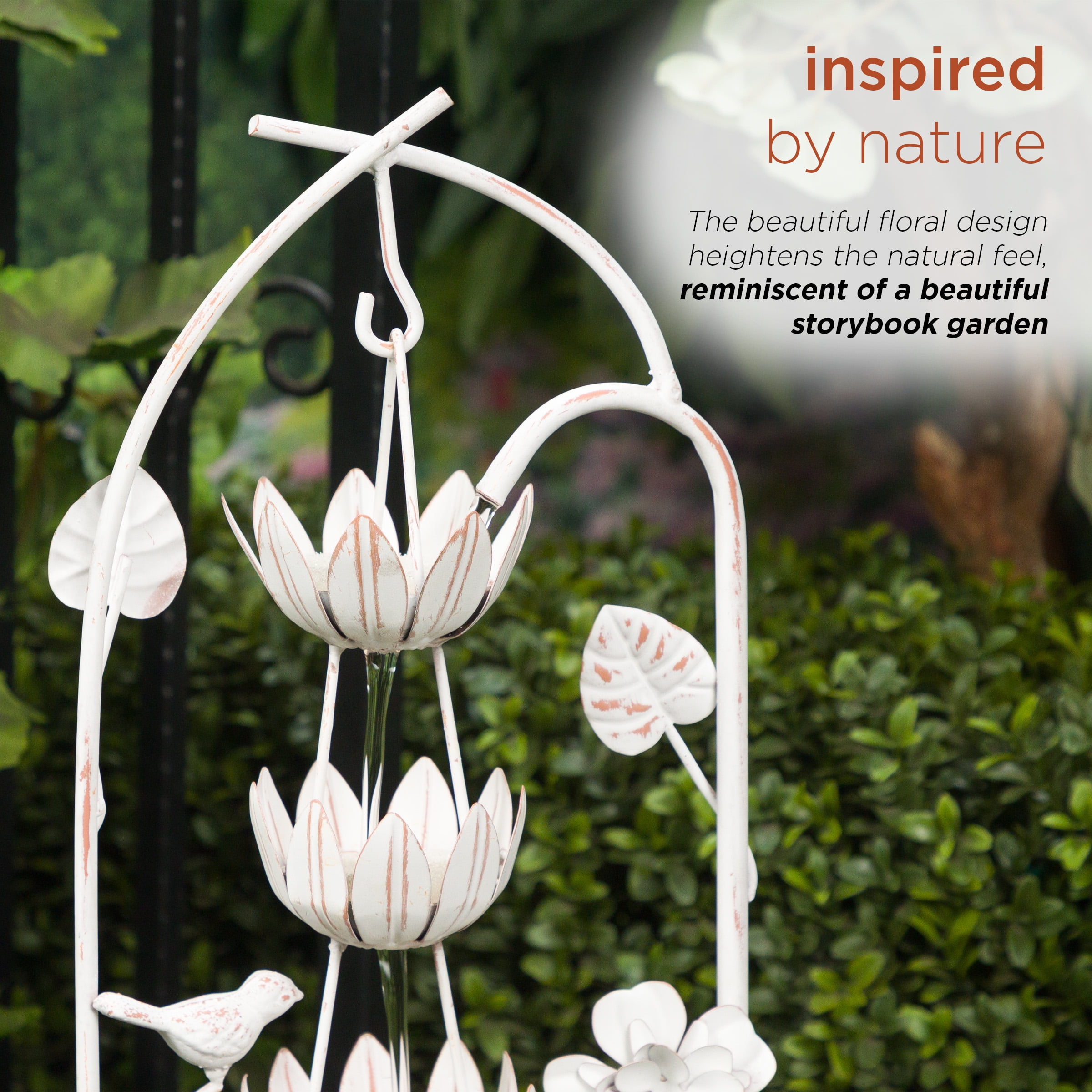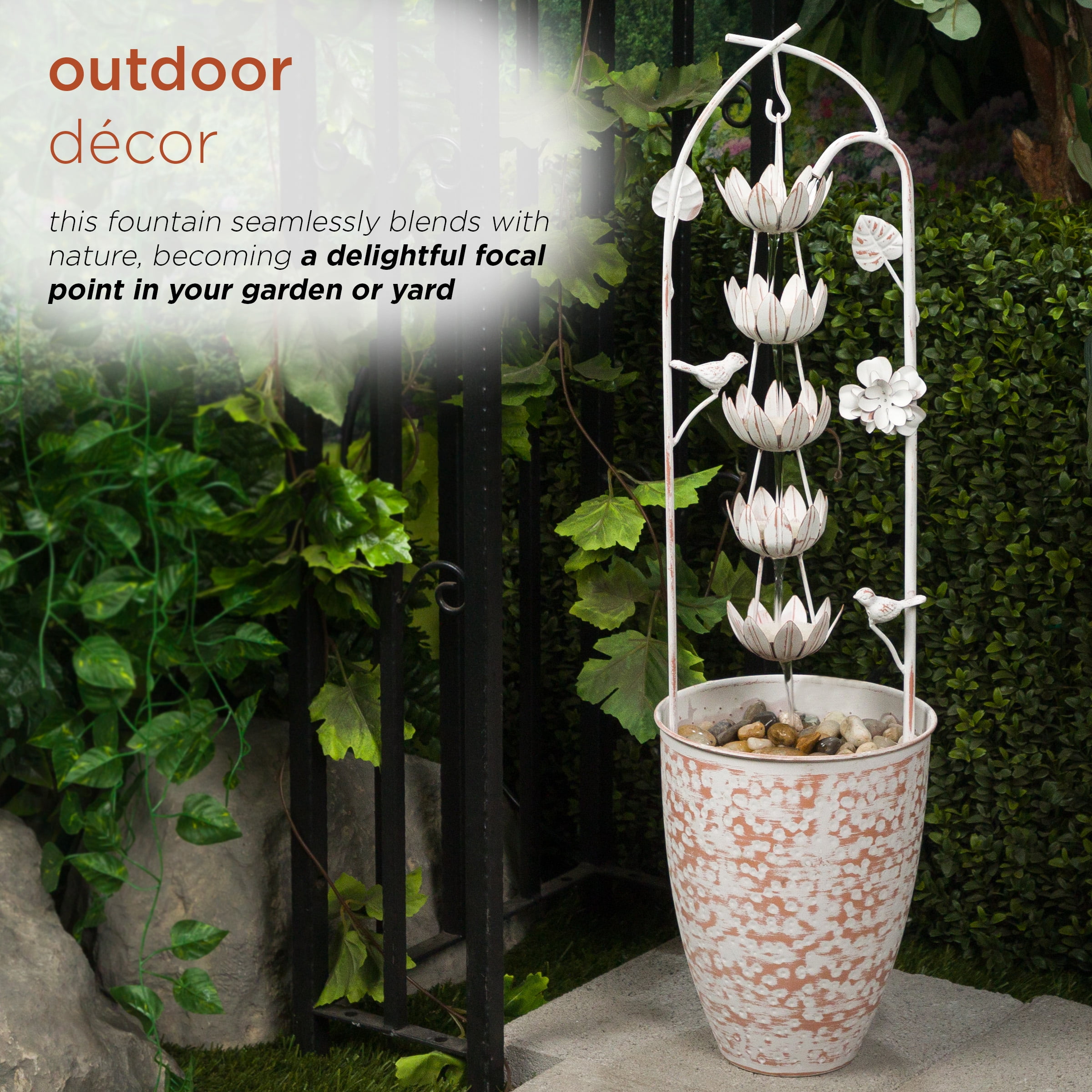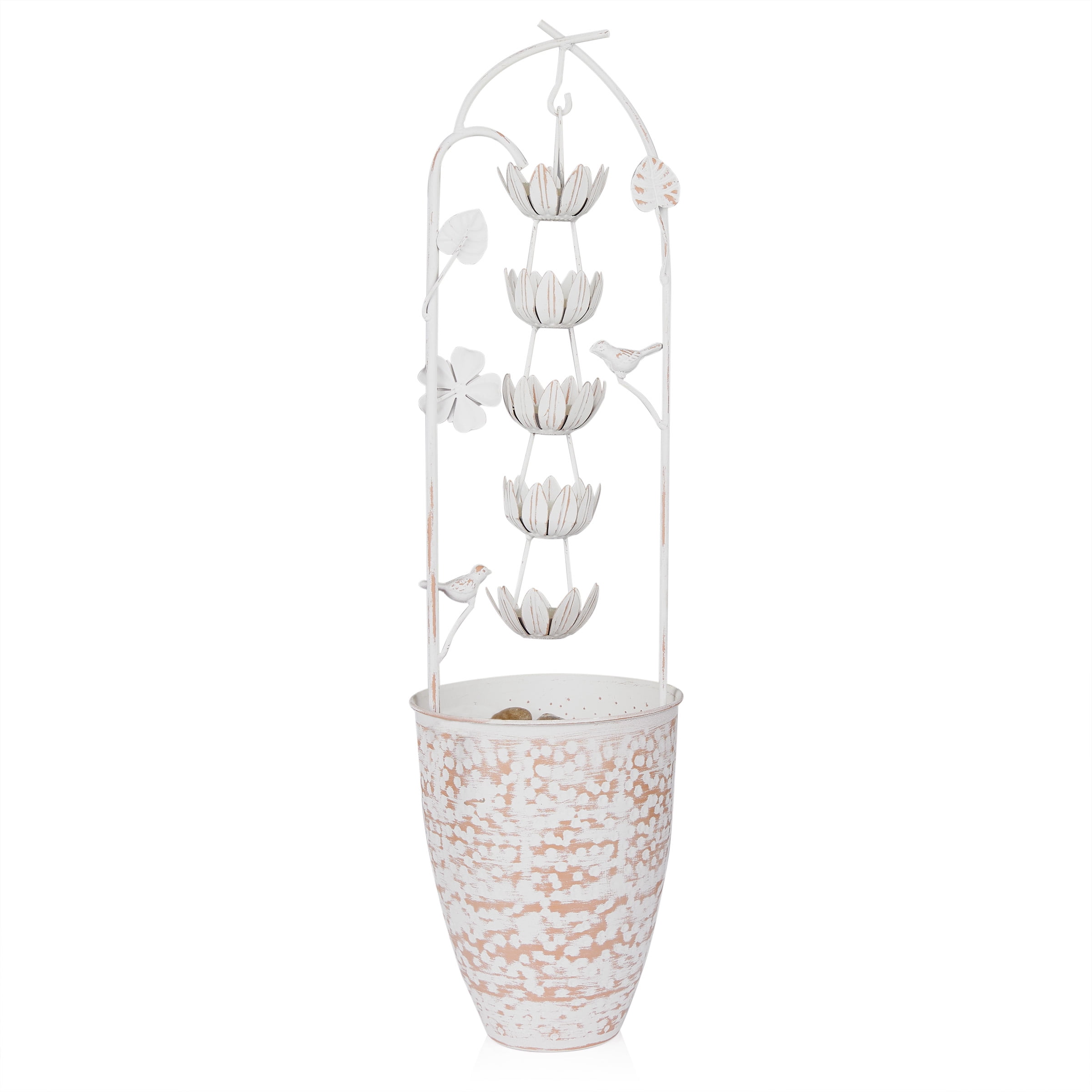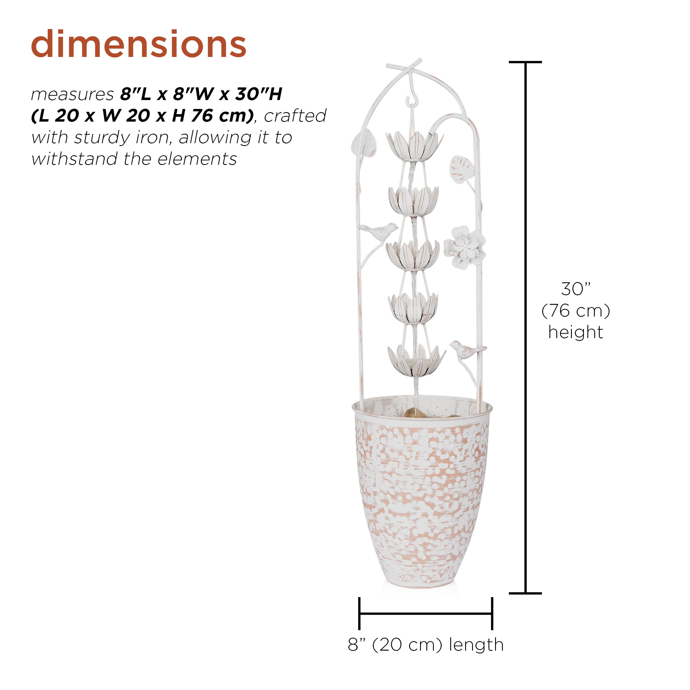 Rustic Elegance: Enhance your outdoor oasis with the Metal White Rustic Fountain featuring a charming flower design. This fountain adds a touch of rustic elegance to your garden or patio. Perfect Dimensions: Measuring 8″L x 8″W x 30″H, this fountain is a versatile addition, providing both visual appeal and the soothing sounds of cascading water. Ideal for creating a tranquil atmosphere in your outdoor space. Durable Iron Construction: Crafted from sturdy iron, this fountain is built to withstand outdoor elements, ensuring durability and preserving its rustic charm even in changing weather conditions.