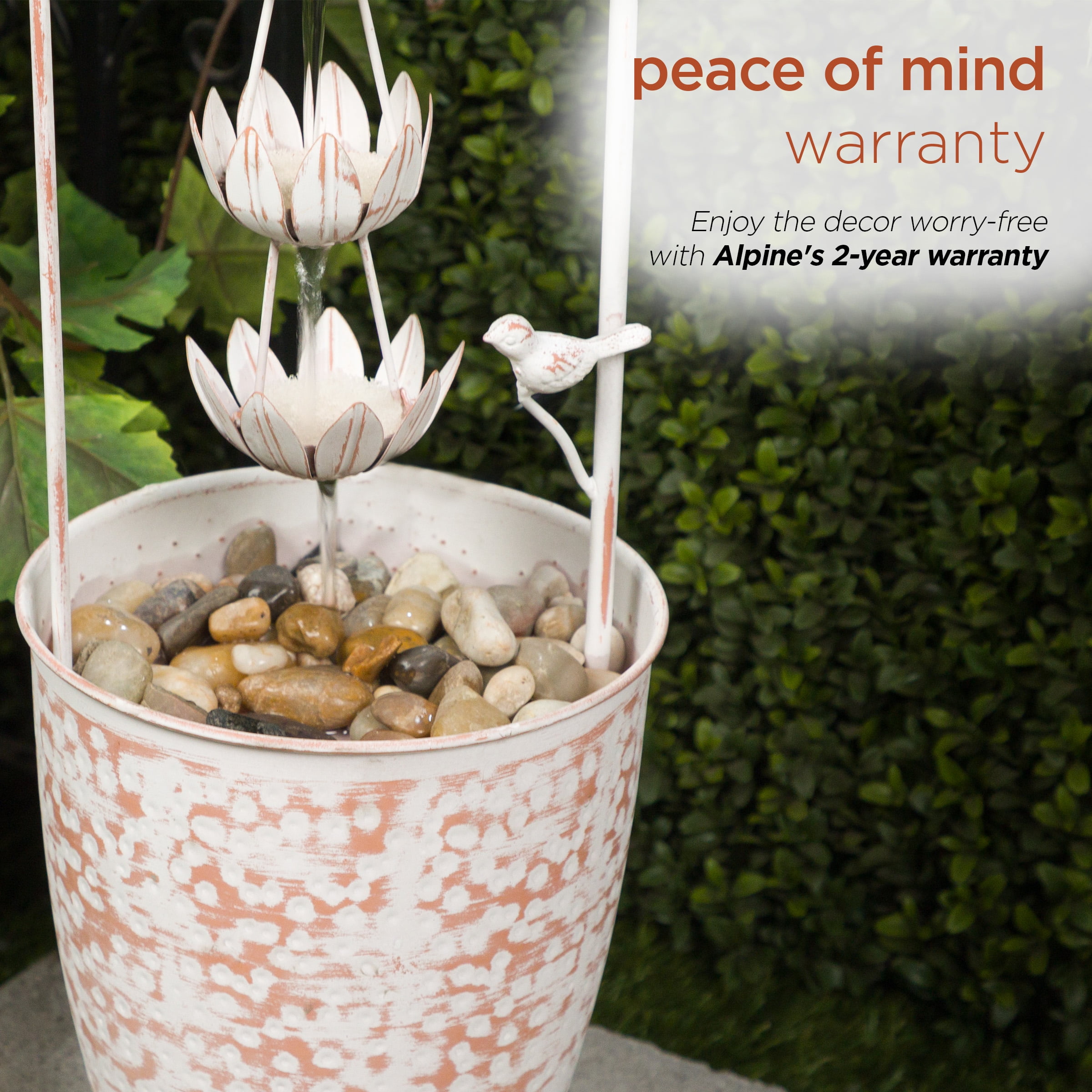 Transform your outdoor space into a serene retreat with the Alpine Corporation Metal White Rustic Fountain, adorned with a delicate flower. Measuring 8″L x 8″W x 30″H and crafted from durable iron, this fountain is a perfect blend of rustic charm and timeless elegance. The distressed white finish adds a touch of vintage allure, creating a visually appealing centerpiece for your garden or patio. Thoughtfully designed, this compact fountain enhances your outdoor decor without overwhelming the space. The gentle flow of water from the flower accentuates the rustic aesthetic, bringing a sense of tranquility to your surroundings. Designed for outdoor use only, this fountain becomes the focal point of your garden oasis. With Alpine’s 2-year warranty, you can Shop With Assurance and Buy With Confidence.