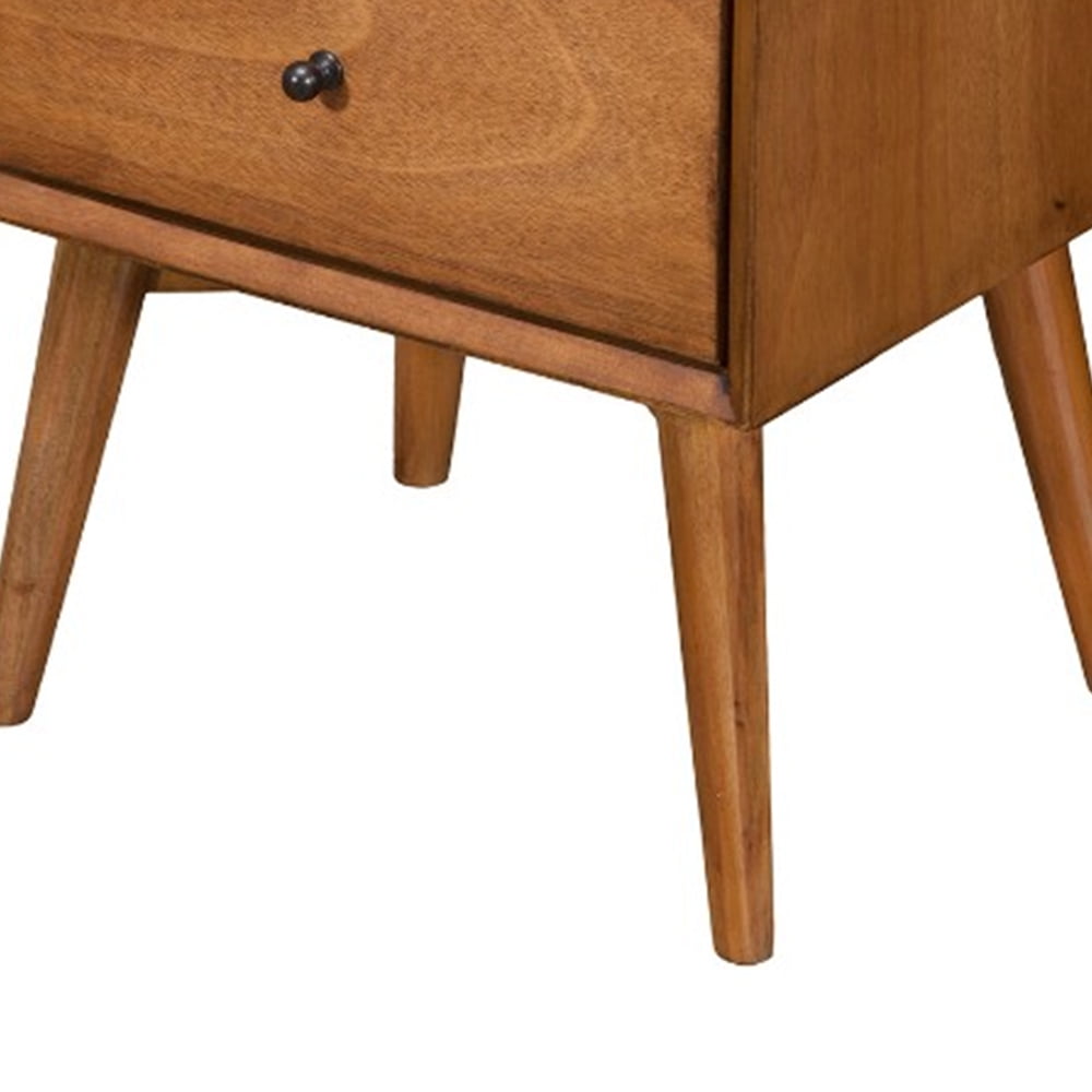 Mid-century modern nightstand offers a simplistic, vintage chic touch to any room English dovetail drawer with ball-bearing drawer glides and sturdy mahogany construction provides lasting durability No assembly provides immediate opportunity to enjoy your new furniture right out of the box Felt-lined top nightstand drawer delivers safe spacious room for your valuables Finish radiates clean, simplistic energy for anywhere in the home Material: Mahagony solids and Okoume veneer Color: Acorn Dimensions (L x W x H): 15 x 18 x 26 inches Weight: 33.8 pounds Manufacturer warranty: 1-year warranty