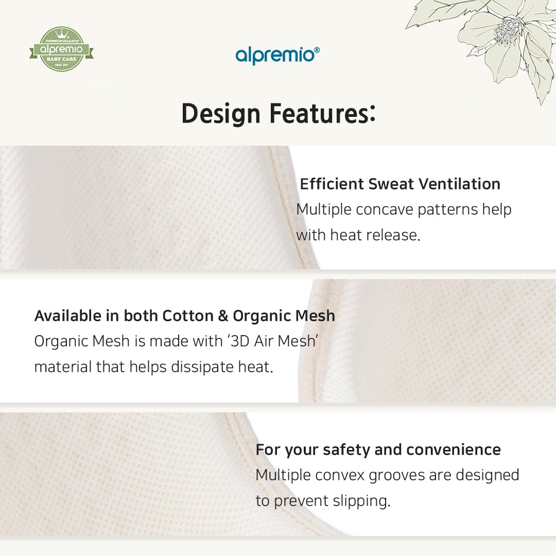 Alpremio Mesh & Organic Baby Feeding Care Seat For Baby’s Proper Posture: Alpremio’s advanced functional design ensures perfect spinal alignment for your baby. It positions the baby’s head, shoulders, and hips ideally for feeding, minimizing reflux and discomfort while promoting better digestion Lightweight & Stable: Alpremio is a sturdy and lightweight champion! It helps you maintain a correct feeding posture, reducing back fatigue and wrist pain Shapes a Beautiful Head: Alpremio’s concave headrest and gentle neck support ensure your baby’s head rests comfortably, promoting healthy skull development Please be aware that you may occasionally find small, dark specks on your Alpremio feeding care seat, including the back. These are a natural occurrence in organic cotton and are not a defect. They are typically remnants of cotton leaves or flower bracts that may have been present during the harvesting process. Rest assured that these specks are harmless and do not pose any risk to your baby. Details Made in Korea Outer Material: 100% Cotton Inner Material: HDPE (High Density Polyethylene) Weight: approx. 200g Size: 570mm x 210mm x 190mm Care For cleaning, dampen a sponge with a mixture of water and neutral detergent (baby detergent), wipe the stained area, and let it air dry. Do not use washing machine Avoid Direct sunlight Safety Instruction This product is not designed to prevent falls. Please avoid tilting it when a baby is seated. Avoid placing the seat in strollers or car seats Avoid direct heat Brand Outline Born from the heart of Korea, Alpremio Baby Feeding Care Seat embodies meticulous design intertwined with the essence of parental care. Our vision transcends beyond the act of feeding. We envision every mealtime as a precious moment of bonding between a parent and their baby. In recognizing the challenges many face in handling infants, we’ve meticulously designed the Seat to ensure even those unfamiliar with baby care can use it with ease and confidence. Our commitment is to make every user experience simple, intuitive, and most importantly, safe for both parent and child. Every child’s safety is a priority that’s close to our heart. The fragility of newborn life is something we deeply respect, ensuring our seat provides both safety and the proper feeding posture for the child. This not only guarantees the child’s well-being but also promotes a healthy feeding routine. We place great emphasis on ensuring that mothers can use our product with ease. The Alpremio Seat is meticulously crafted to ensure both the child’s safety and the mother’s convenience. Its design takes into account the importance of aiding mothers in maintaining a proper nursing posture, minimizing discomfort during extended use. Join us in this journey of parenthood. With Alpremio by your side, every feeding moment becomes a cherished memory.