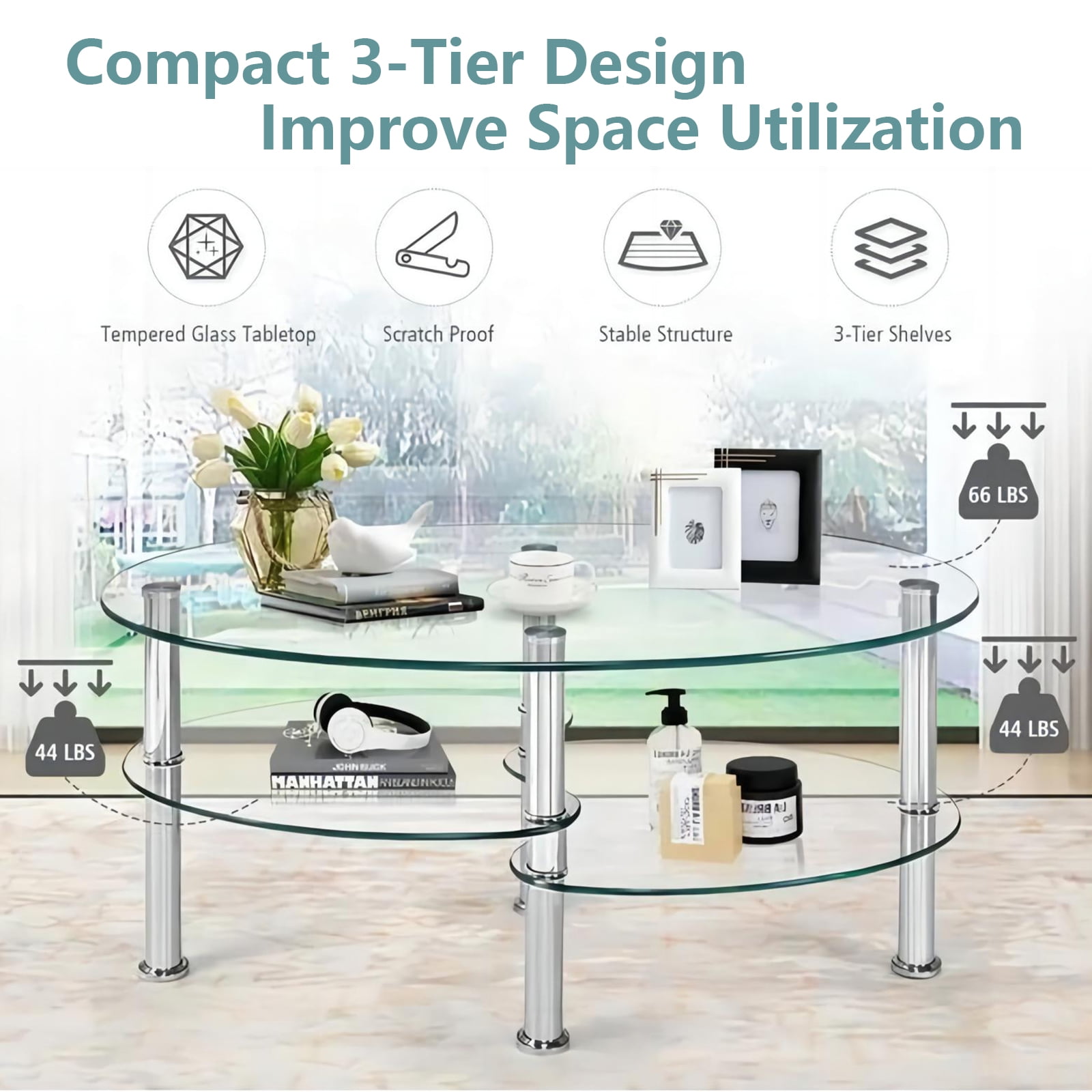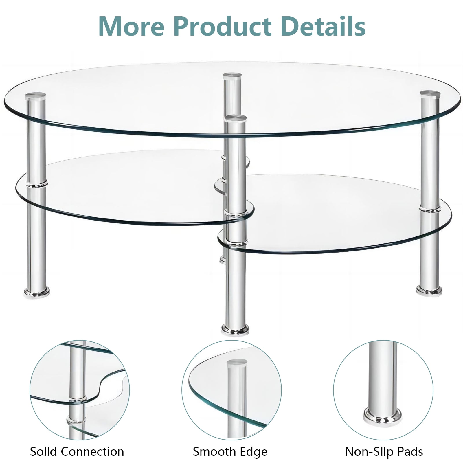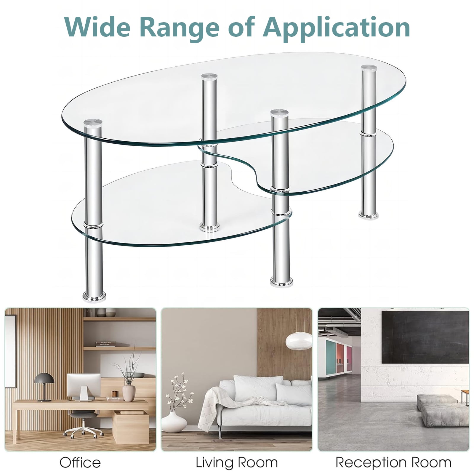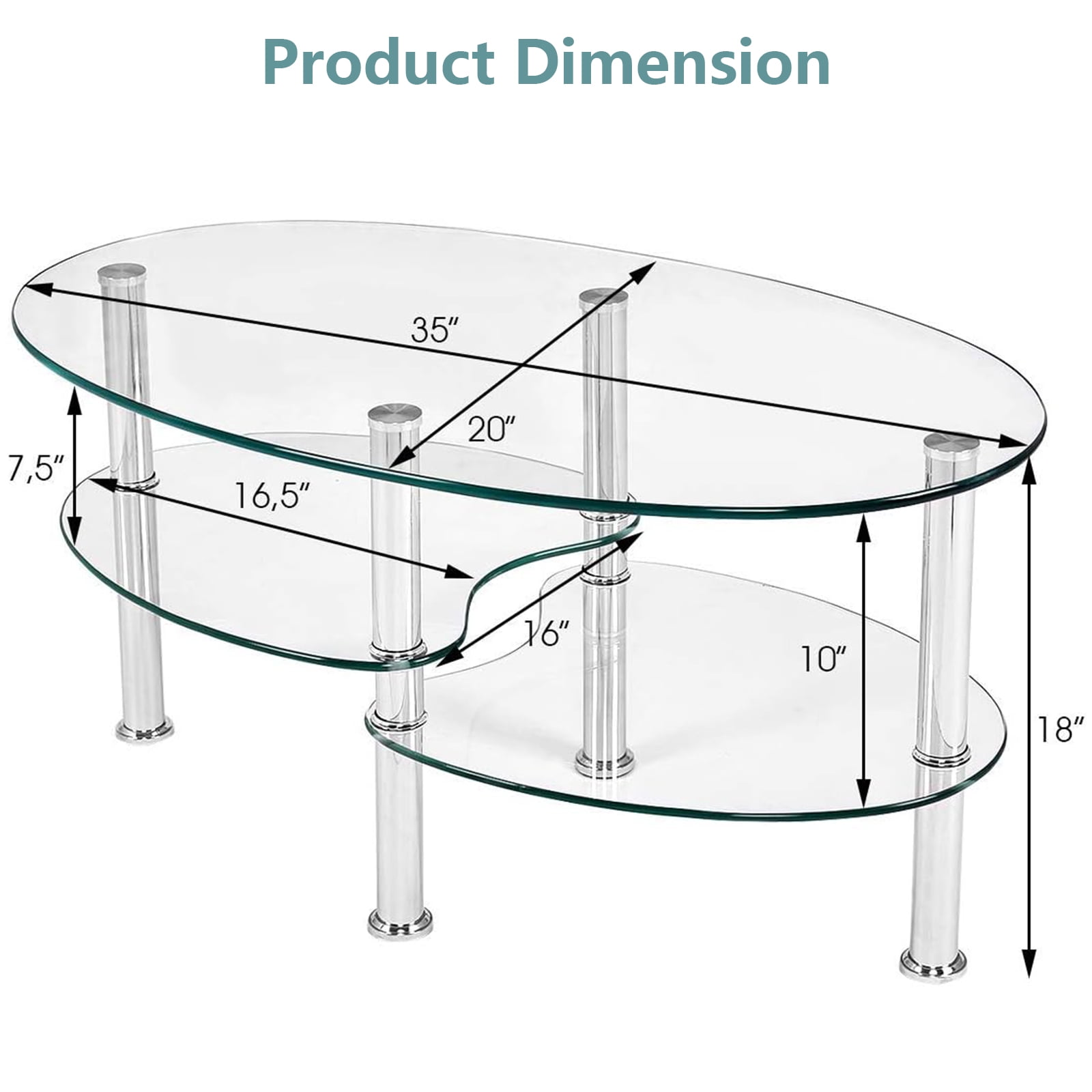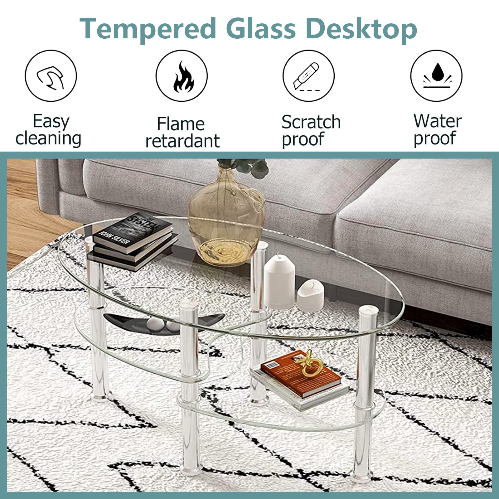 This is our elegant coffee table, which is ideal for morning coffee, leisure tea or afternoon tea. Made of tempered glass, this coffee table is strong and durable and Looks simple and stylish. The smooth and non-angular design of this table provides users more reliable and safe experience. It features 2 bottom shelves, providing more storage space for magazines, books, remote controls or other decorations. The clean and bright design combined with the harmonious proportions will create a calm and relaxing ambience, perfect to unwind your mind and body from a hard day at work. Do not hesitate to add it to your cart! Feature Strong and durable tempered glass, providing years of use Smooth and non-angular oval design for more reliable and safe use experience Features 2 bottom shelves, offering more storage space Clean, bright and elegant style Easy to clean and assemble Perfect for living room Assembly required Specification Material:Tempered Glass+ Metal Overall dimension:35.5”x 20” x18” (LxWxH) Dimension of the two bottom shelf:16.5”Lx 16”W Weight capacity of the top:90Lbs Weight capacity of the bottom shelf:45Lbs Package includes:1 x Coffee Table Strong and durable tempered glass, providing years of use Smooth and non-angular oval design for more reliable and safe use experience Features 2 bottom shelves, offering more storage space Clean, bright and elegant style Perfect for living room