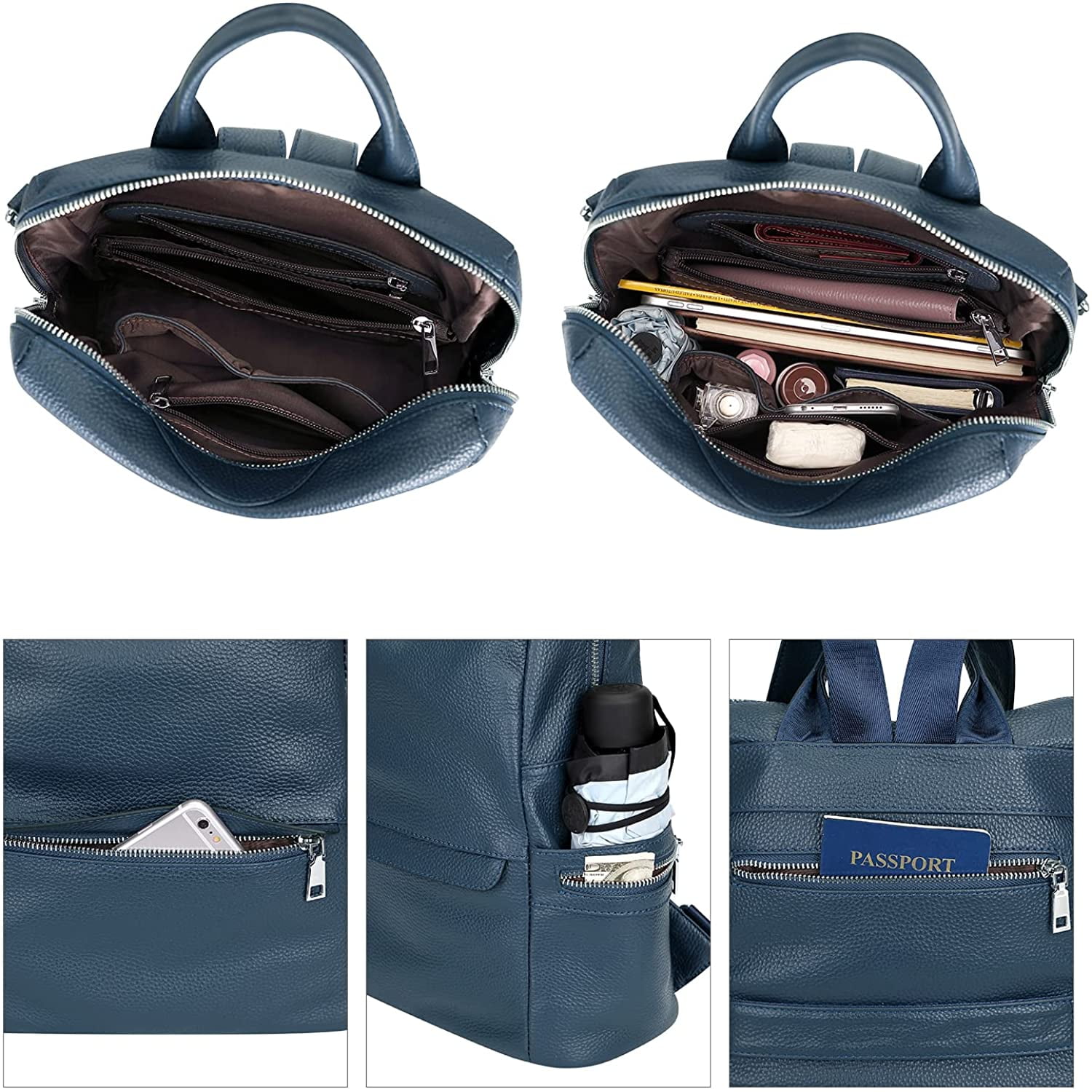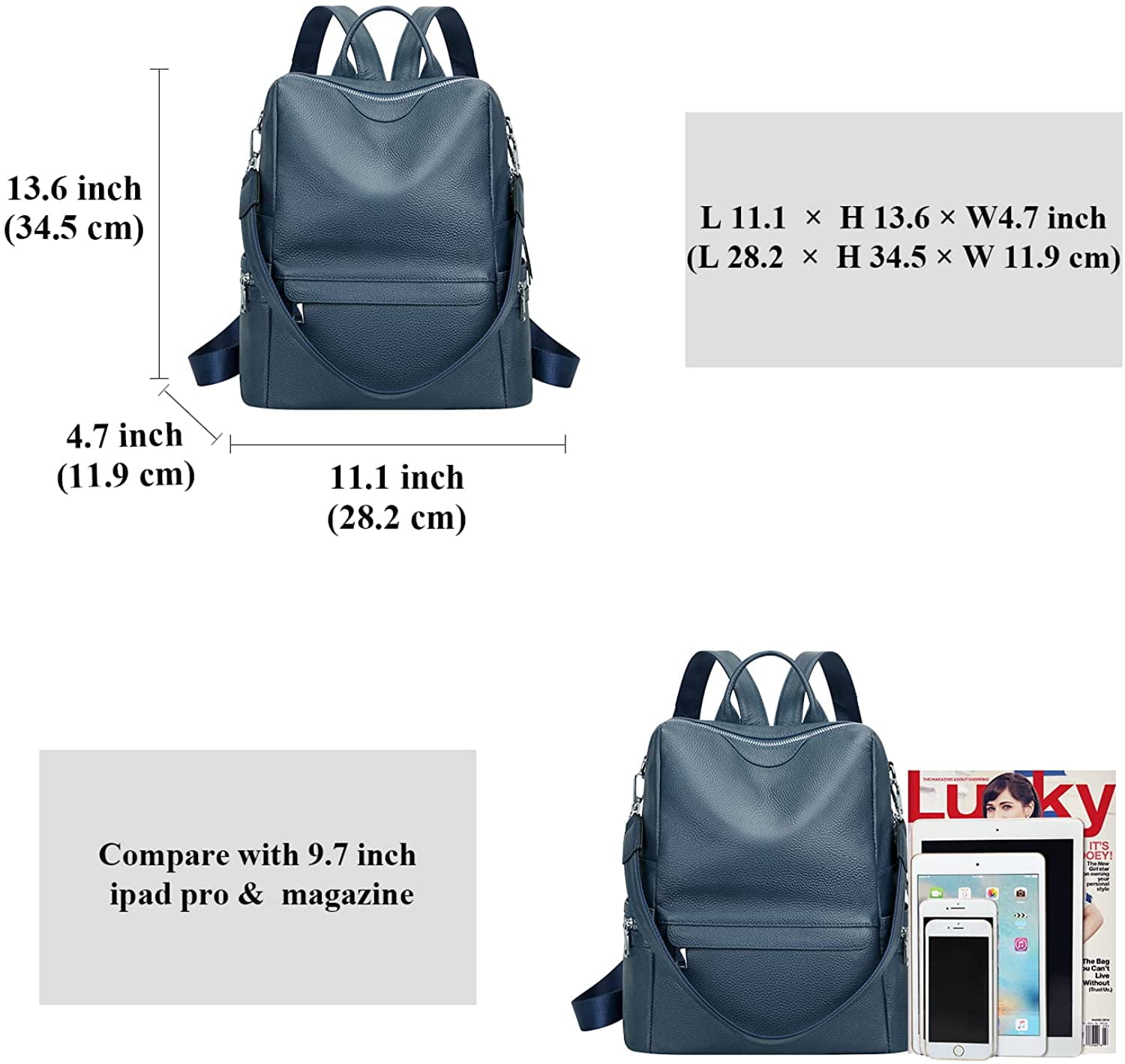 [MATERIALS] — This backpack is made of durable and wear-resistant full-grain cowhide (soft genuine leather), chocolate brown polyester lining, and silver chunky hardware. [STRUCTURE & CAPACITY] — This backpack has 1 small zipper pocket and 1 main zipper pocket on the front and 2 open pockets and zipper pockets on the side. 1 deep zip pocket and 1 strap on the back for hanging on luggage. Inside there are 3 zipper pockets and 2 small open pockets, large capacity, fit 12.9 inch iPad, and multiple compartments to organize your belongings. [SIZE & WEIGHT] — L 28 x W 12.7 x H 31.75 cm (L 11 x W 5 x H 12.5 inch); The handle drop height: 8.4 cm (3.3 inches). Detachable shoulder strap length: 70 cm (27.6 inches). Weight: 0.77 kg (1.70 pounds). [MULTI PURPOSE DESIGN] — This backpack could be carried as a shoulder bag. Perfect for working, shopping, daily life, traveling, college and business. Also a great gift to your friends, family or yourself. [WARM TIPS] — Due to the light and screen setting difference, the item’s color may be slightly different from the pictures. The shoulder straps are a combination of leather and webbing for comfort and weight reduction.
