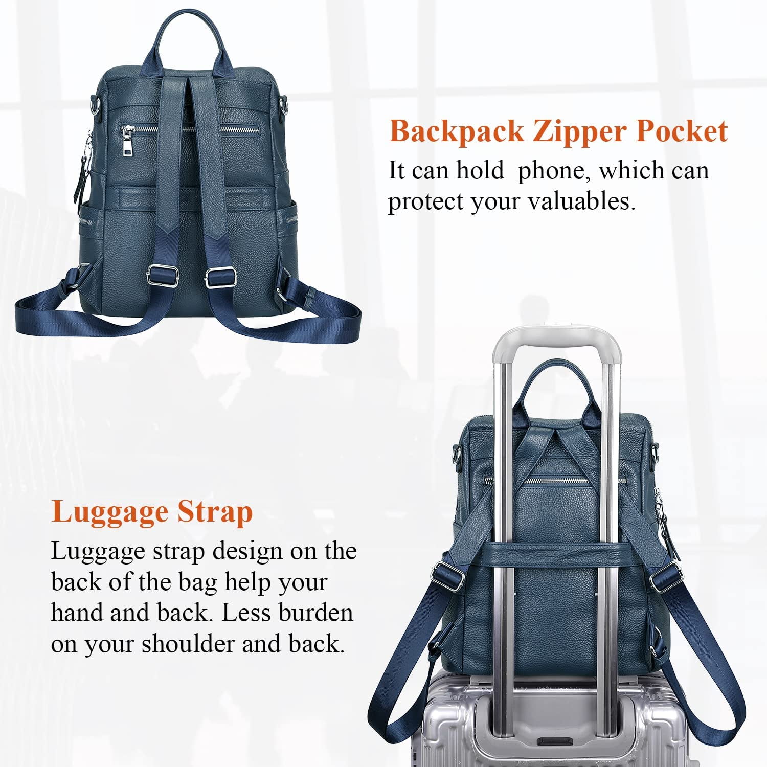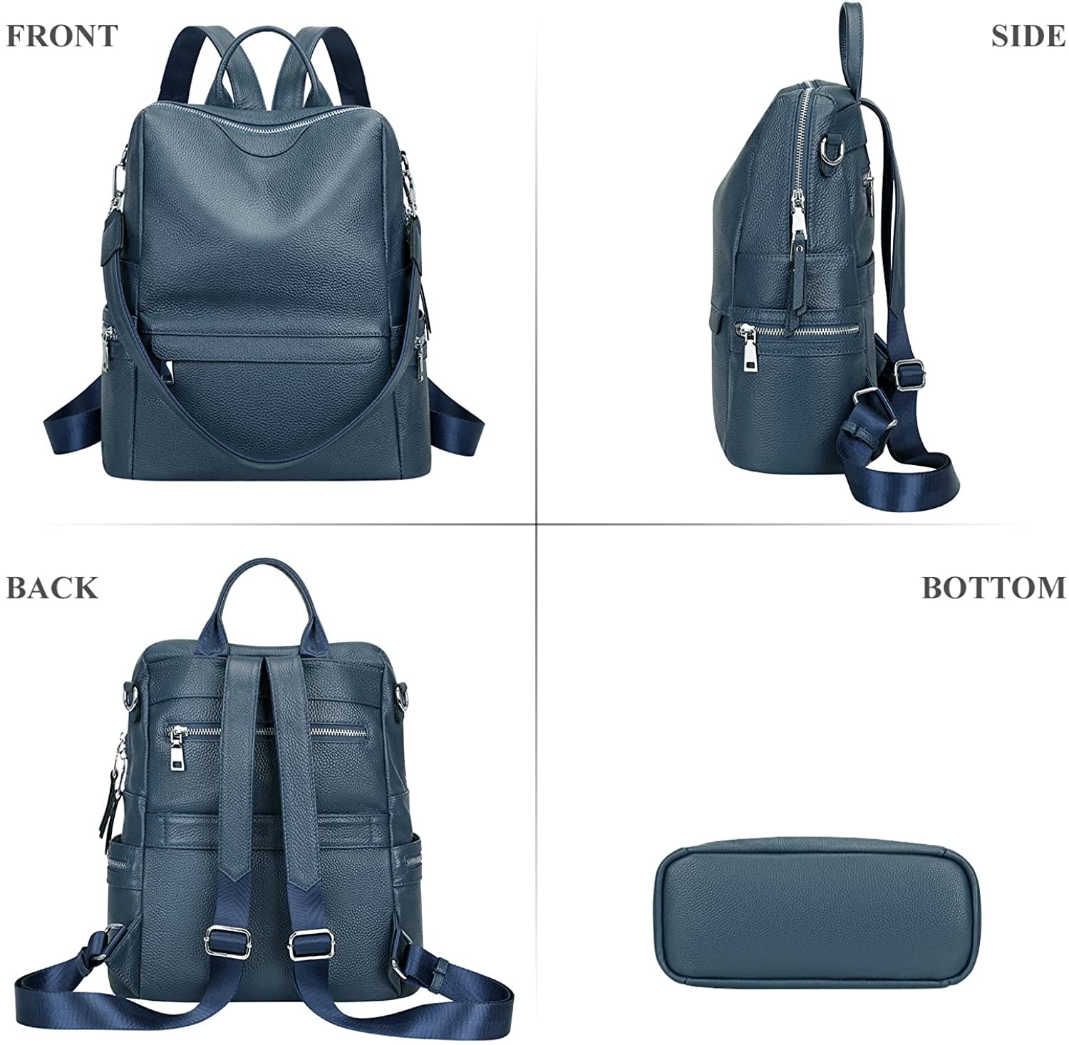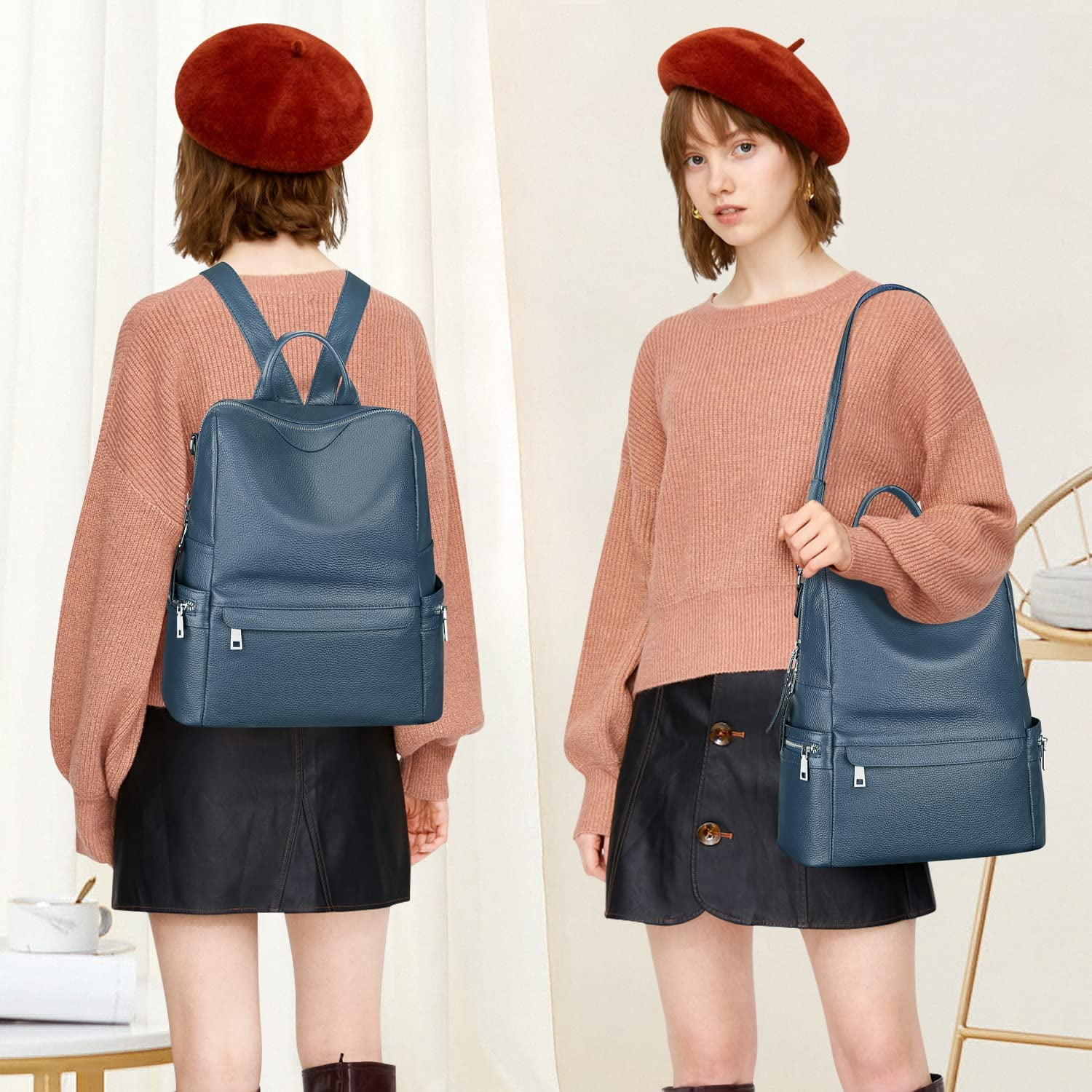 Female Genuine Leather Backpack Bag Shoulder Purse, which is casual & fashionable style. This bag is made of high grade cowhide with polyester lining, durable for use (It is a little heavy since it is made of genuine leather). Available in 4 colors: Black, Wine Red, Brown, Indigo Blue, Beige/Brown, suitable for teens and adults (girls or ladies). You can carry this purse for city travel, college, shopping, dating, weekend trips, everyday use, or other casual occasions. Max fit 12.9-inch iPad, 13-inch MacBook, cellphone, magazine, cosmetics, etc.