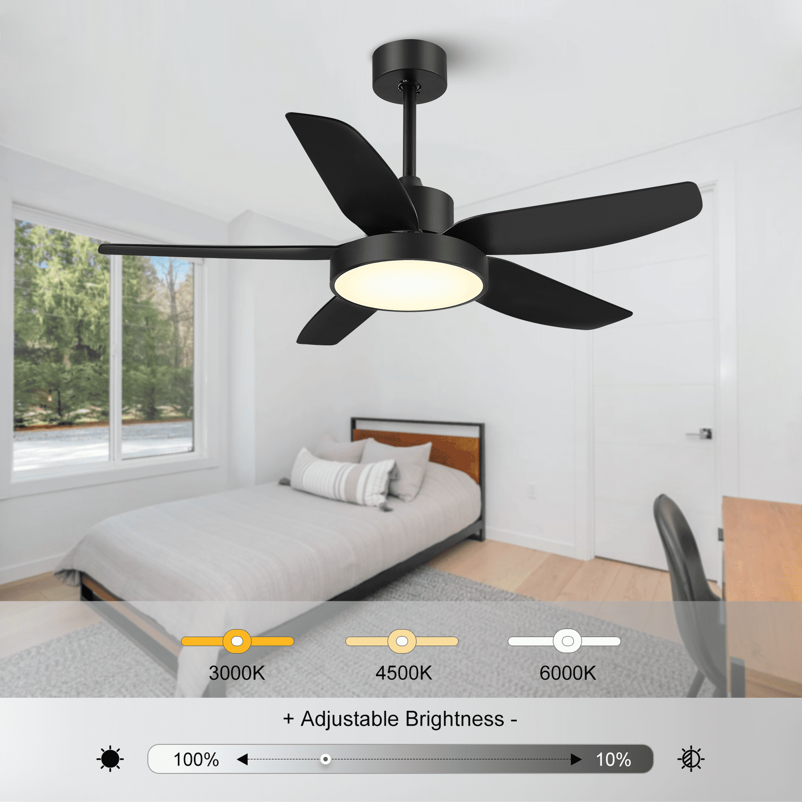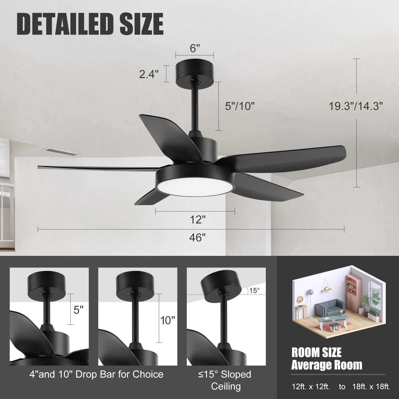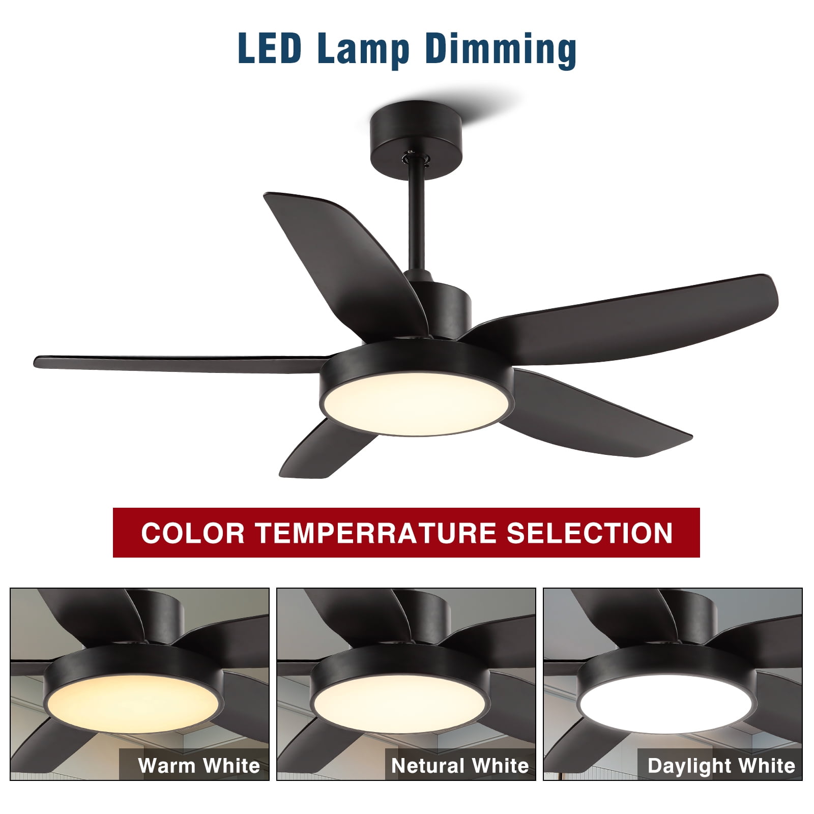 【Modern Designed Black Ceiling Fan, Extra Large LED Panel and High Quality】: This 46 inch modern design ceiling offers beautiful and high-quality finish options to fit any design style bedroom, living room, kitchen and other place with the ceiling; With the extra-large LED panel, this ceiling fan also provide more light source to you; 5 matte black ABS blades are easy to install and clean; Built-in silent inverter motor, no noise and very Energy saving. 【Black Ceiling Fan With 6 Wind Speeds, 3 LED Light Colors and Timer】: Make your life easier with a remote on hand, so no need to wake up to pull a chain at night. With the functional remote, you can adjust the fan speed form 1 to 6. Equipped with 3 color adjustable LED light, you can change the light color between cool white(6000K), natural white(4000K) and warm white(3000K) through the control. You also can set the 1/2/4 hour sleep timer. 【Ultra Quiet, Energy Saving and Powerful Ceiling Fan】: This 5 blades black ceiling fan equipped with copper wired DC motor which let you can hardly hear any sound while it is working and creating a comfortable and silent environment for sleeping, dining, chatting, reading or working. Not only this, while provide 5900 CFM air, its energy usage is only 35 W with lights and airflow efficiency is 140 CFM/W. 【Reversible DC Motor Ceiling Fan】: With reversible function DC motor, you can turn this black ceiling fan run clockwise to cool down your room during summer. And in the winter, you can press the reversible button on remote control to let the ceiling fan run counterclockwise as result this fan will rotate warm air and cutting down the energy costs. 【Easy Installation 】: Come with two down-rods (5” and 10”), you can choose the suitable length for your room. With the instruction and the DIY video, you can easily install it in about 45 minutes.