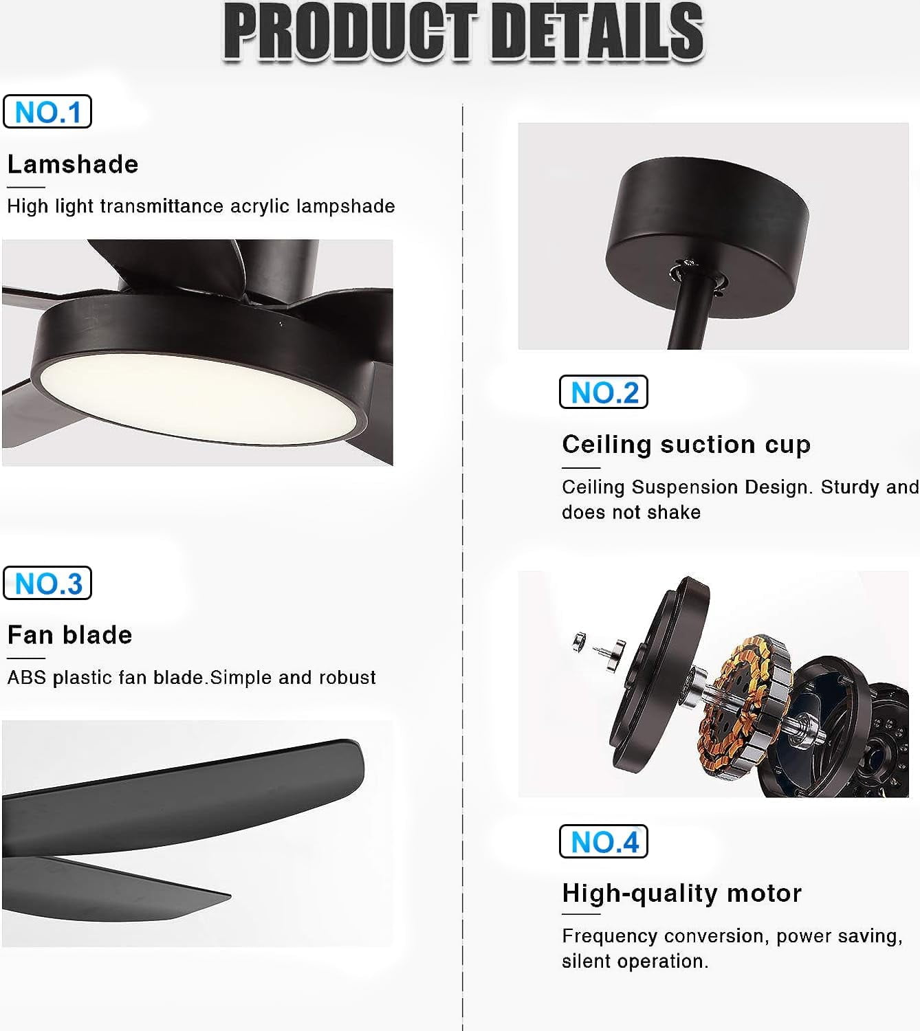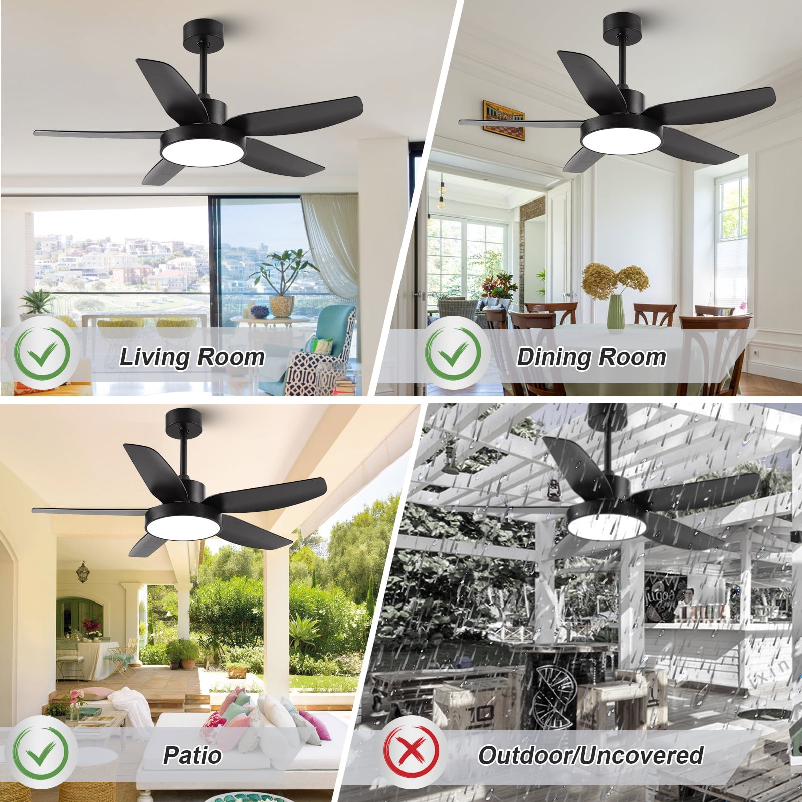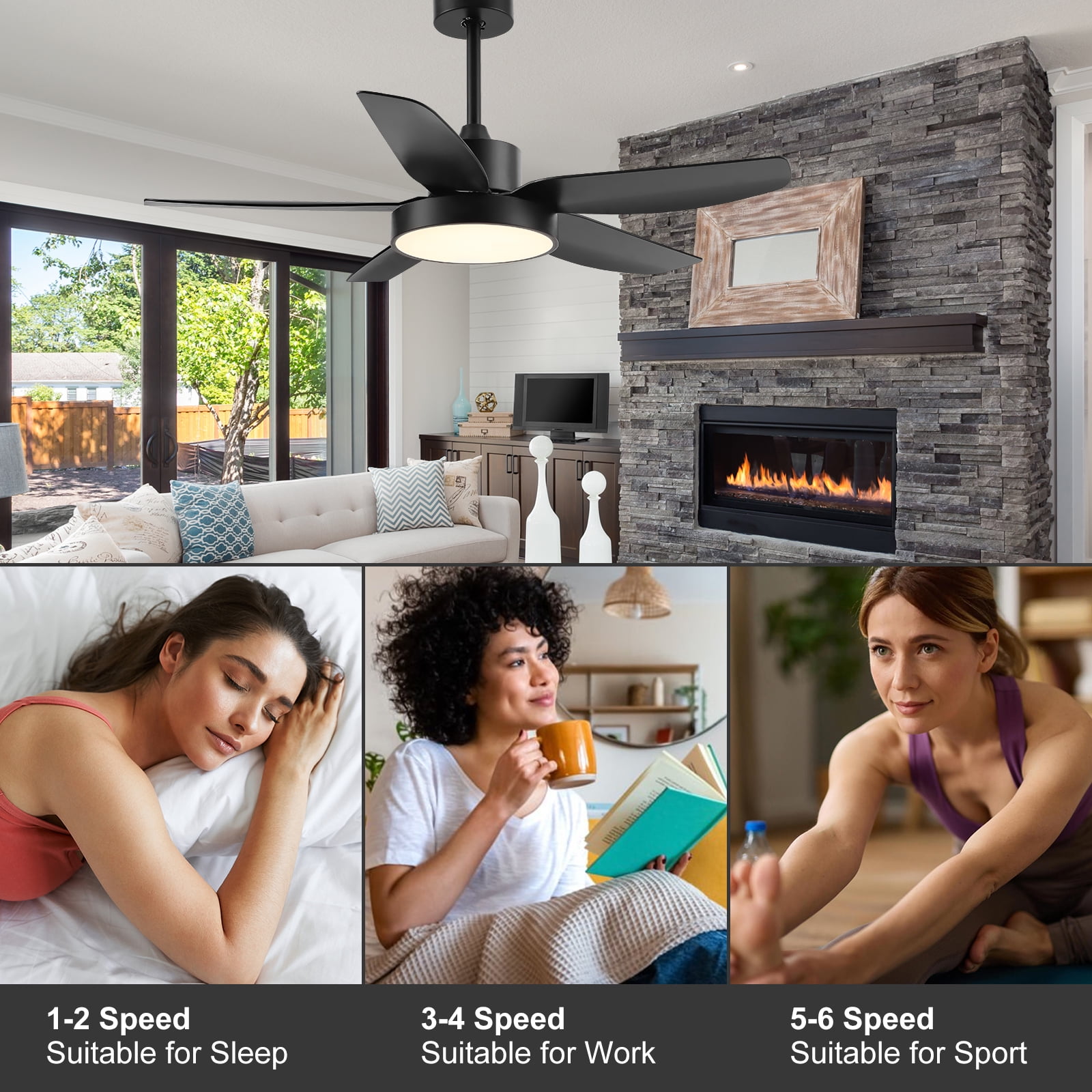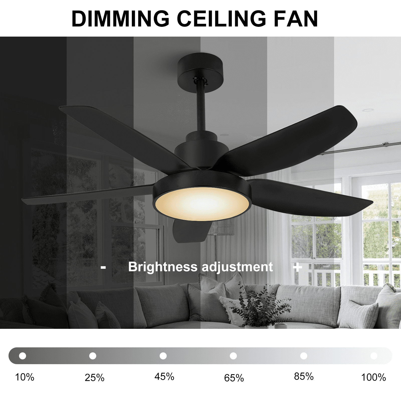 【Modern Designed Black Ceiling Fan, Extra Large LED Panel and High Quality】: This 46 inch modern design ceiling offers beautiful and high-quality finish options to fit any design style bedroom, living room, kitchen and other place with the ceiling; With the extra-large LED panel, this ceiling fan also provide more light source to you; 5 matte black ABS blades are easy to install and clean; Built-in silent inverter motor, no noise and very Energy saving. 【Black Ceiling Fan With 6 Wind Speeds, 3 LED Light Colors and Timer】: Make your life easier with a remote on hand, so no need to wake up to pull a chain at night. With the functional remote, you can adjust the fan speed form 1 to 6. Equipped with 3 color adjustable LED light, you can change the light color between cool white(6000K), natural white(4000K) and warm white(3000K) through the control. You also can set the 1/2/4 hour sleep timer. 【Ultra Quiet, Energy Saving and Powerful Ceiling Fan】: This 5 blades black ceiling fan equipped with copper wired DC motor which let you can hardly hear any sound while it is working and creating a comfortable and silent environment for sleeping, dining, chatting, reading or working. Not only this, while provide 5900 CFM air, its energy usage is only 35 W with lights and airflow efficiency is 140 CFM/W. 【Reversible DC Motor Ceiling Fan】: With reversible function DC motor, you can turn this black ceiling fan run clockwise to cool down your room during summer. And in the winter, you can press the reversible button on remote control to let the ceiling fan run counterclockwise as result this fan will rotate warm air and cutting down the energy costs. 【Easy Installation 】: Come with two down-rods (5” and 10”), you can choose the suitable length for your room. With the instruction and the DIY video, you can easily install it in about 45 minutes.